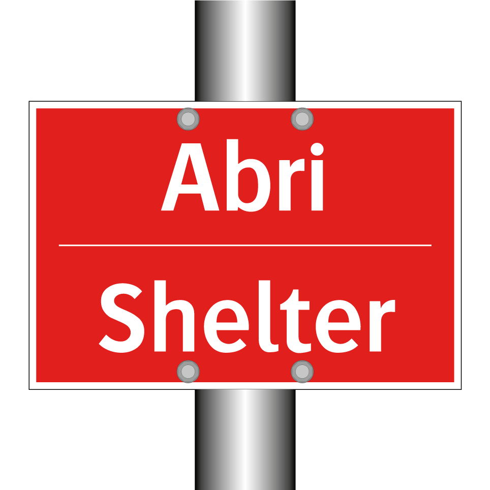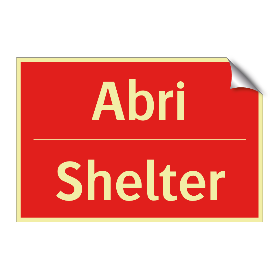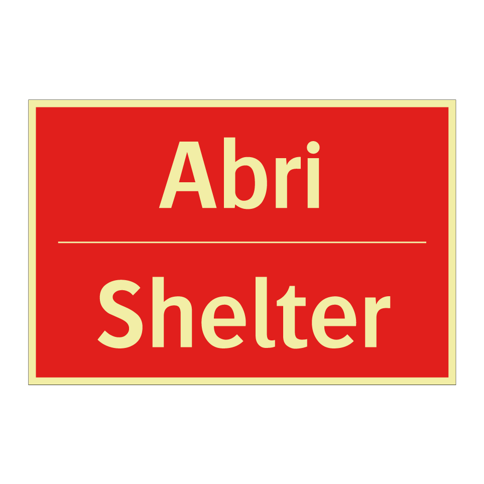 Panneau de signalisation incendie bilingue avec texte en français : "Abri", et en anglais : "Shelter"