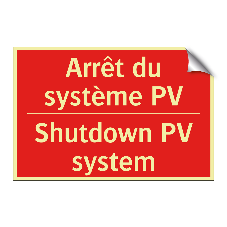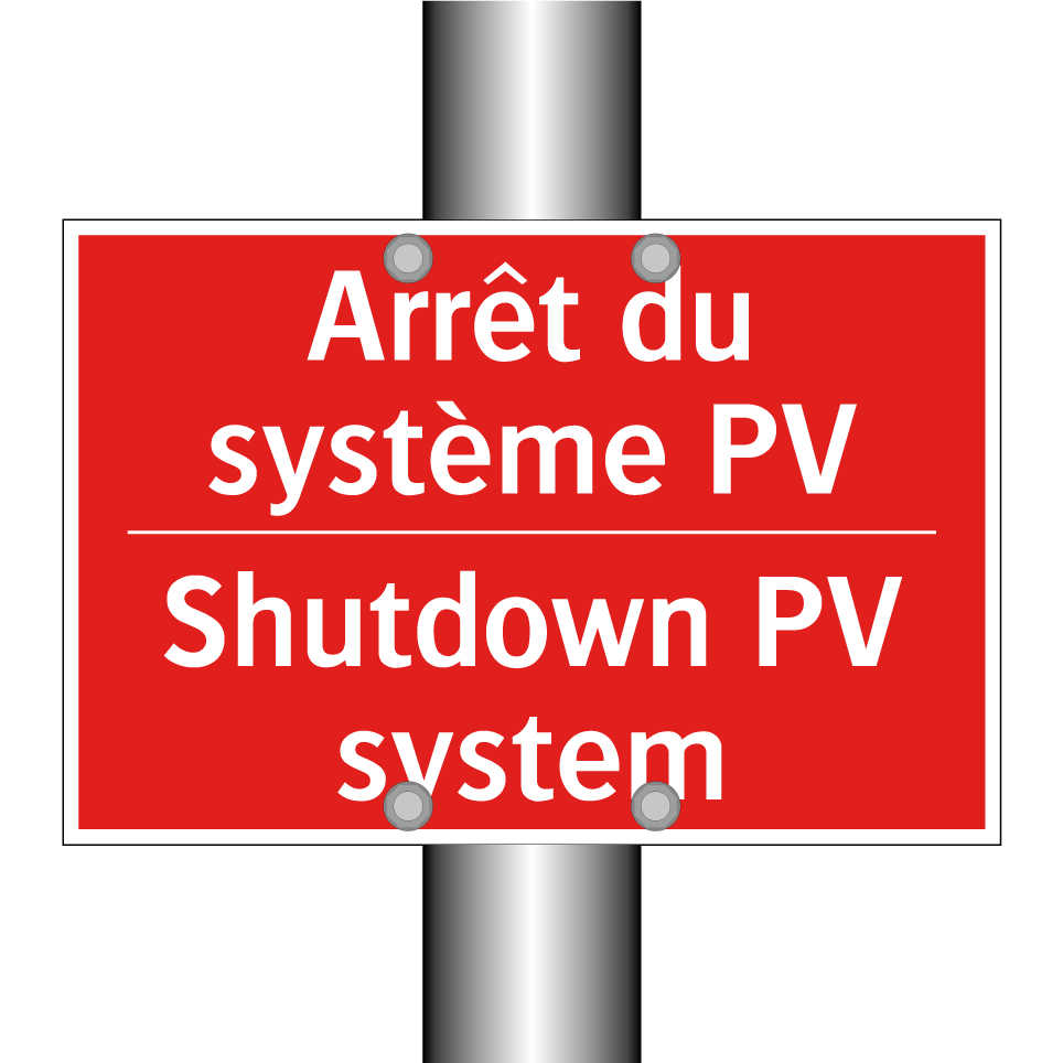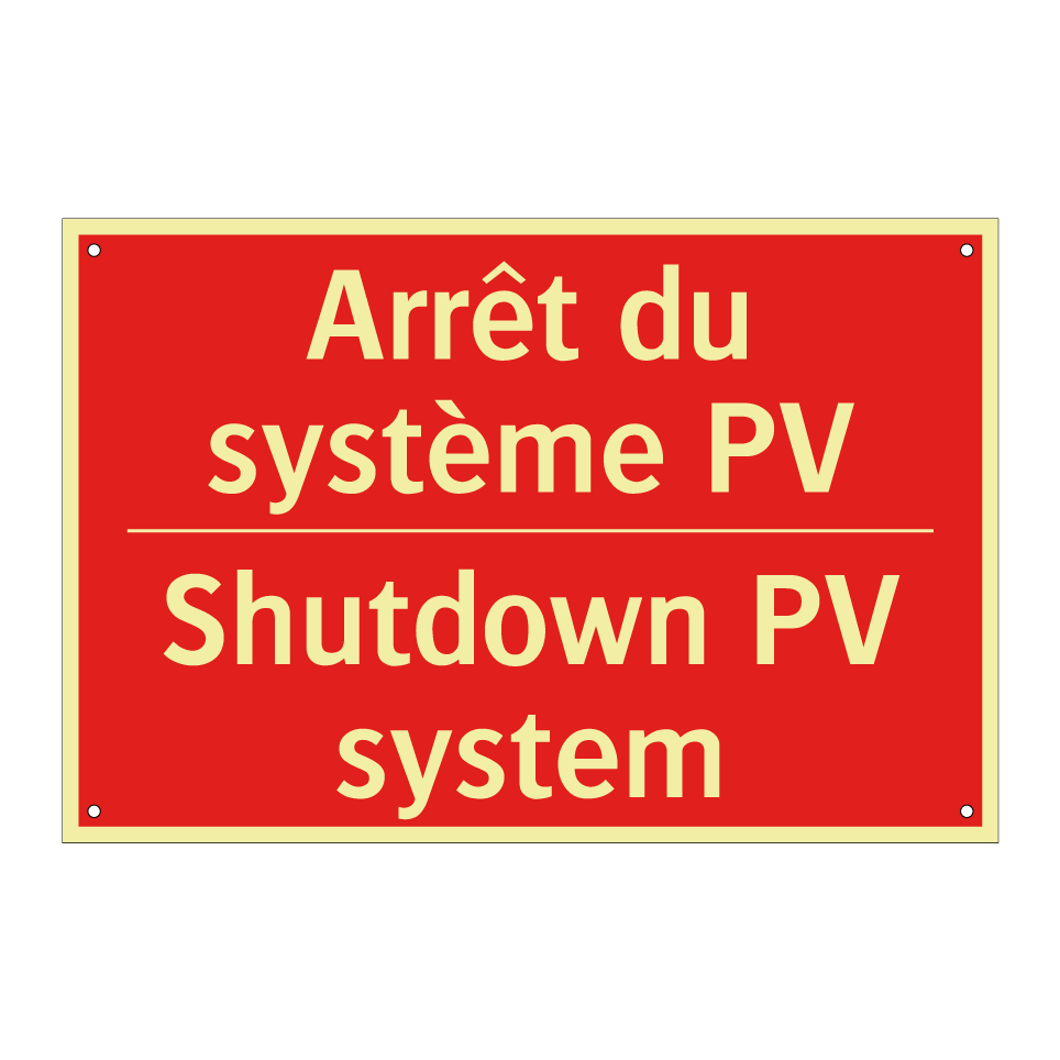 Panneau de signalisation incendie bilingue avec texte en français : "Arrêt du système PV", et en anglais : "Shutdown PV system"