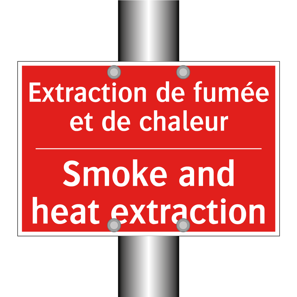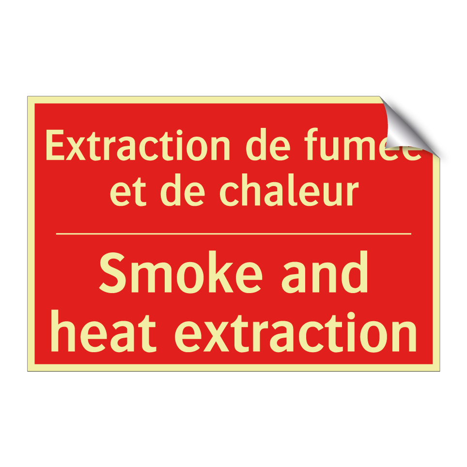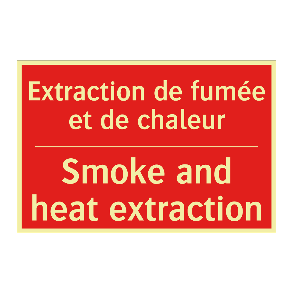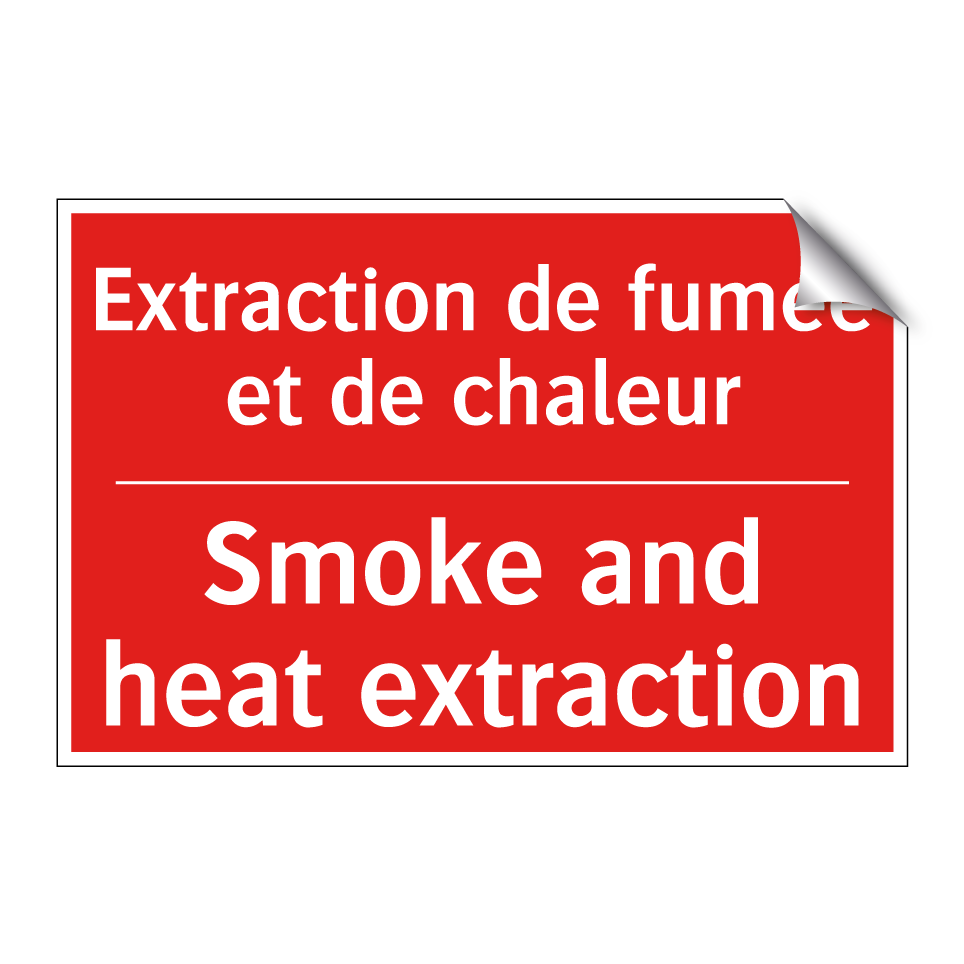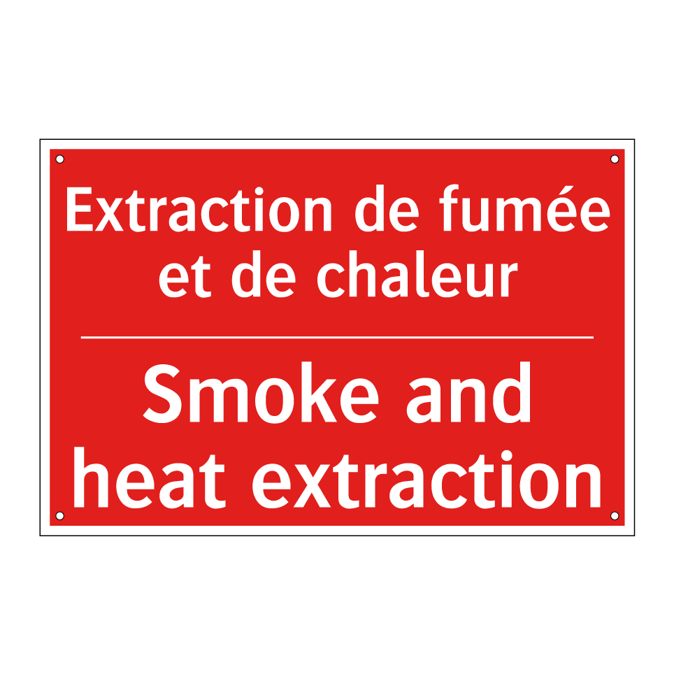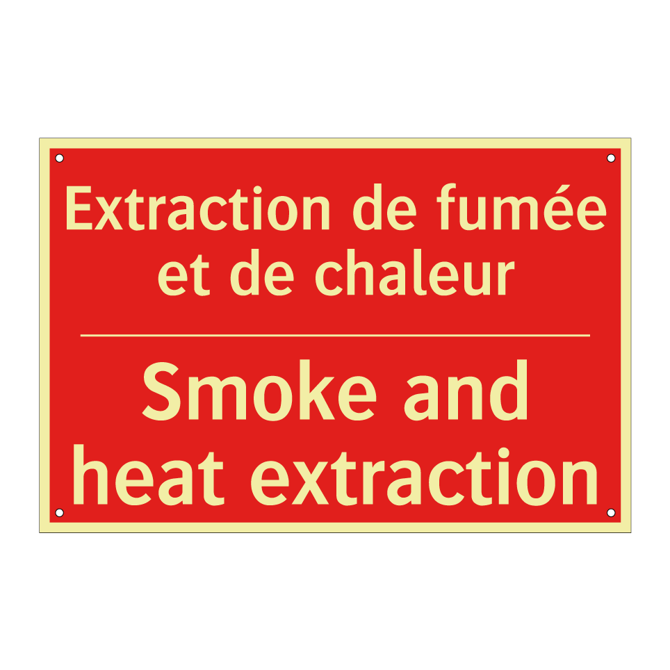 Panneau de signalisation incendie bilingue avec texte en français : "Extraction de fumée et de chaleur", et en anglais : "Smoke and heat extraction"