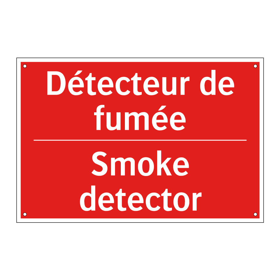 Panneau de signalisation incendie bilingue avec texte en français : "Détecteur de fumée", et en anglais : "Smoke detector"