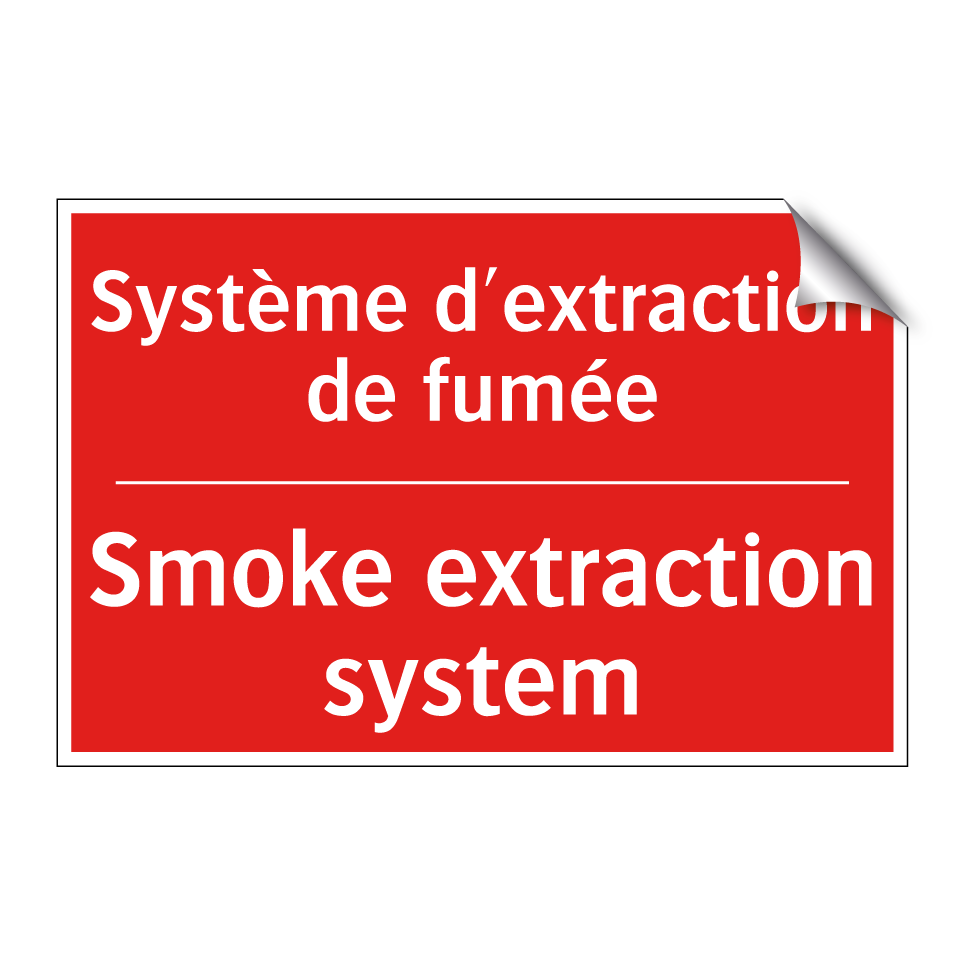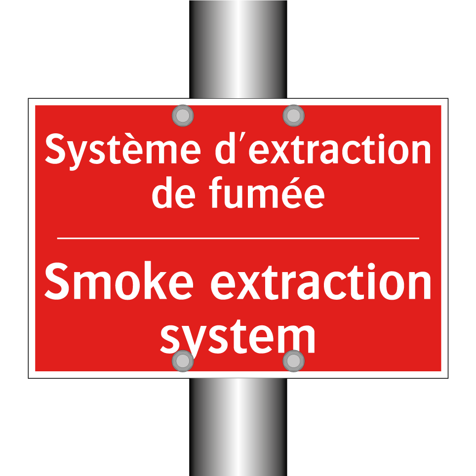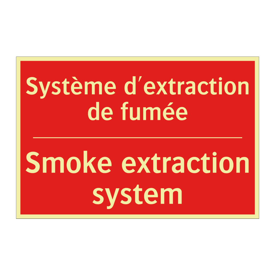 Panneau de signalisation incendie bilingue avec texte en français : "Système d'extraction de fumée", et en anglais : "Smoke extraction system"