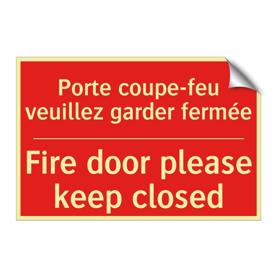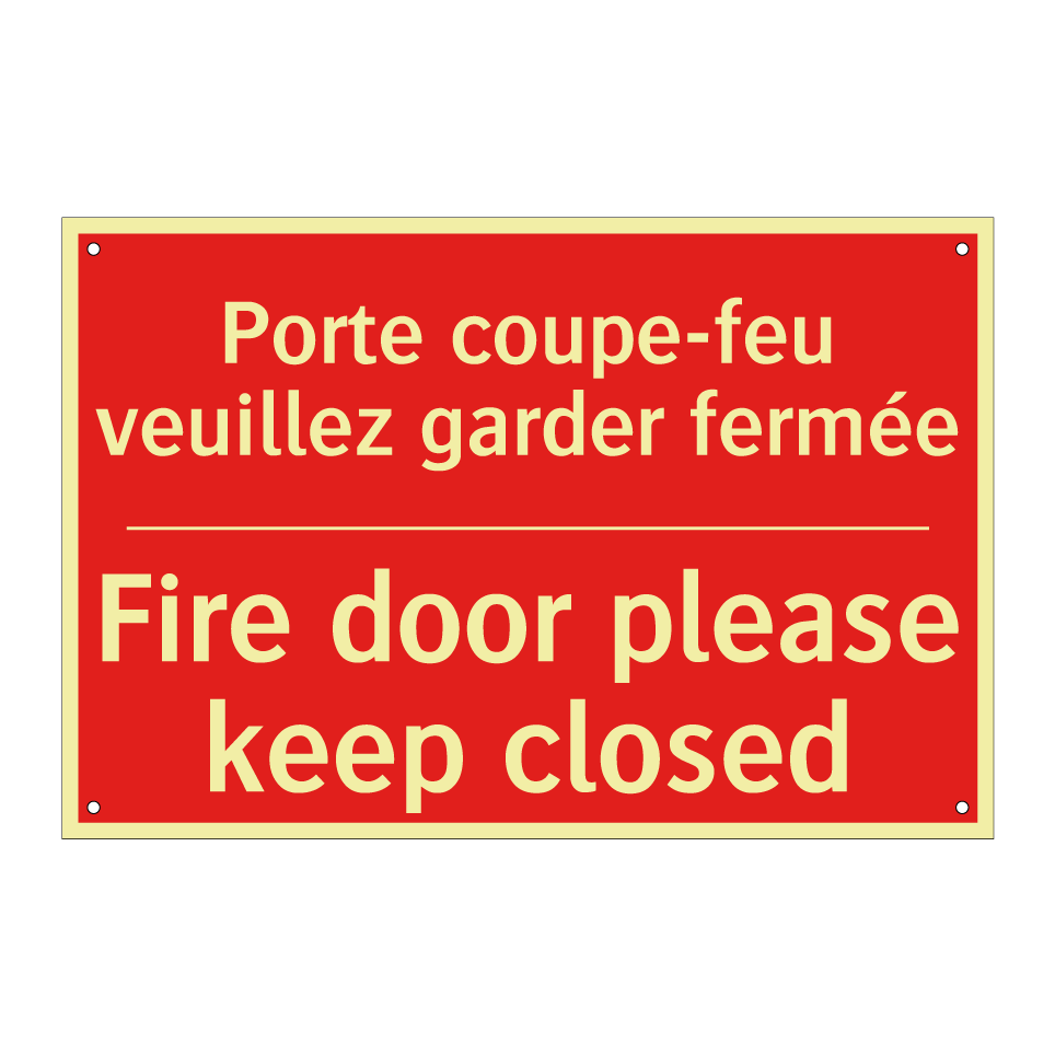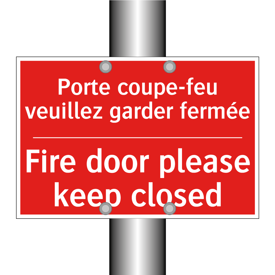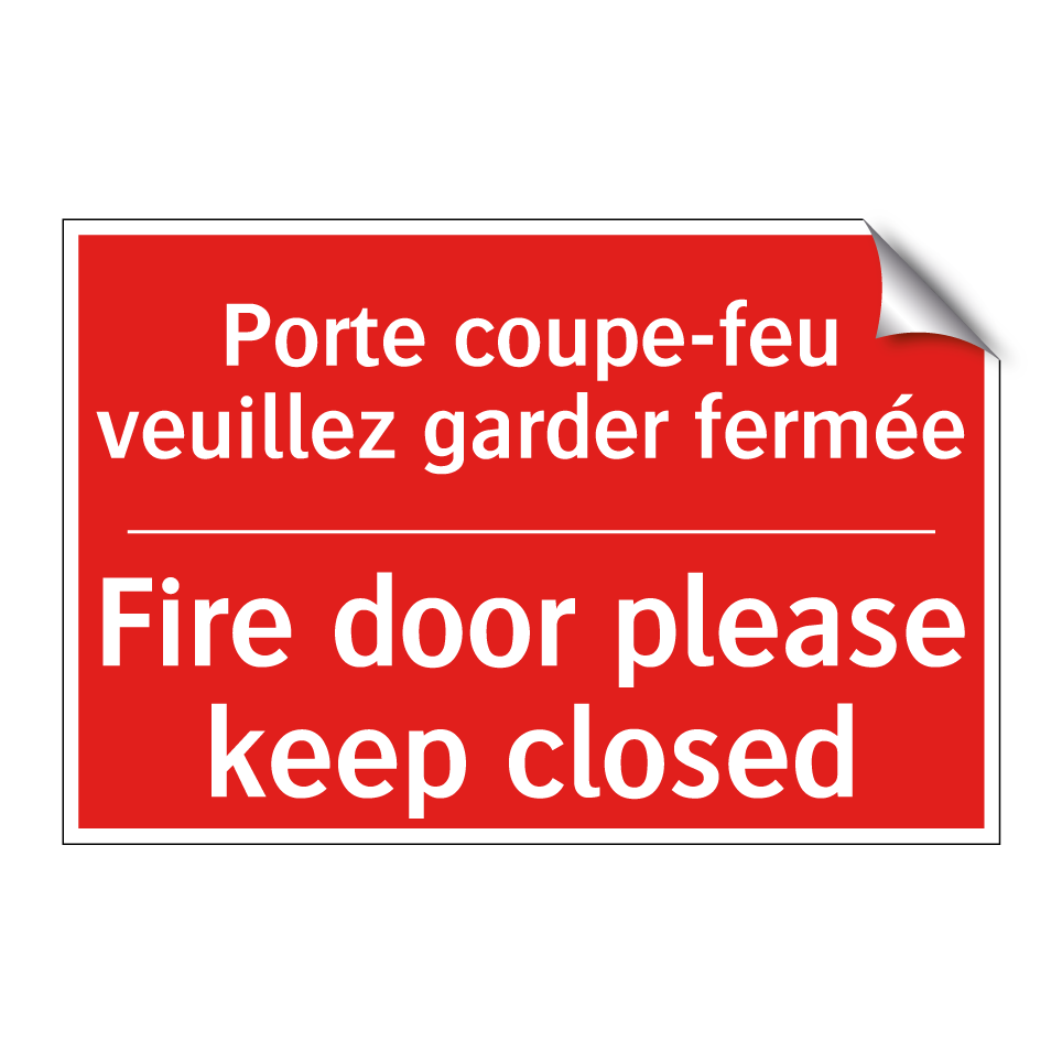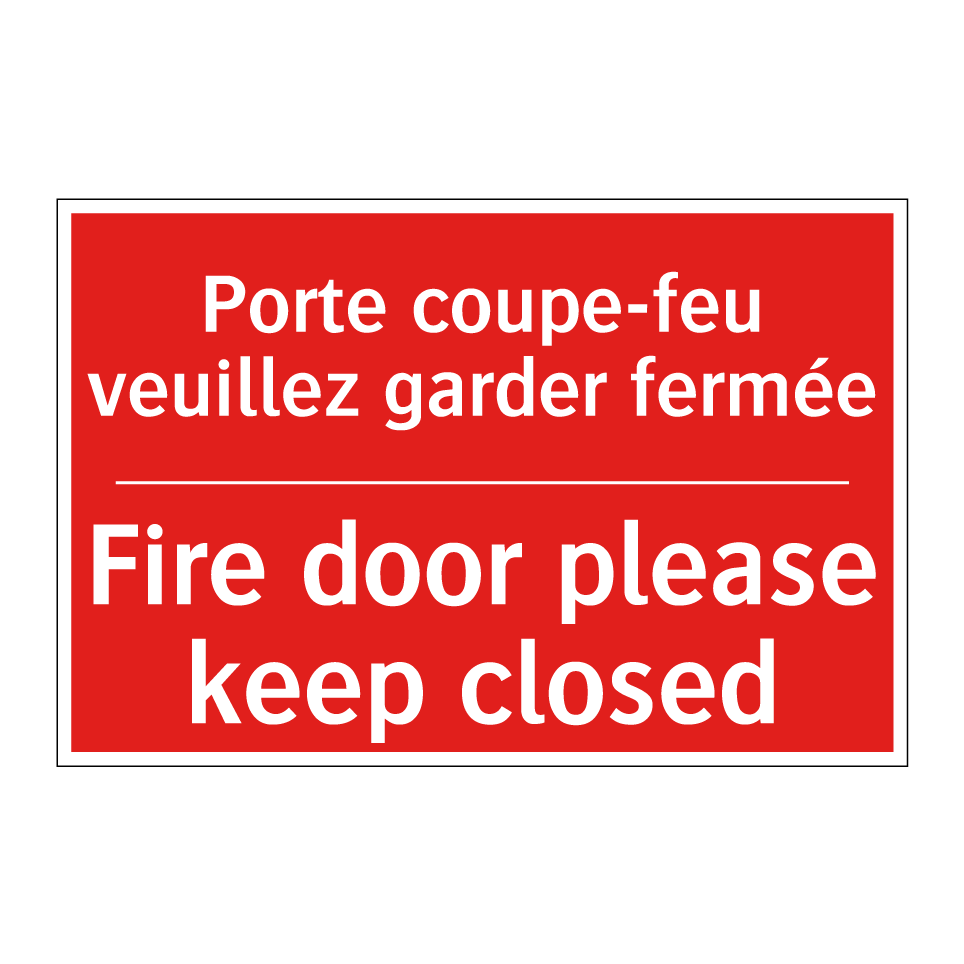 Panneau de signalisation incendie bilingue avec texte en français : "Porte coupe-feu veuillez garder fermée", et en anglais : "Fire door please keep closed"