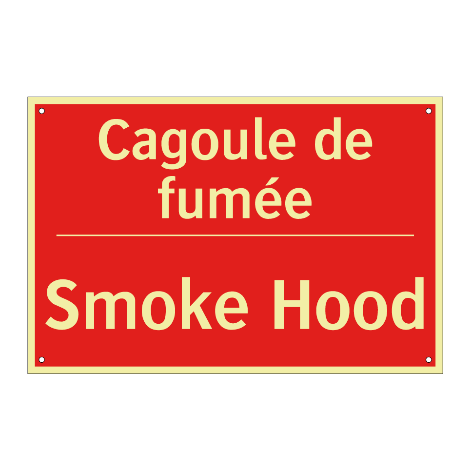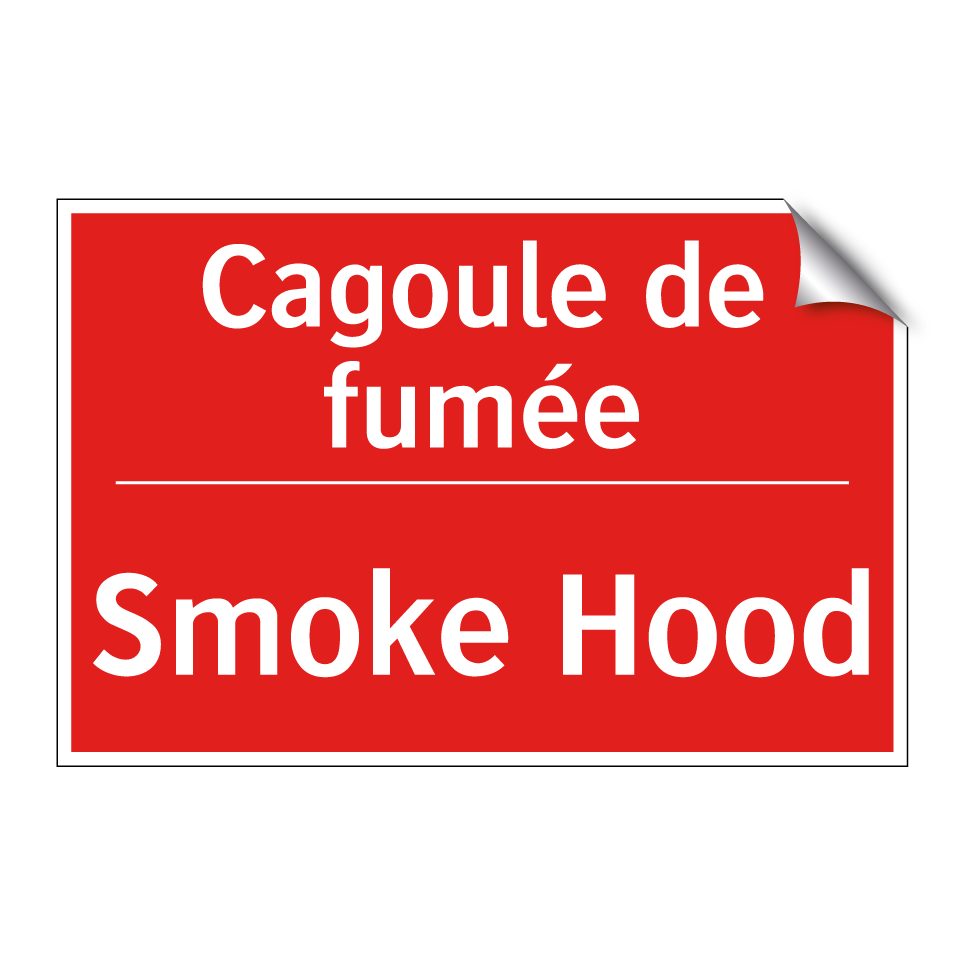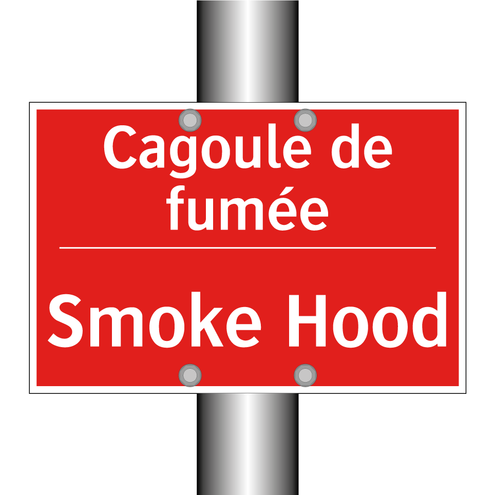 Panneau de signalisation incendie bilingue avec texte en français : "Cagoule de fumée", et en anglais : "Smoke Hood"