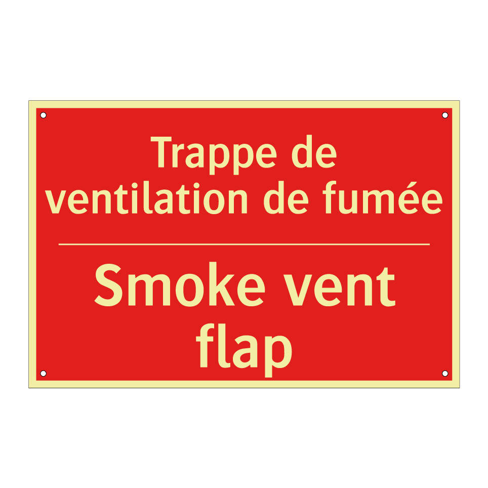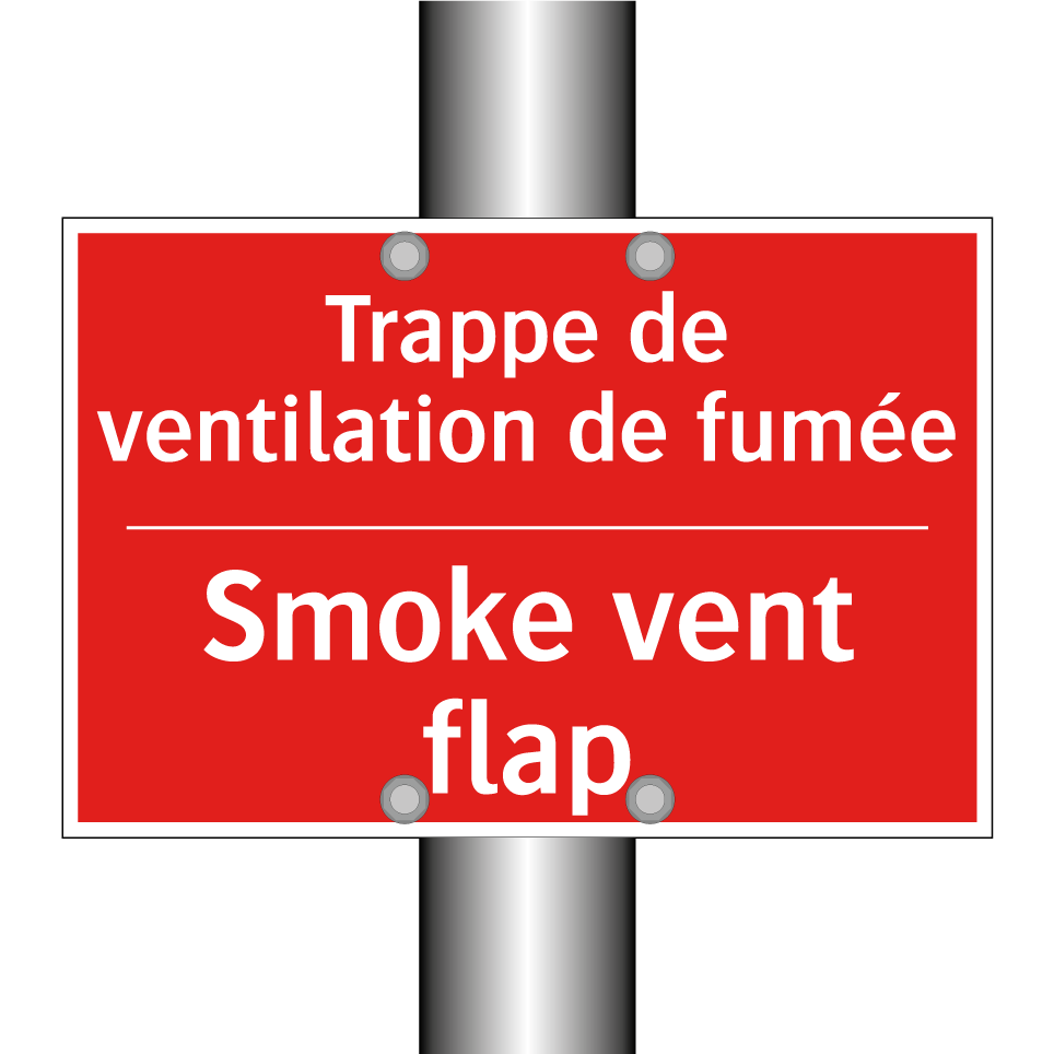 Panneau de signalisation incendie bilingue avec texte en français : "Trappe de ventilation de fumée", et en anglais : "Smoke vent flap"