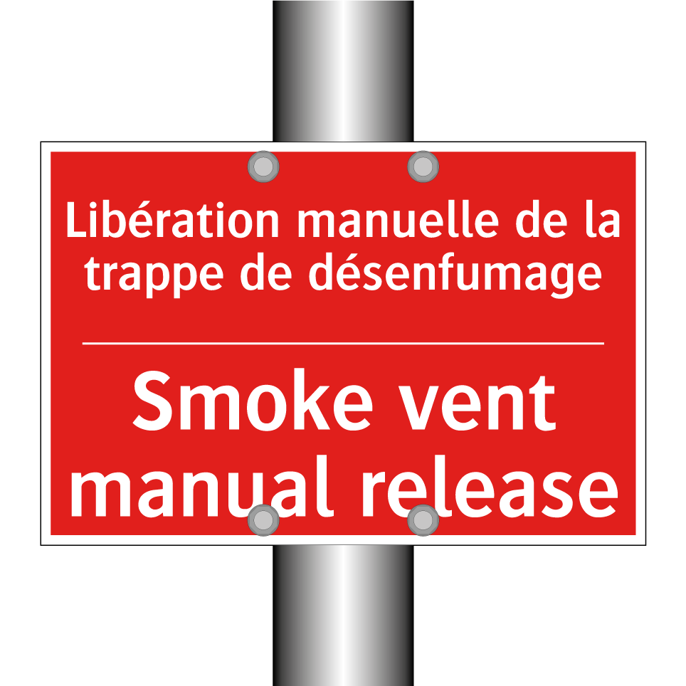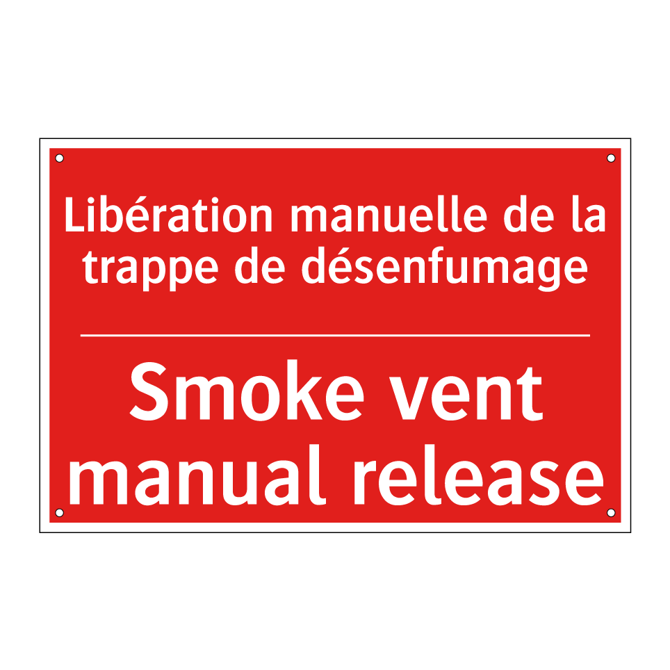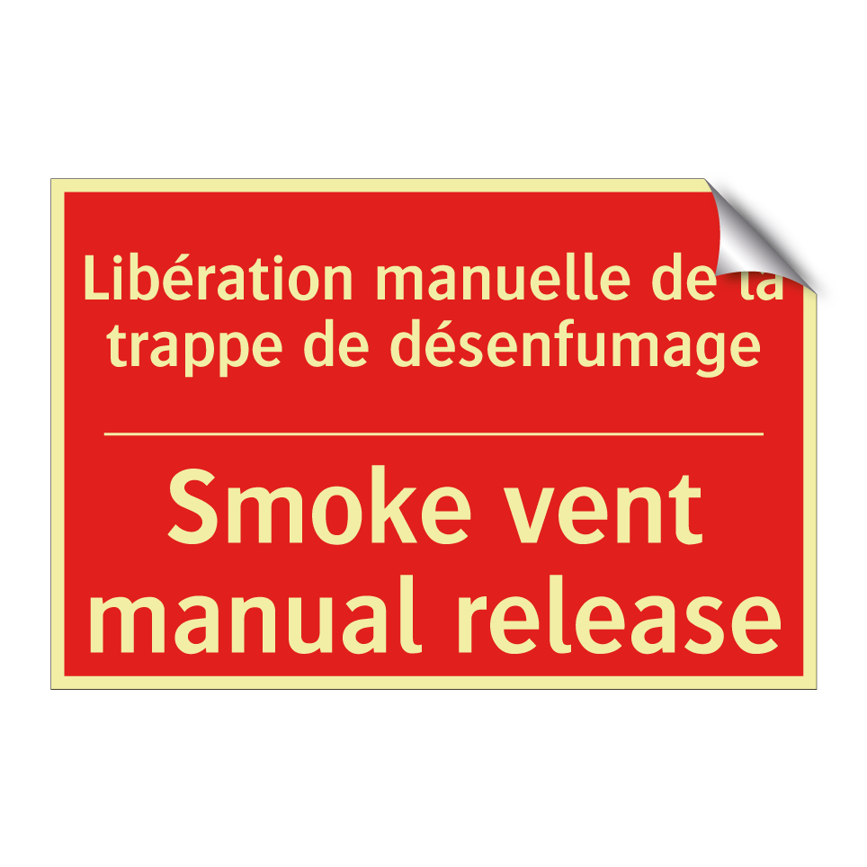 Panneau de signalisation incendie bilingue avec texte en français : "Libération manuelle de la trappe de désenfumage", et en anglais : "Smoke vent manual release"