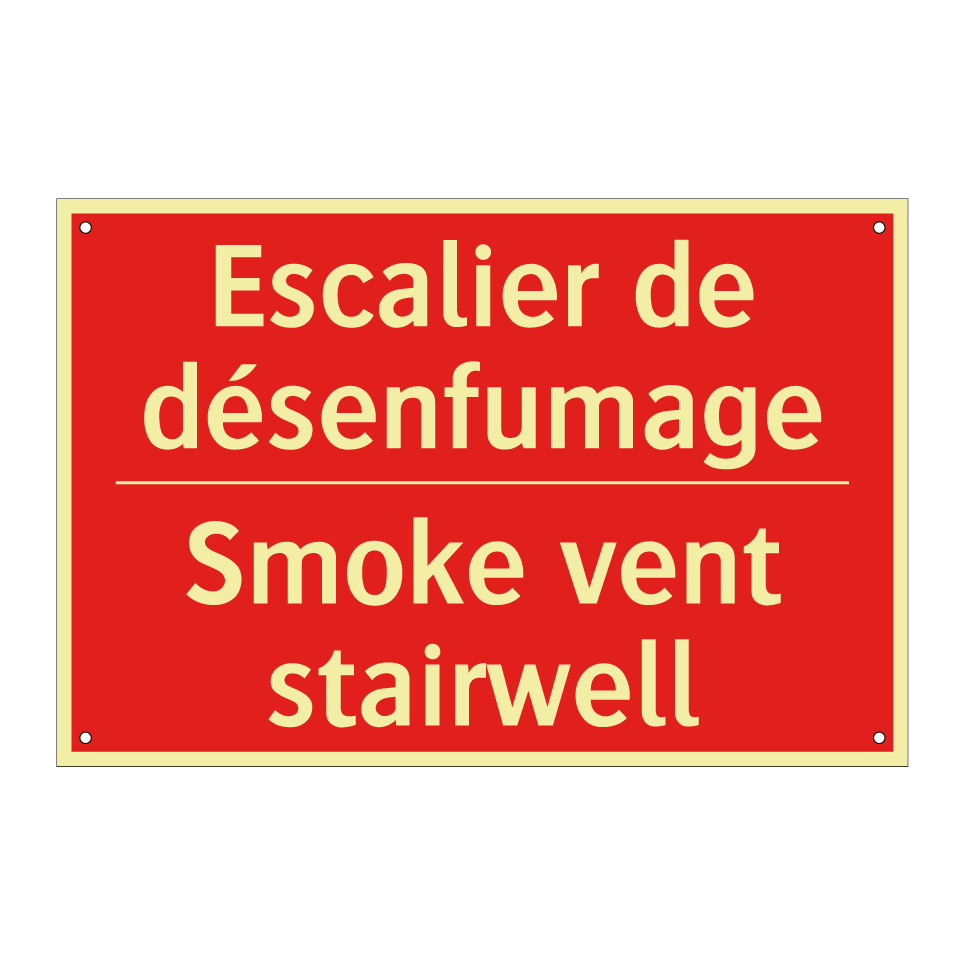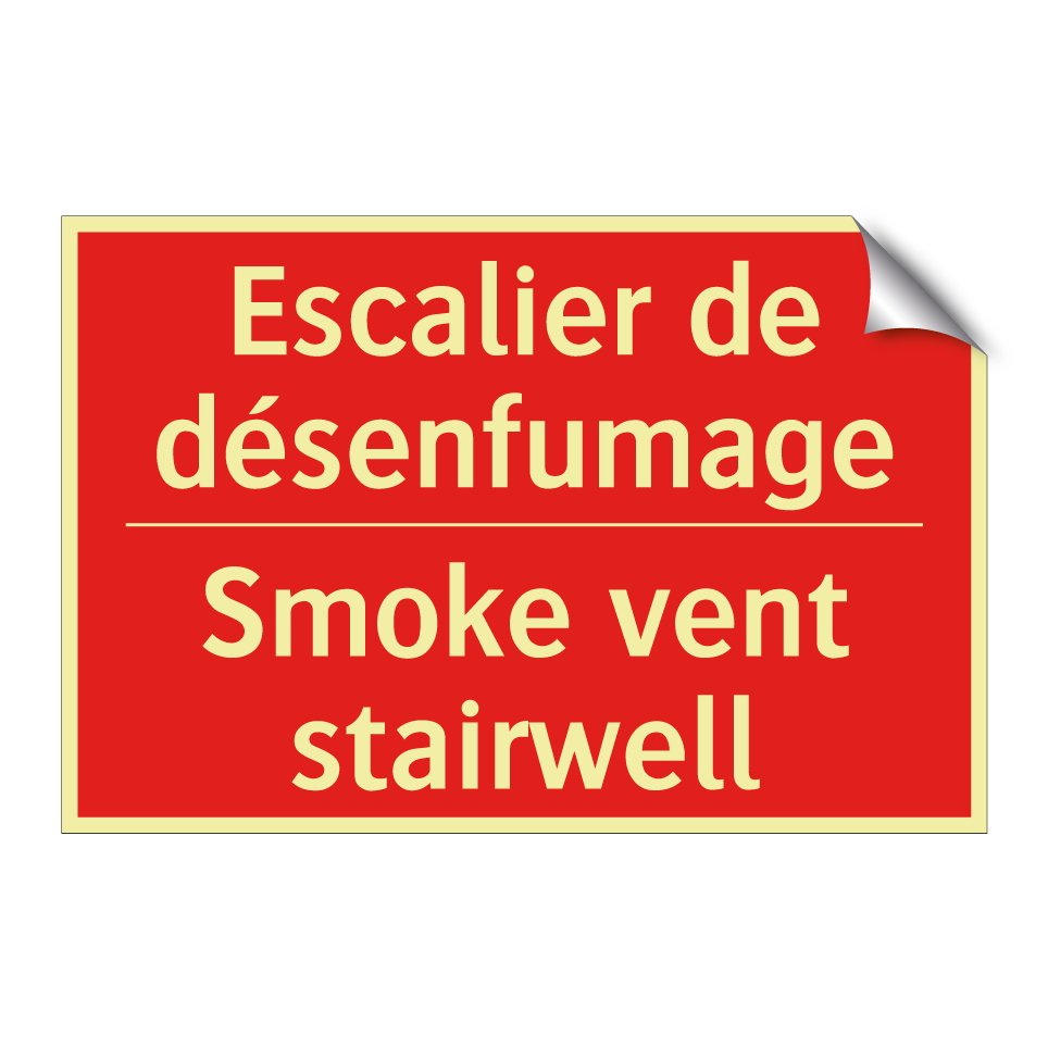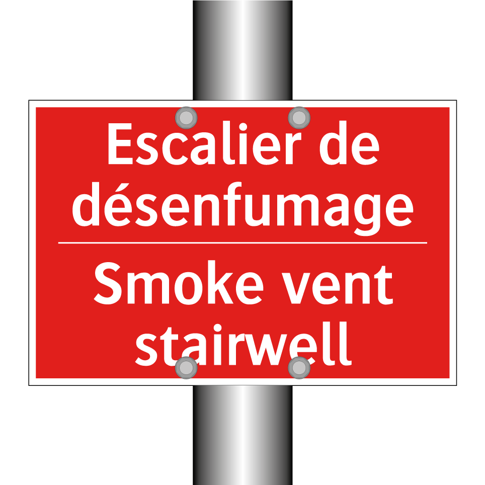 Panneau de signalisation incendie bilingue avec texte en français : "Escalier de désenfumage", et en anglais : "Smoke vent stairwell"