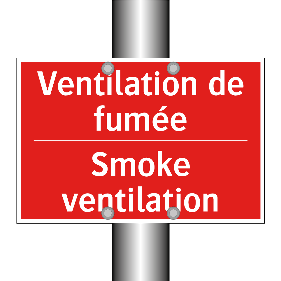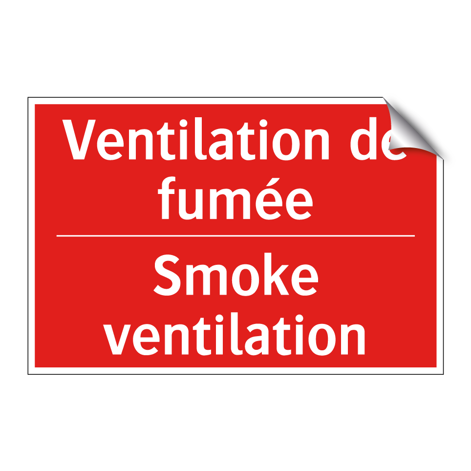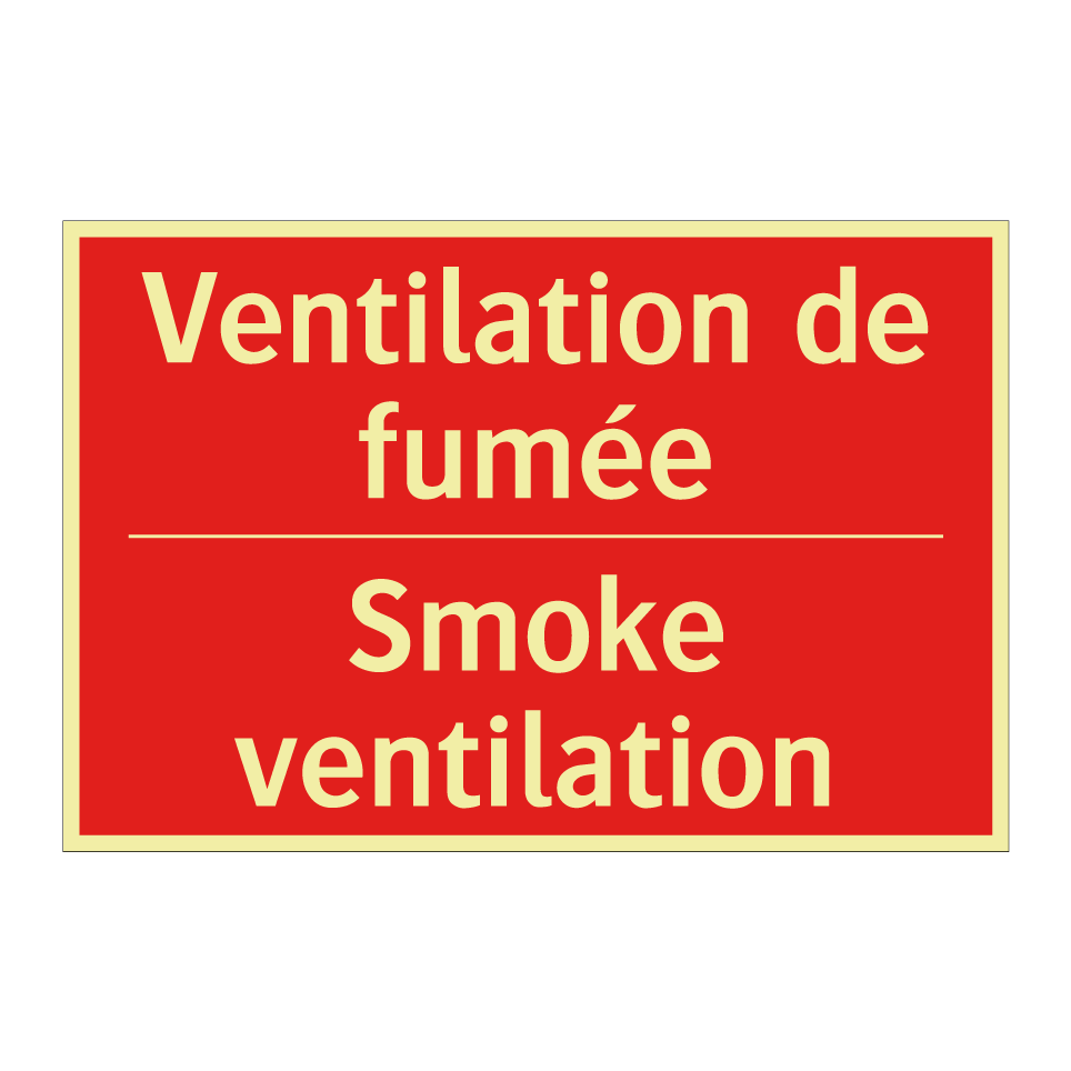 Panneau de signalisation incendie bilingue avec texte en français : "Ventilation de fumée", et en anglais : "Smoke ventilation"