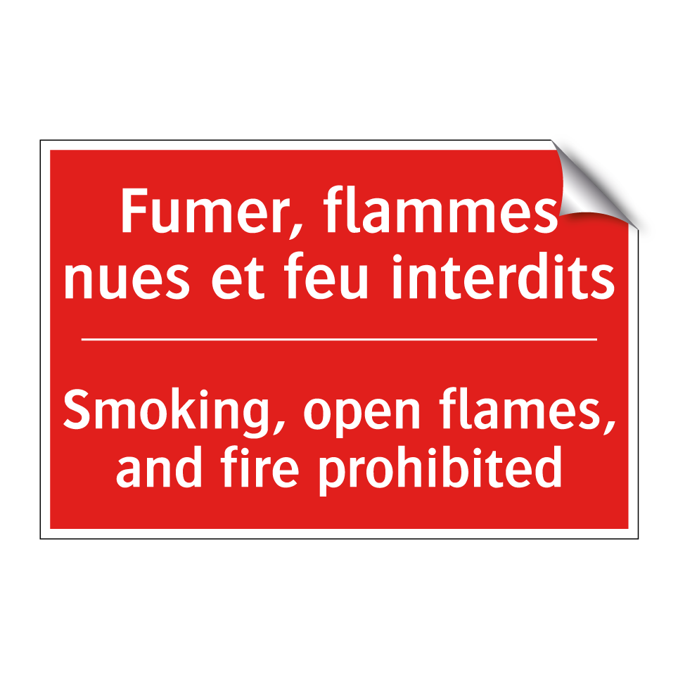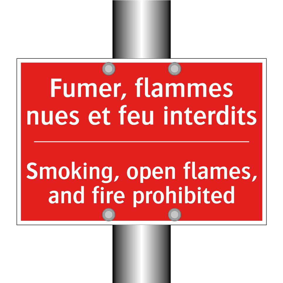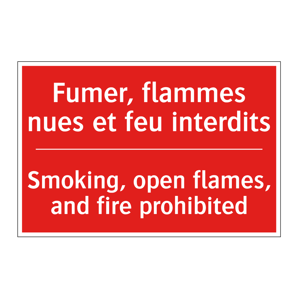 Panneau de signalisation incendie bilingue avec texte en français : "Fumer, flammes nues et feu interdits", et en anglais : "Smoking, open flames, and fire prohibited"