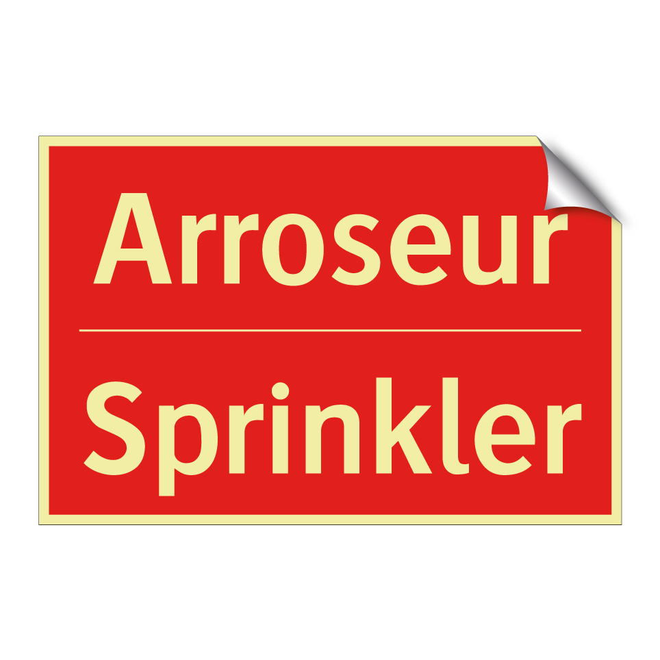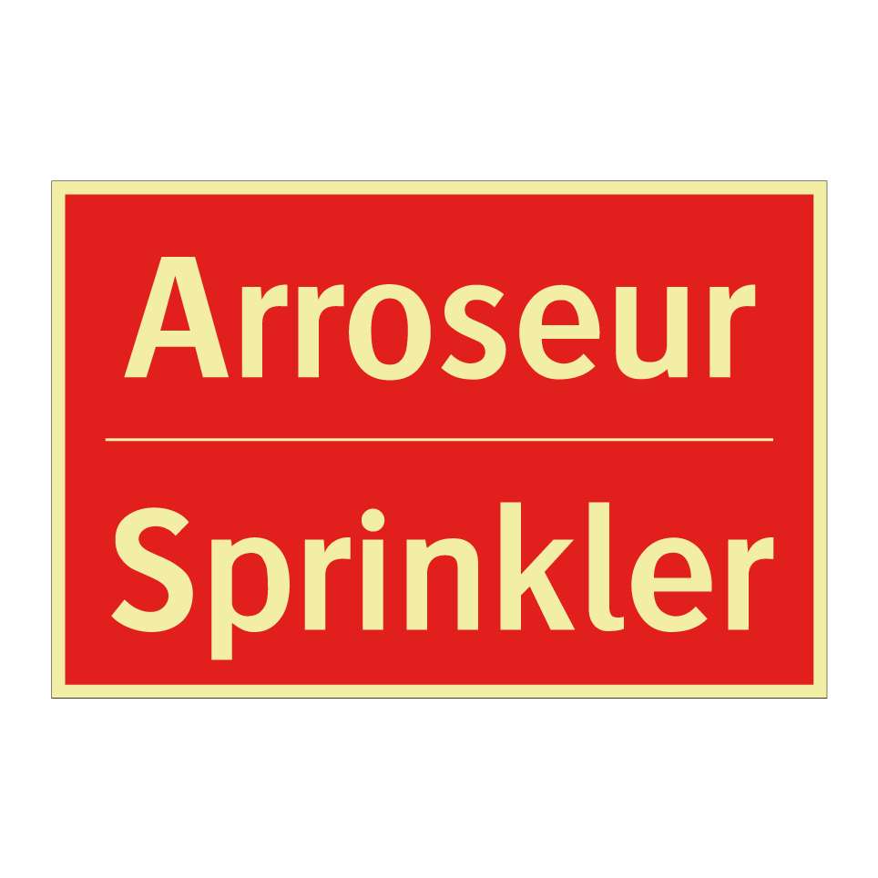 Panneau de signalisation incendie bilingue avec texte en français : "Arroseur", et en anglais : "Sprinkler"