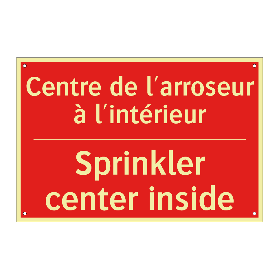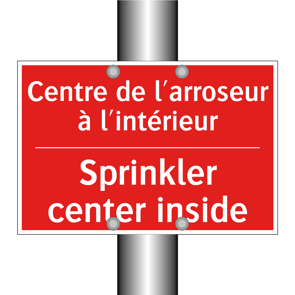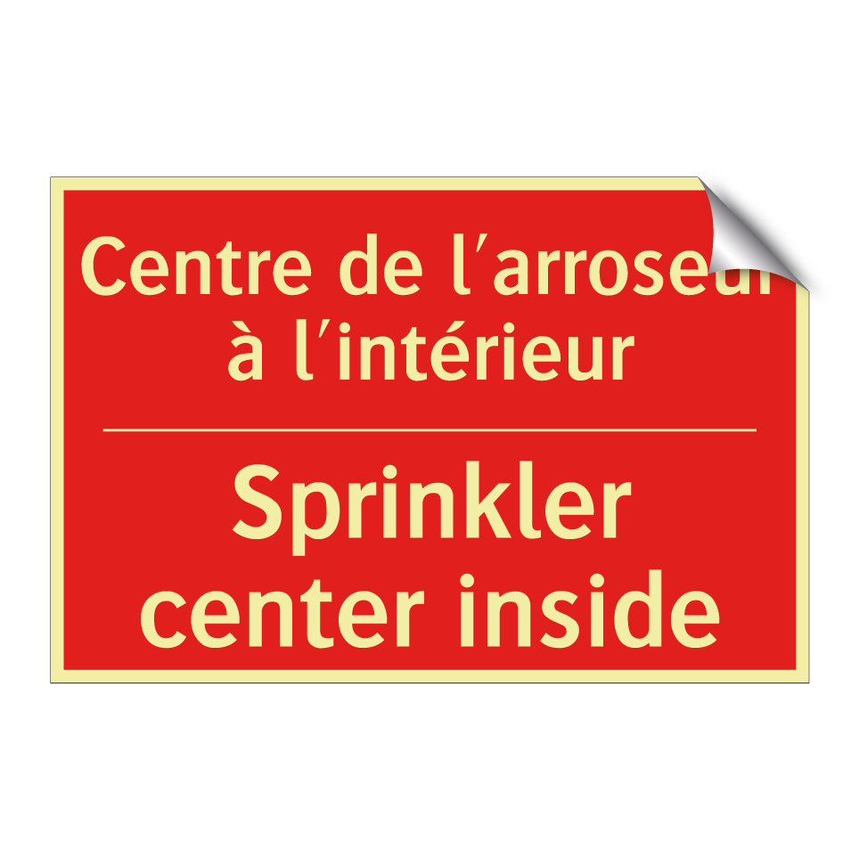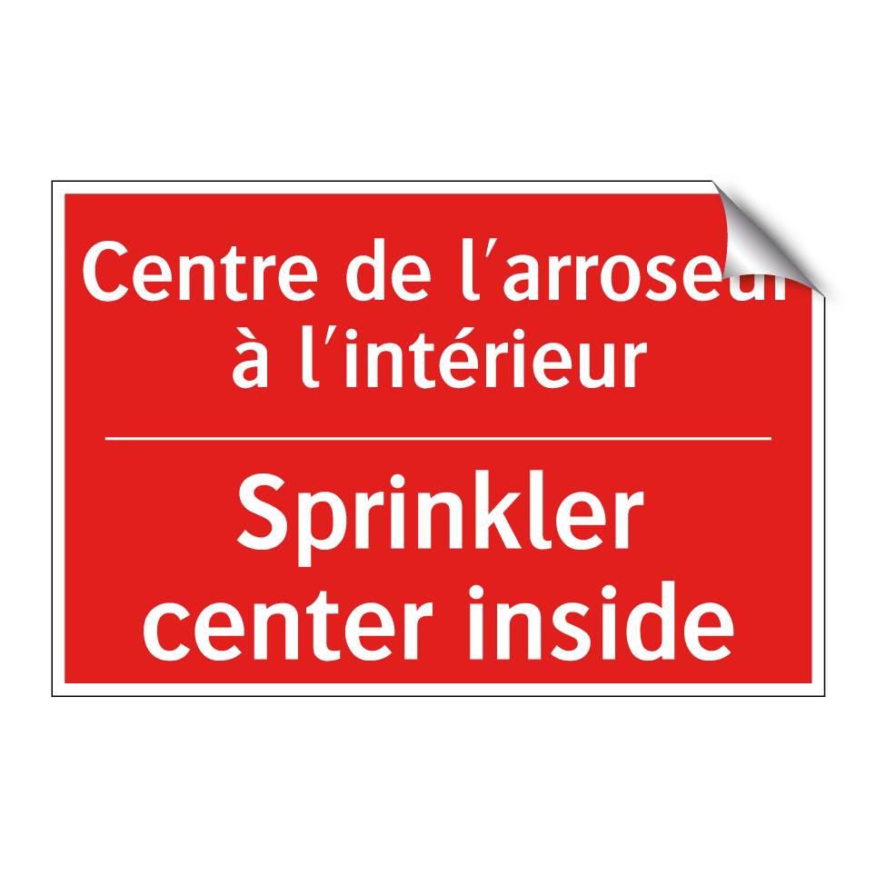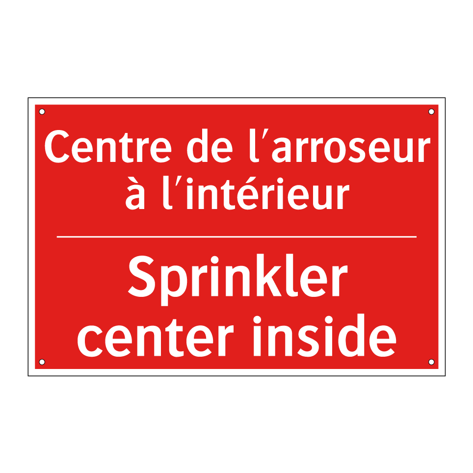 Panneau de signalisation incendie bilingue avec texte en français : "Centre de l'arroseur à l'intérieur", et en anglais : "Sprinkler center inside"