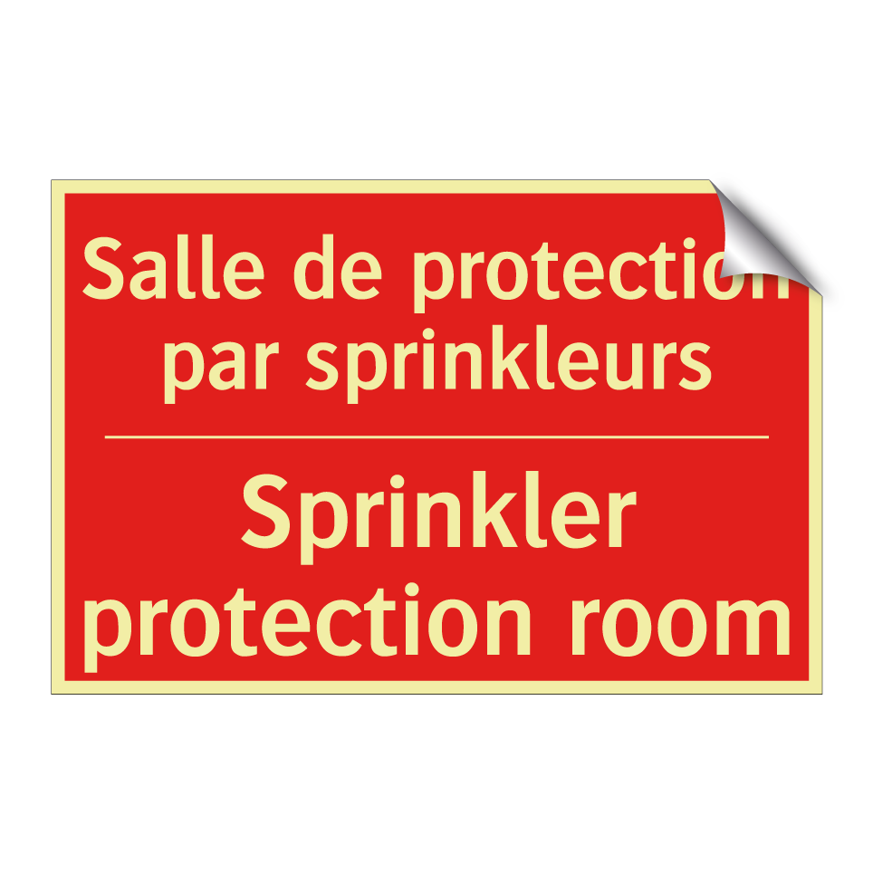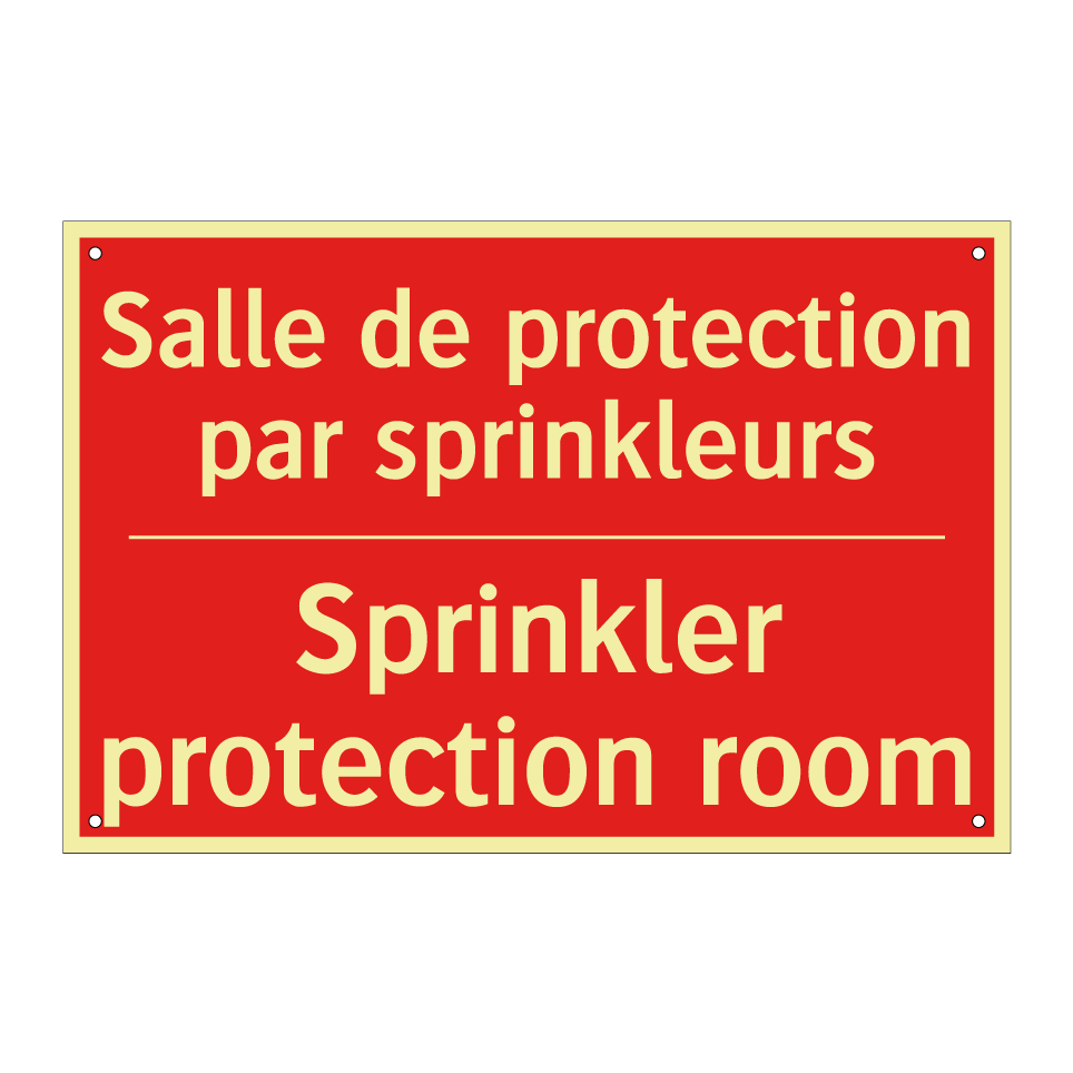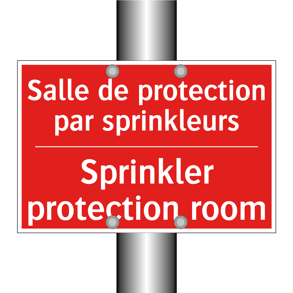 Panneau de signalisation incendie bilingue avec texte en français : "Salle de protection par sprinkleurs", et en anglais : "Sprinkler protection room"