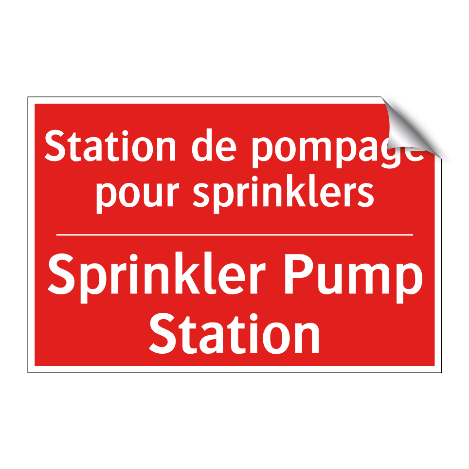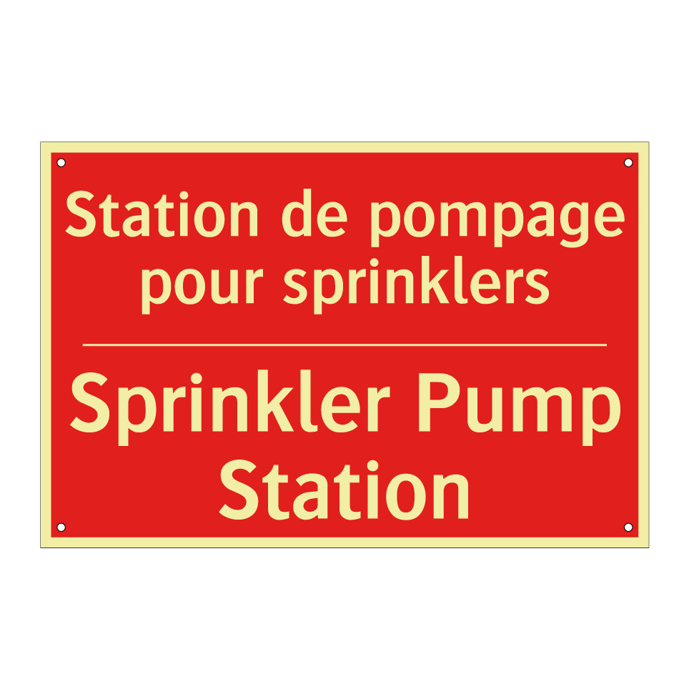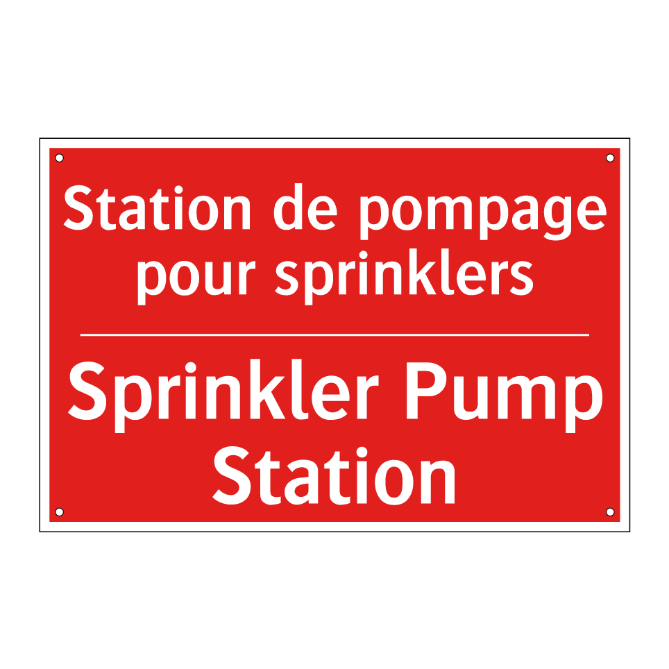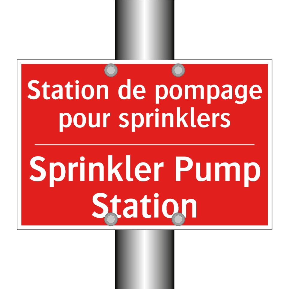 Panneau de signalisation incendie bilingue avec texte en français : "Station de pompage pour sprinklers", et en anglais : "Sprinkler Pump Station"