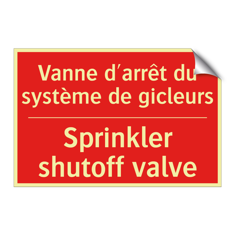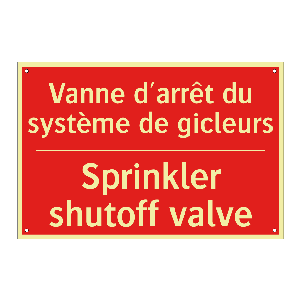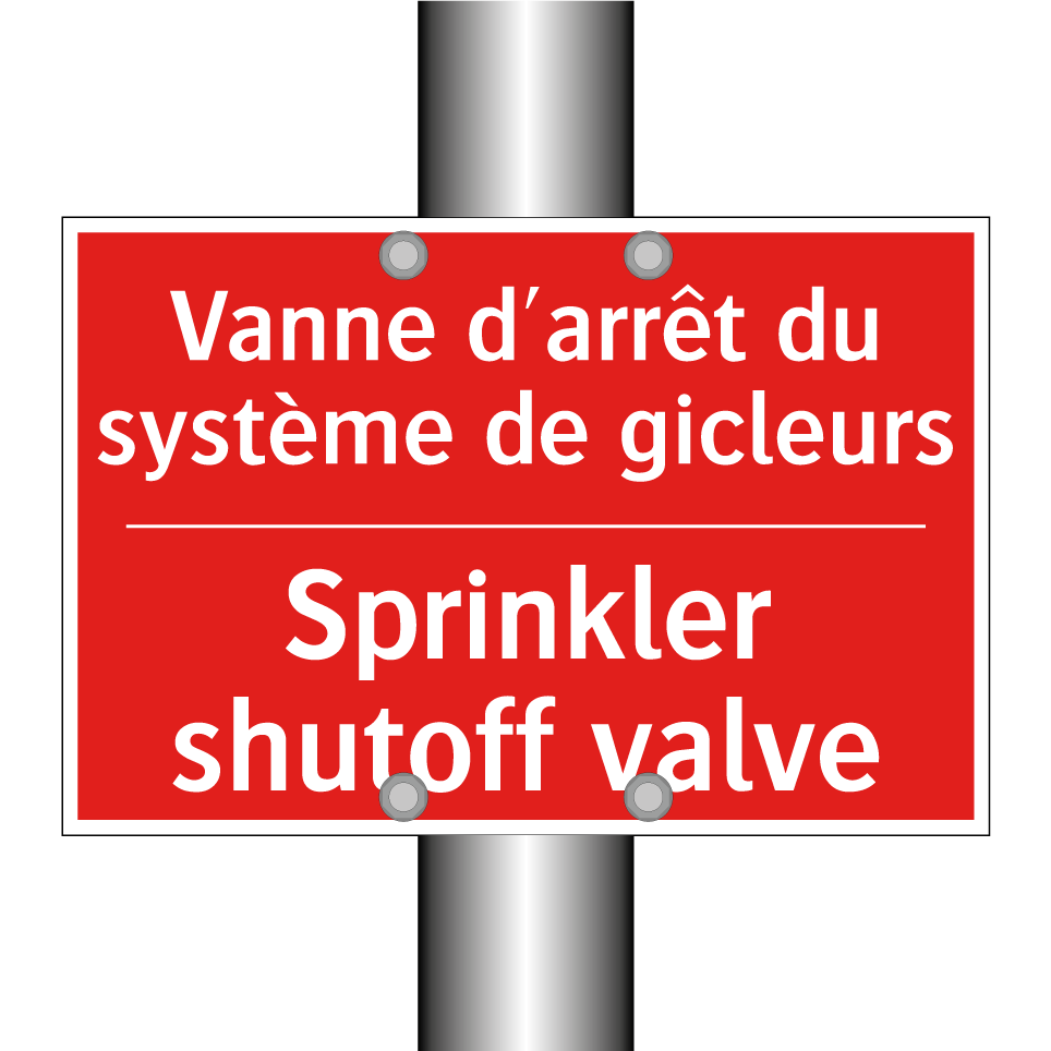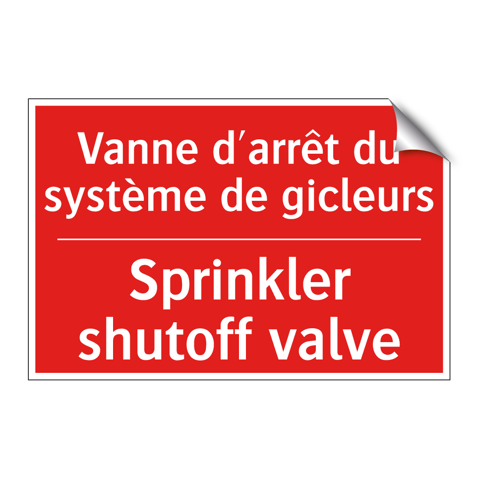 Panneau de signalisation incendie bilingue avec texte en français : "Vanne d'arrêt du système de gicleurs", et en anglais : "Sprinkler shutoff valve"