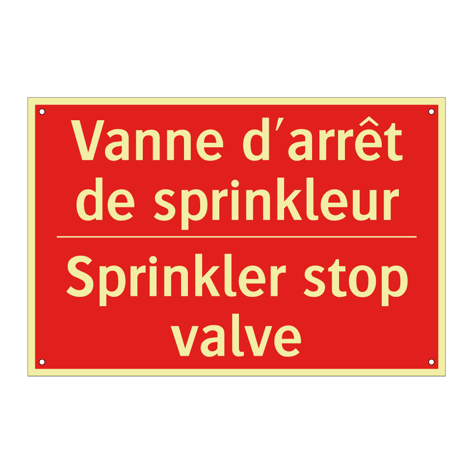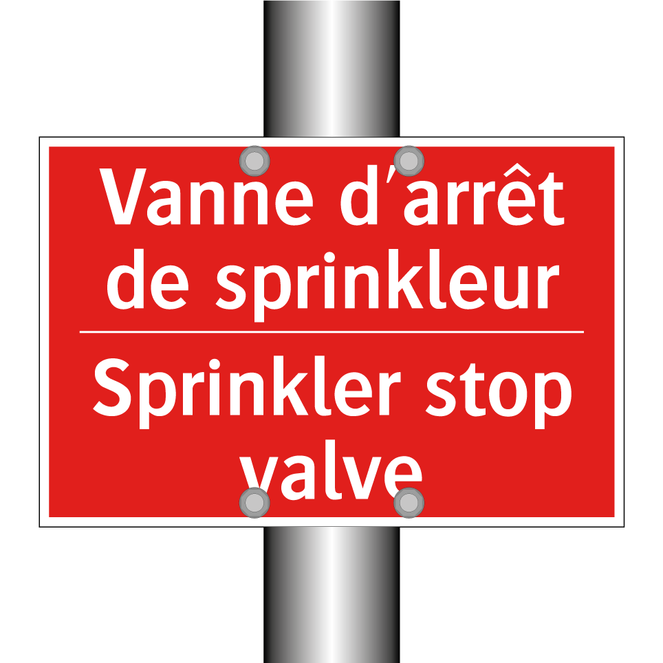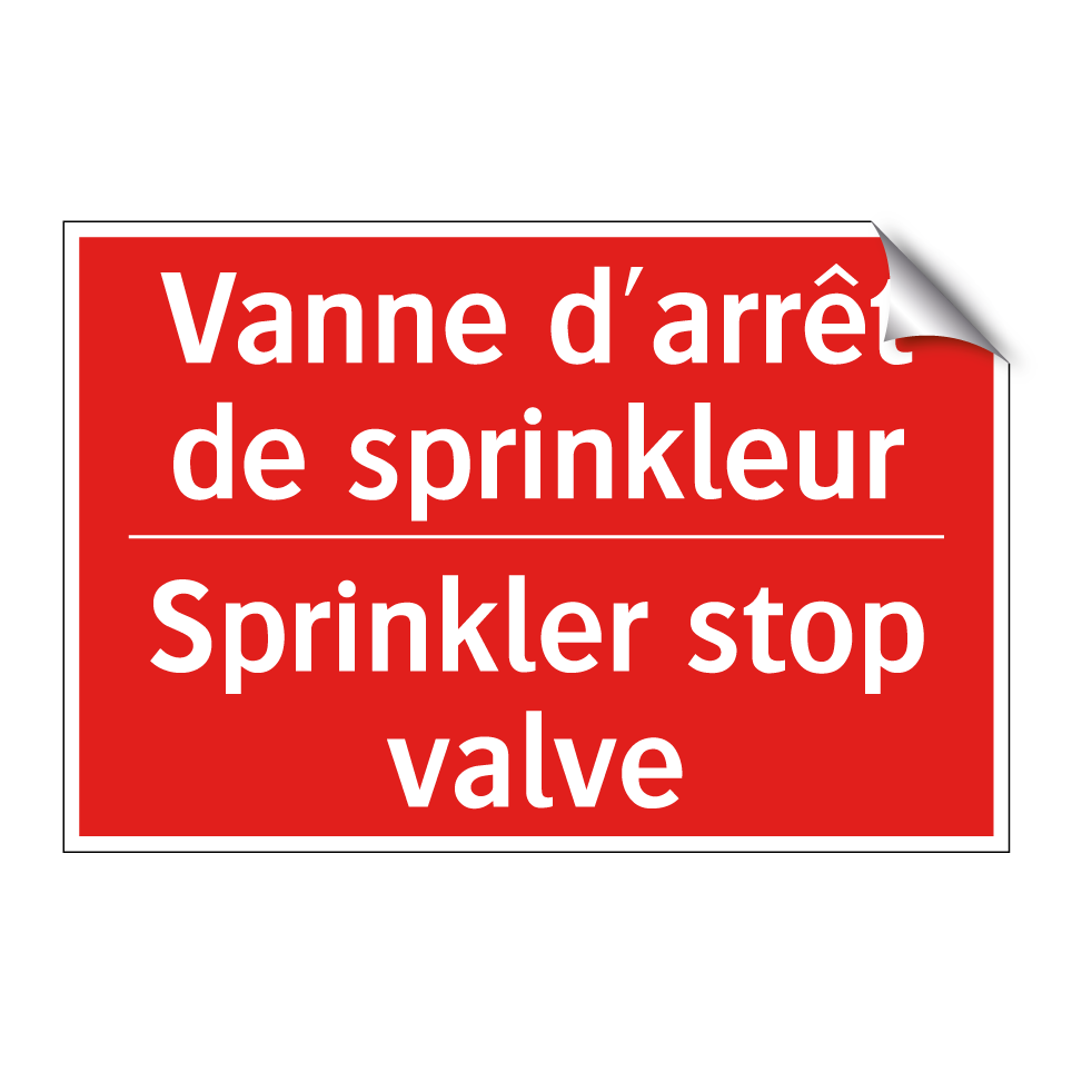 Panneau de signalisation incendie bilingue avec texte en français : "Vanne d'arrêt de sprinkleur", et en anglais : "Sprinkler stop valve"