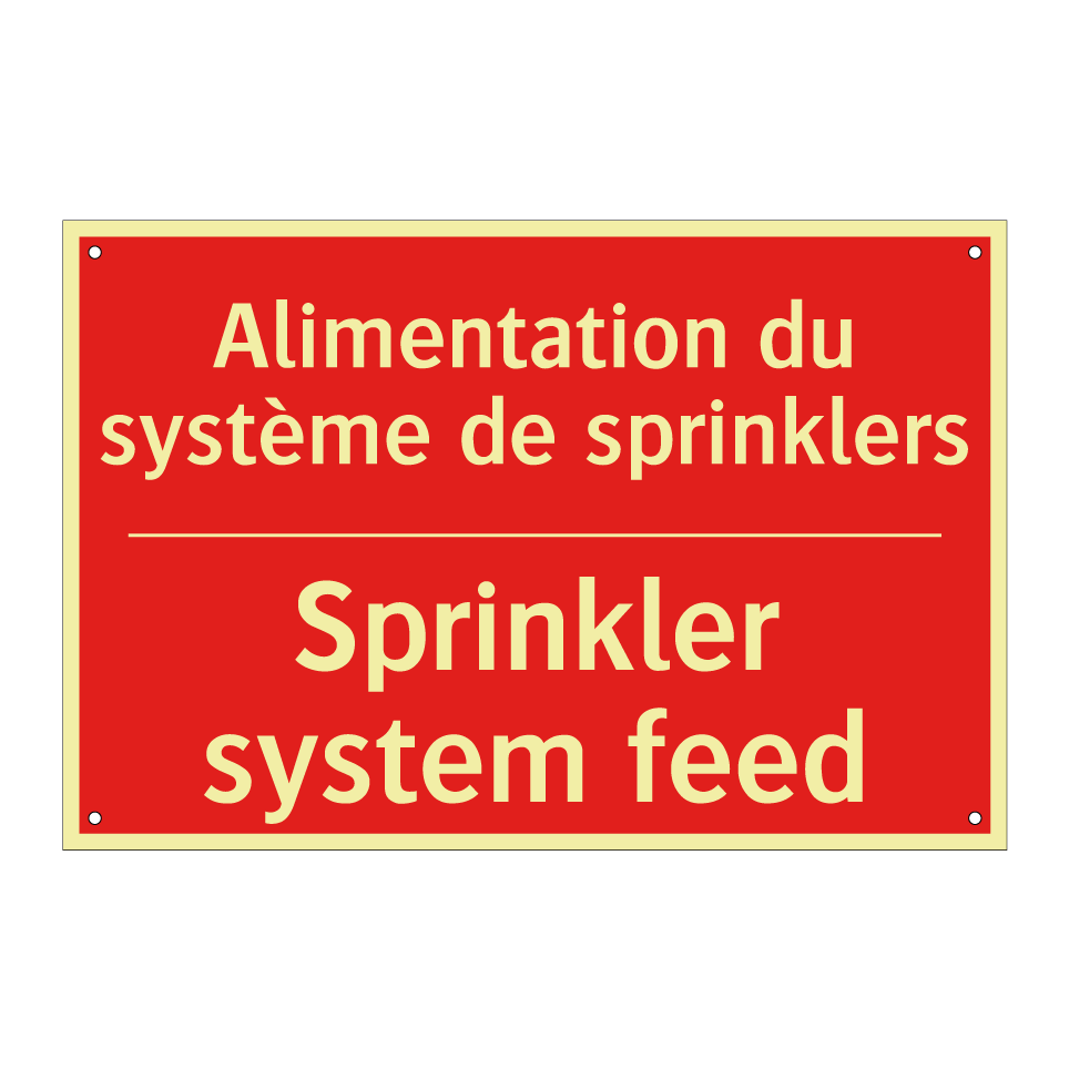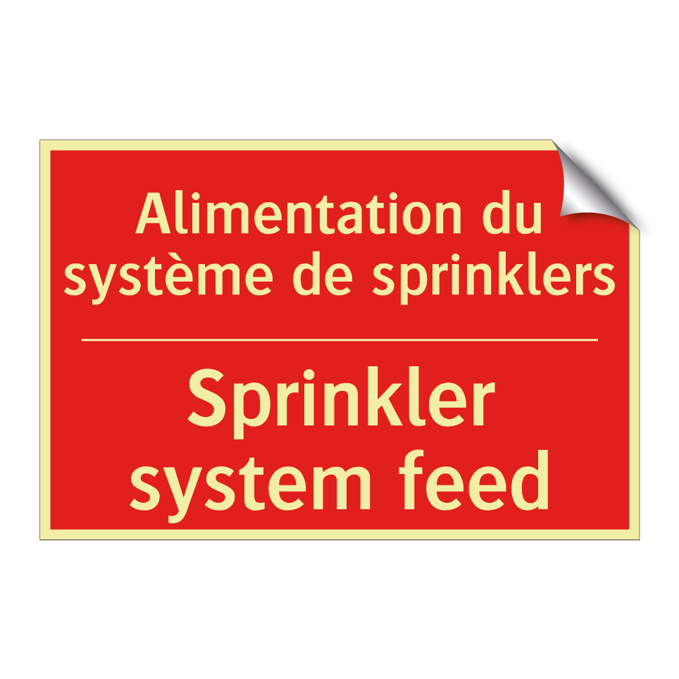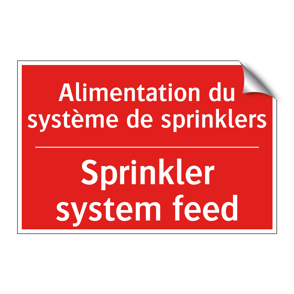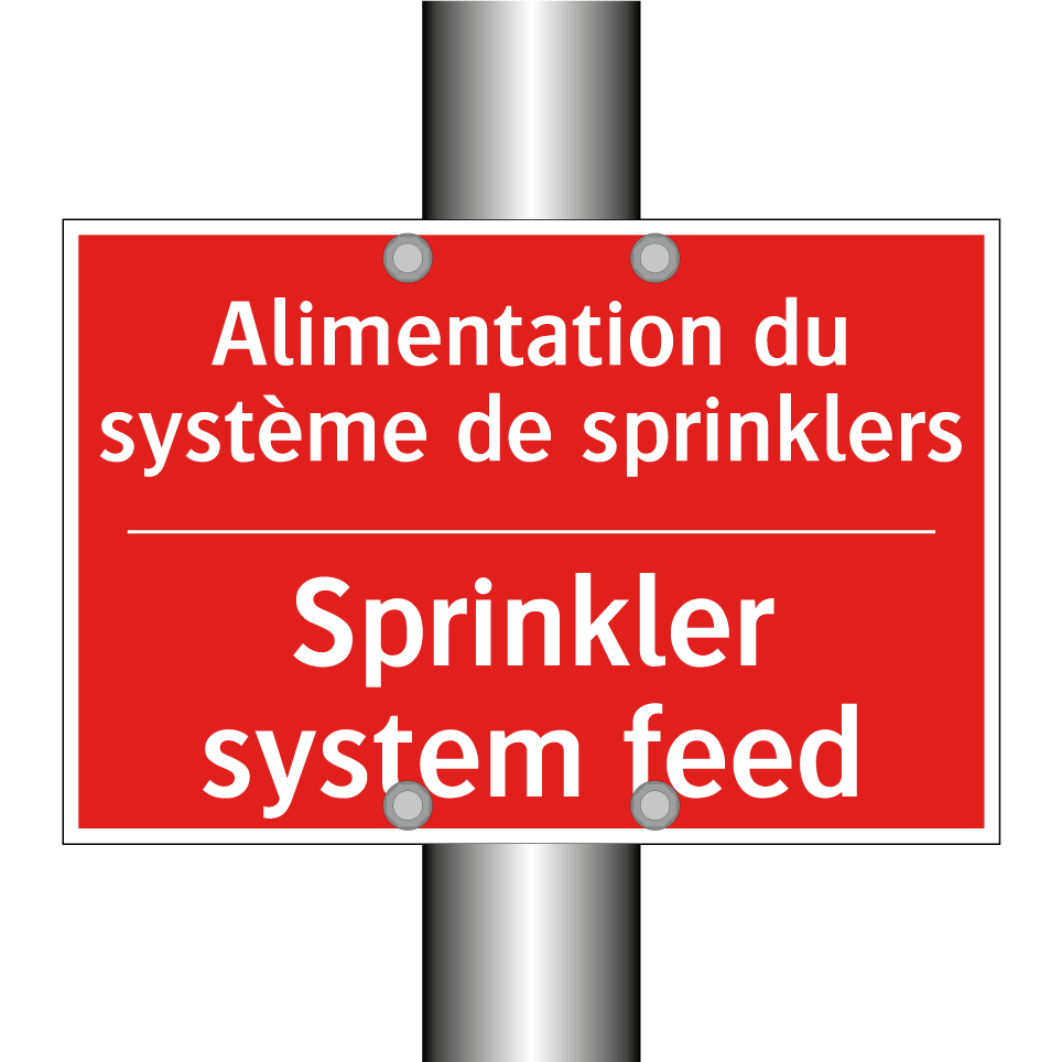 Panneau de signalisation incendie bilingue avec texte en français : "Alimentation du système de sprinklers", et en anglais : "Sprinkler system feed"