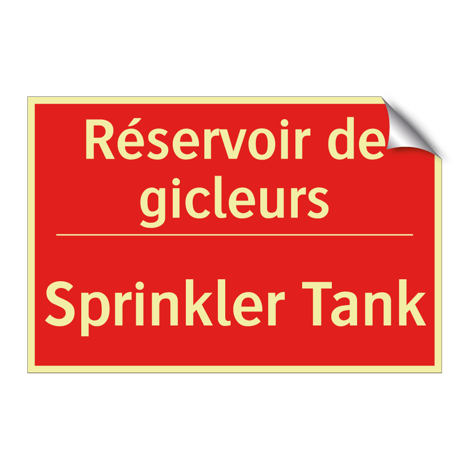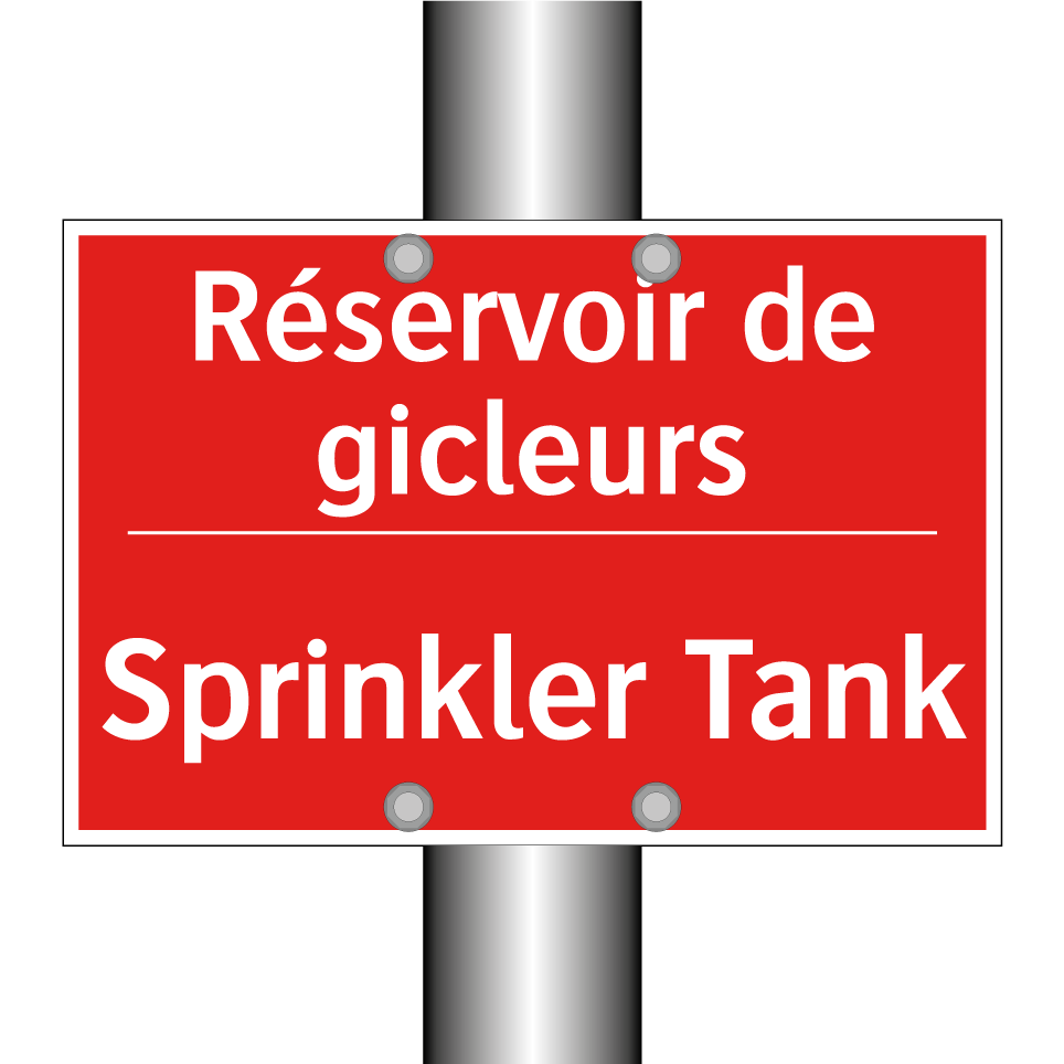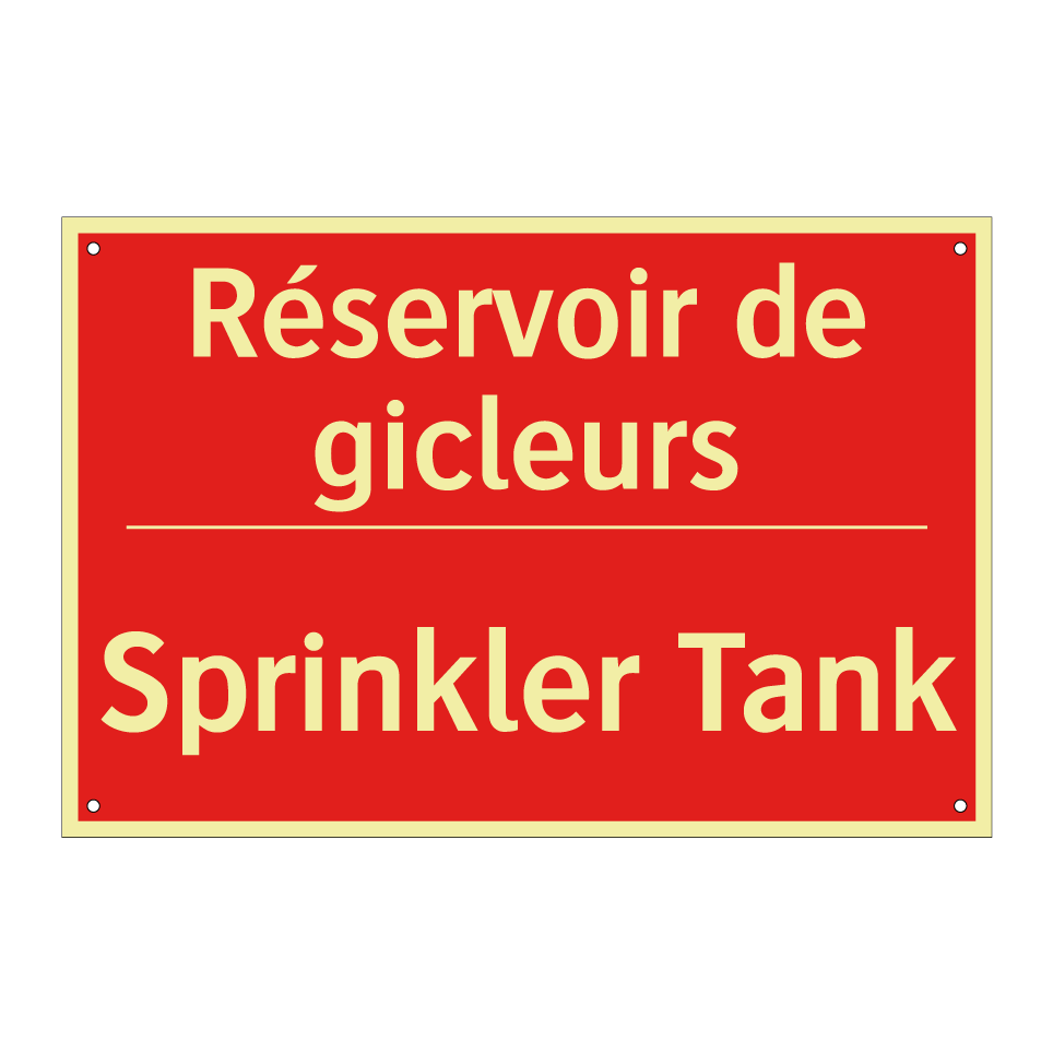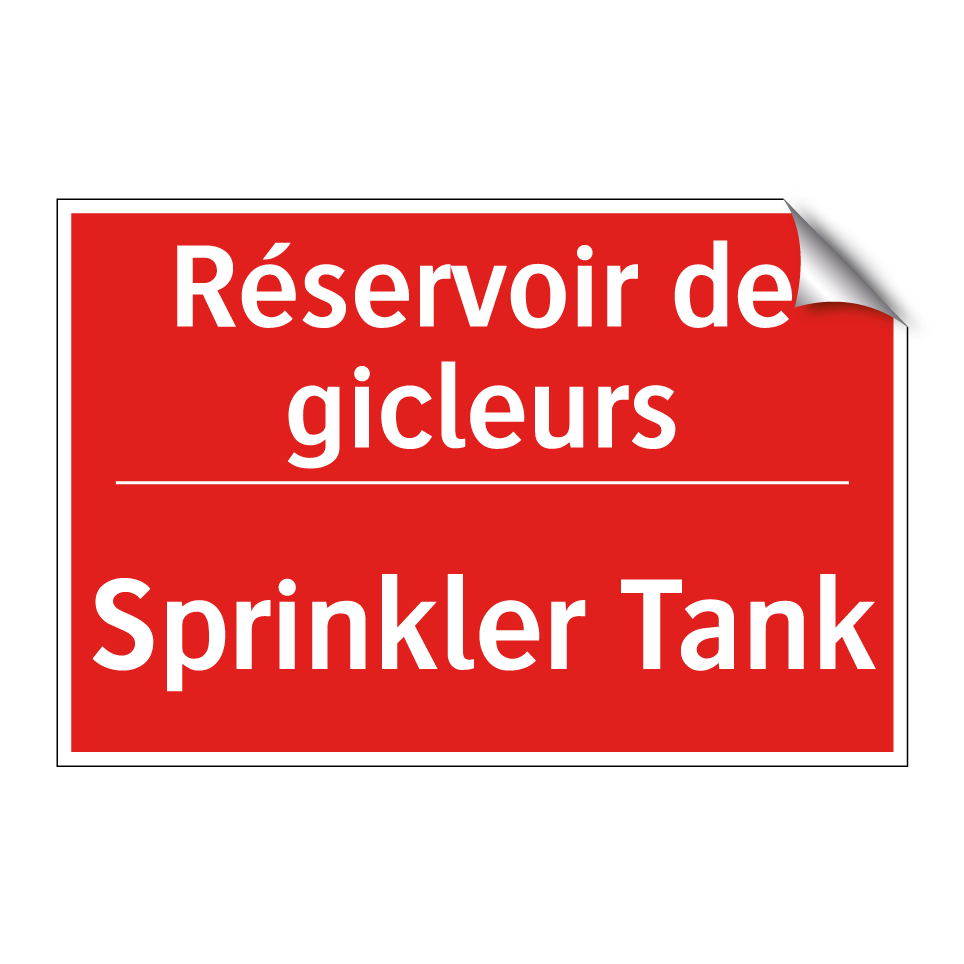 Panneau de signalisation incendie bilingue avec texte en français : "Réservoir de gicleurs", et en anglais : "Sprinkler Tank"
