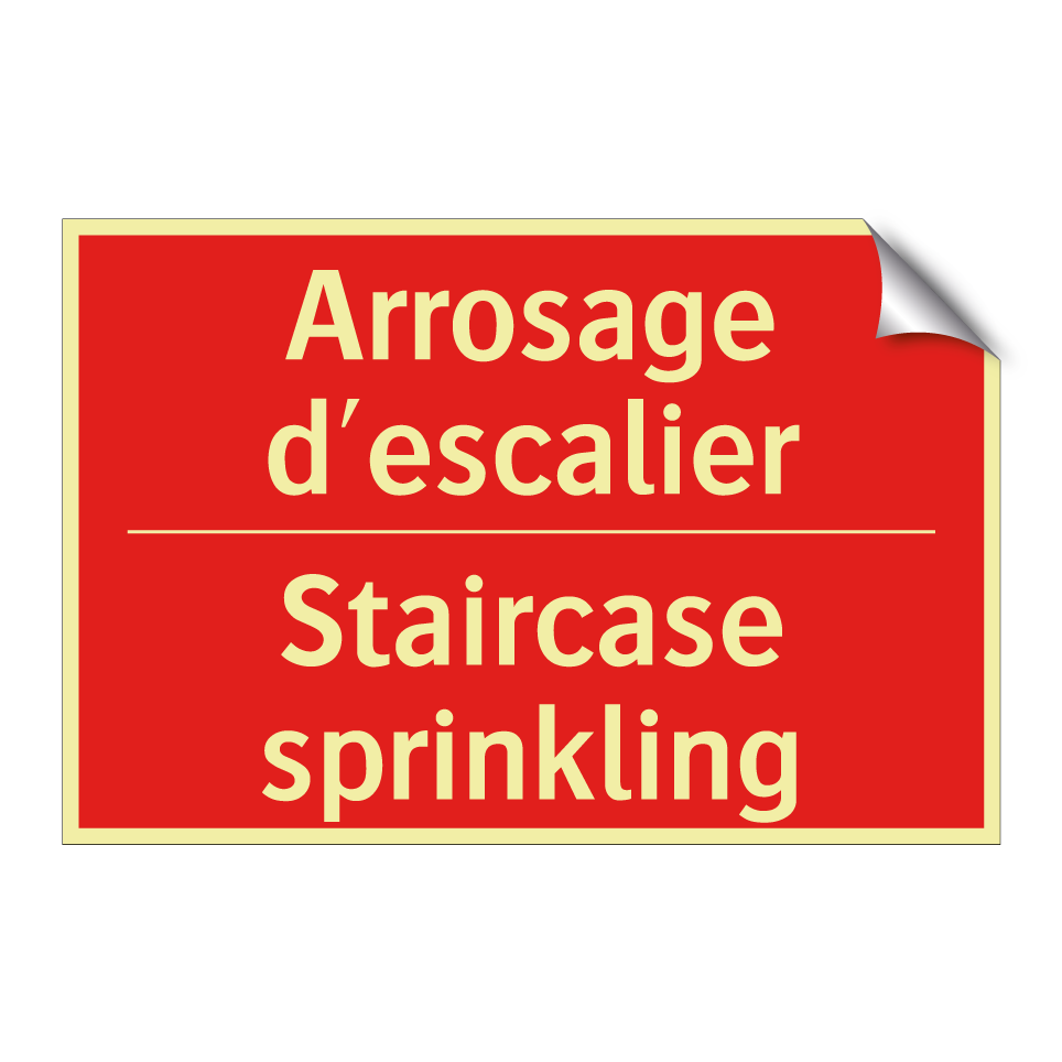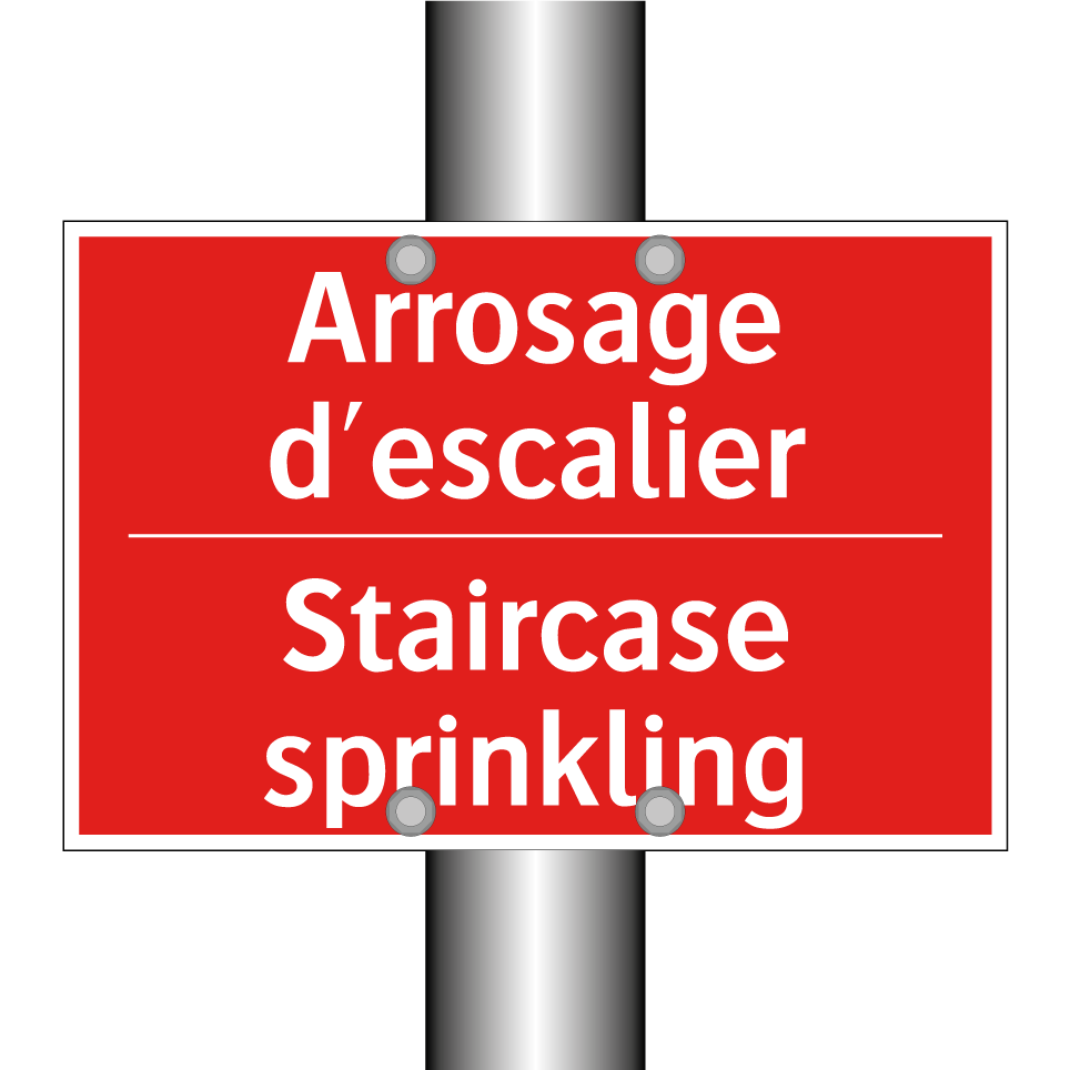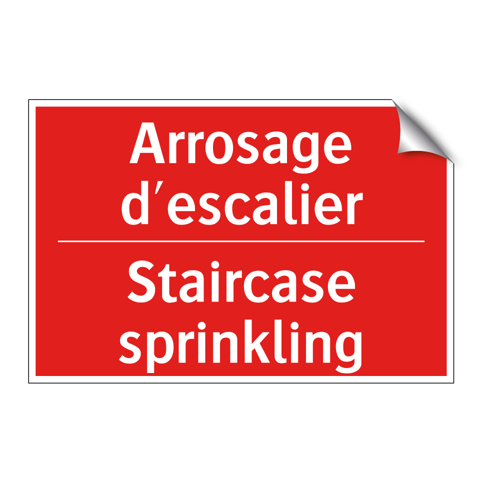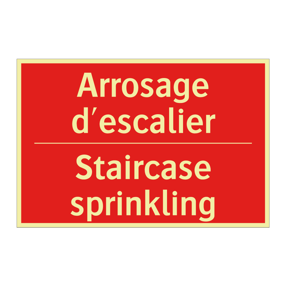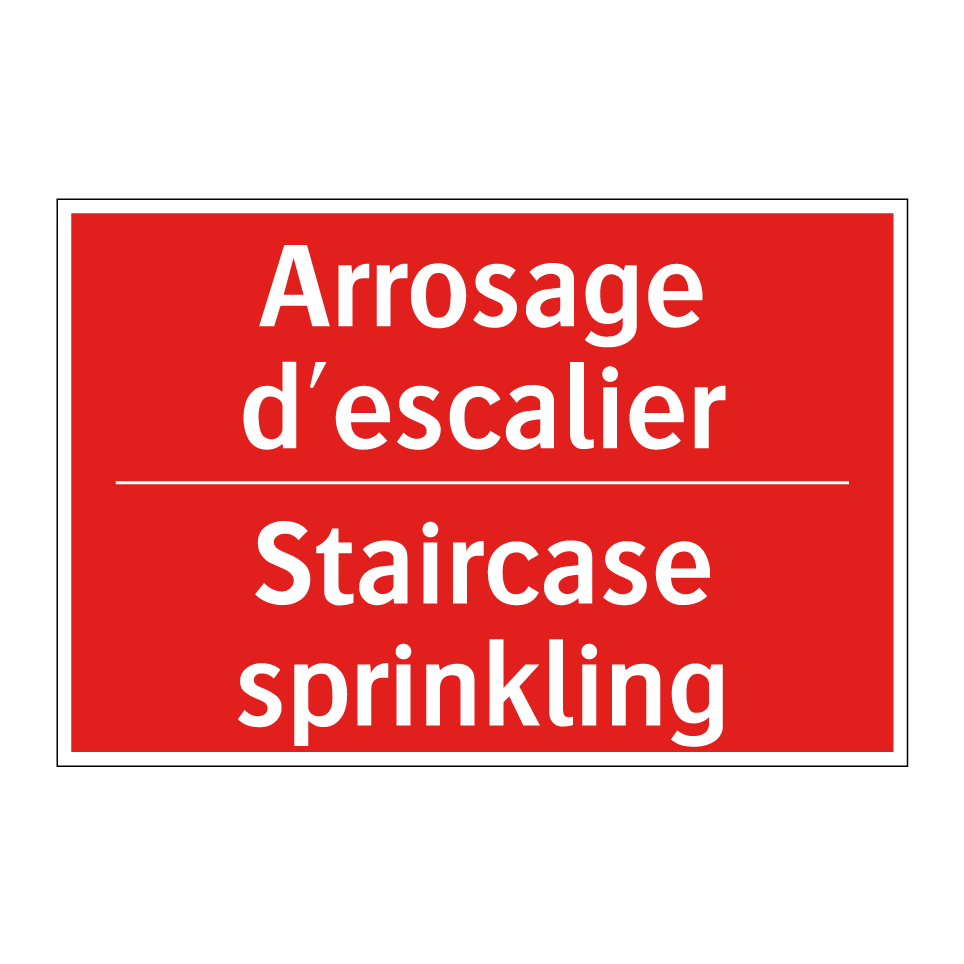 Panneau de signalisation incendie bilingue avec texte en français : "Arrosage d'escalier", et en anglais : "Staircase sprinkling"