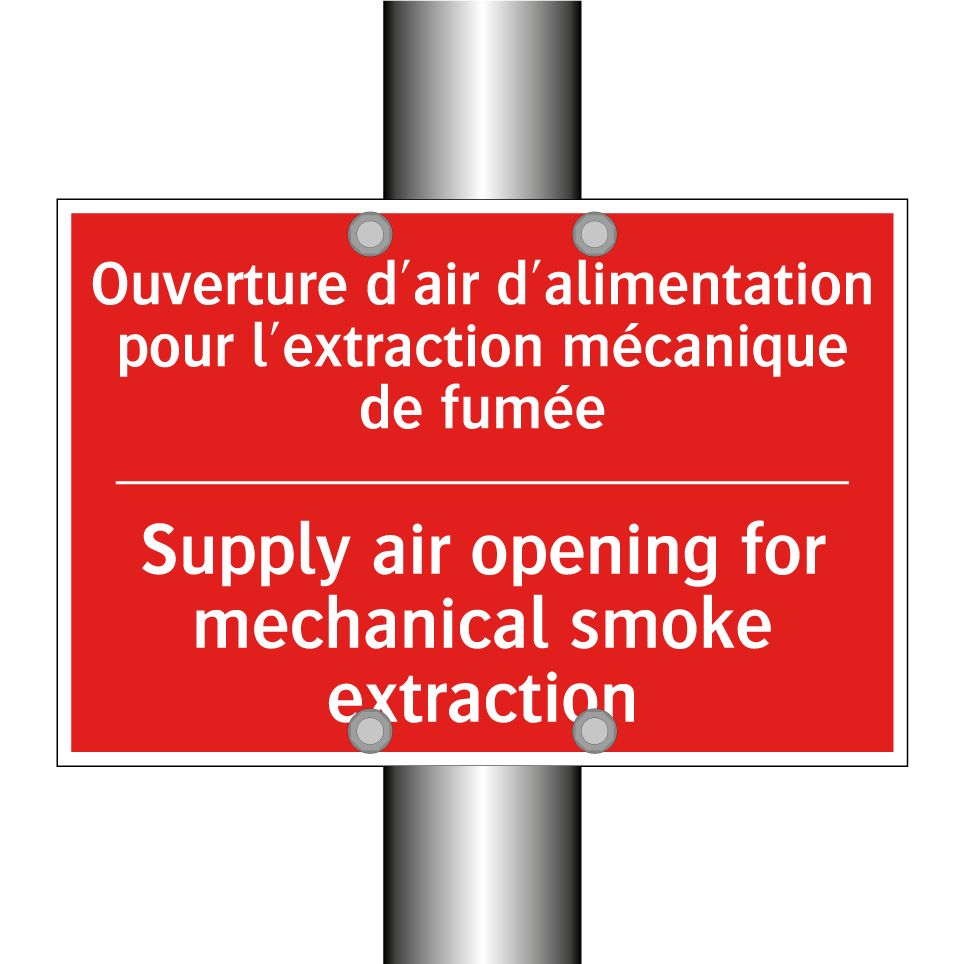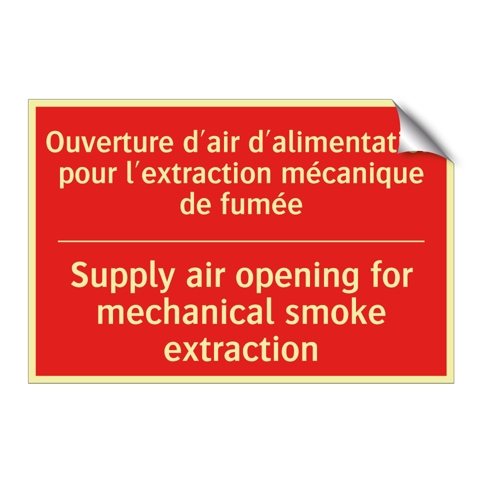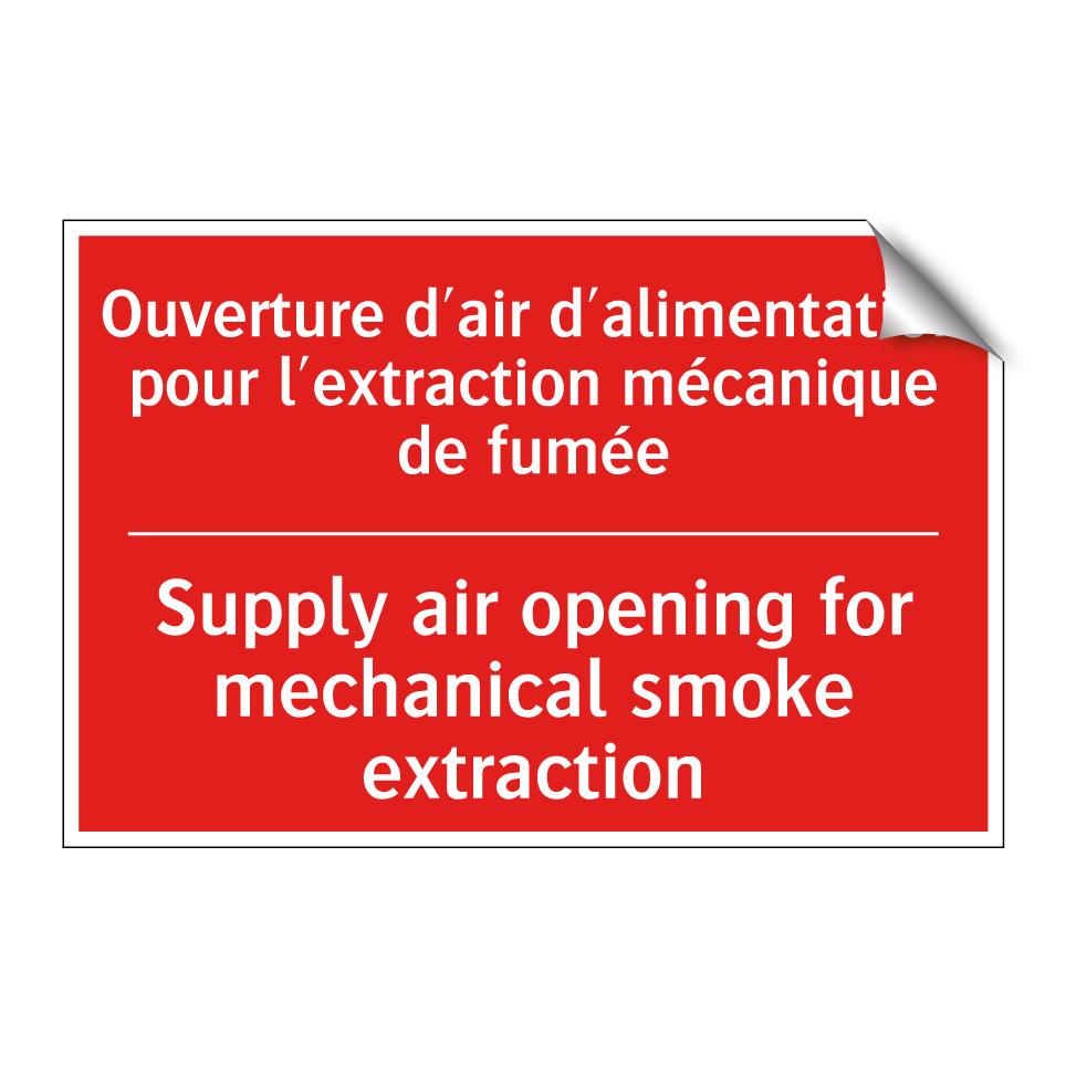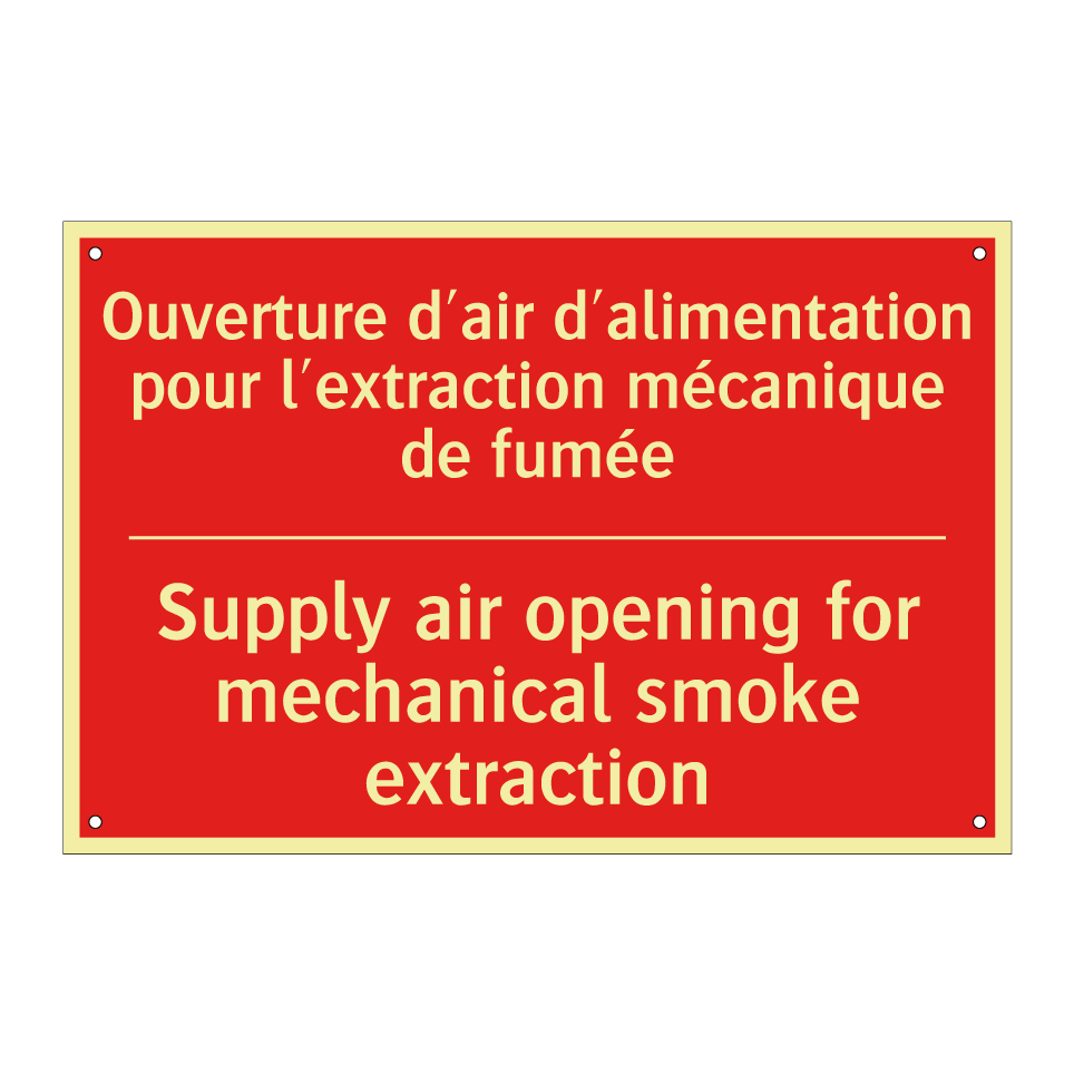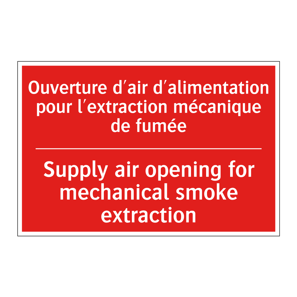 Panneau de signalisation incendie bilingue avec texte en français : "Ouverture d'air d'alimentation pour l'extraction mécanique de fumée", et en anglais : "Supply air opening for mechanical smoke extraction"