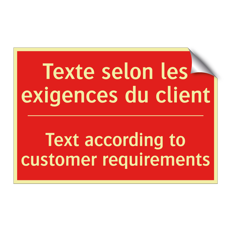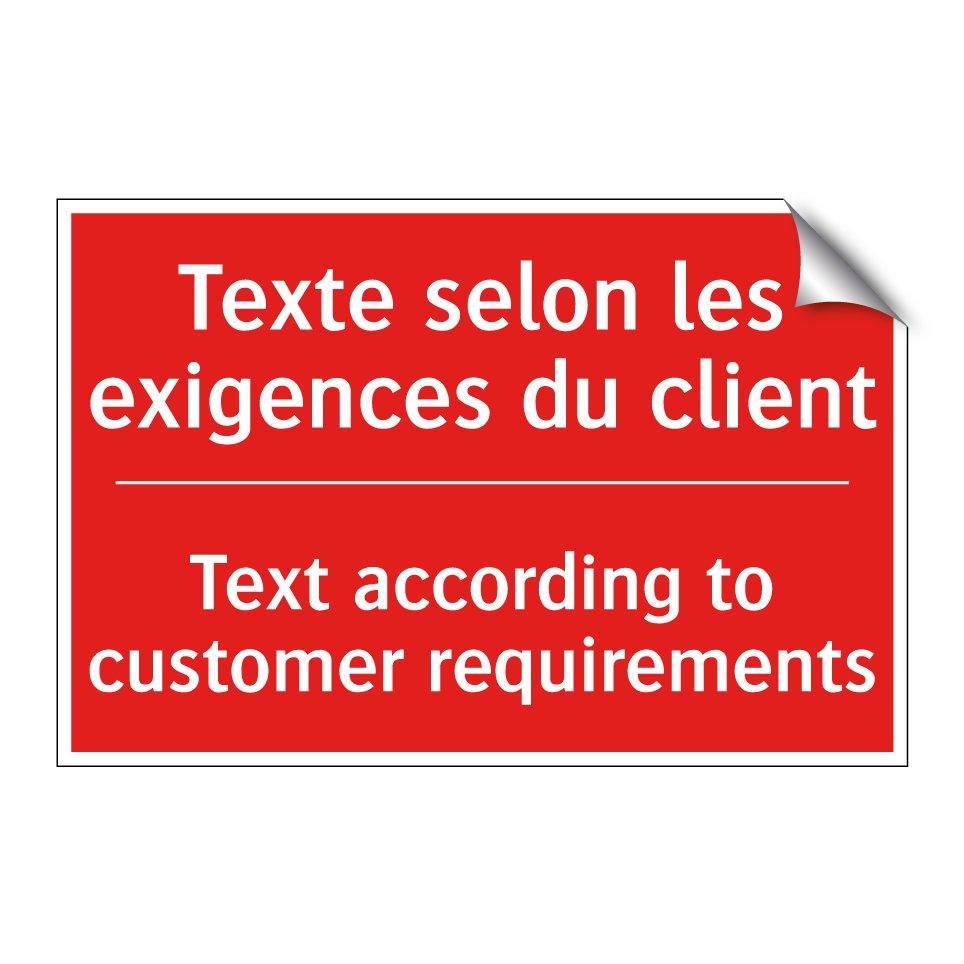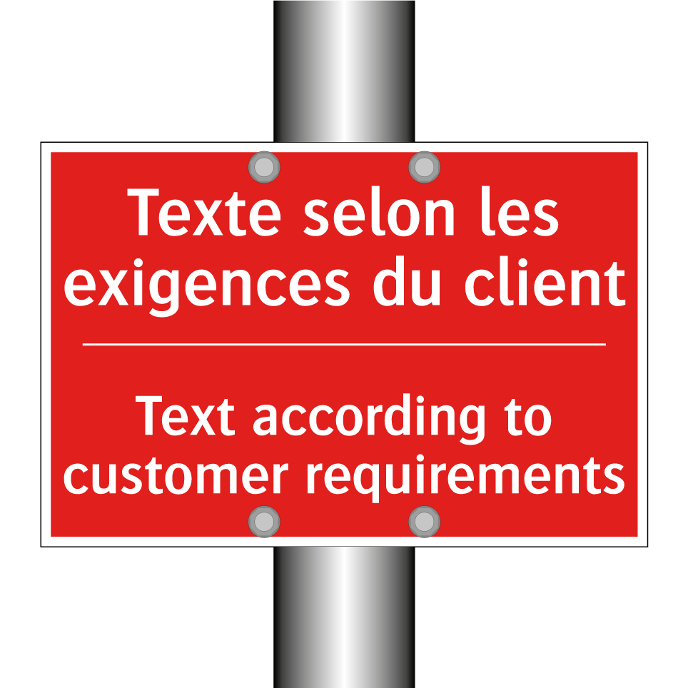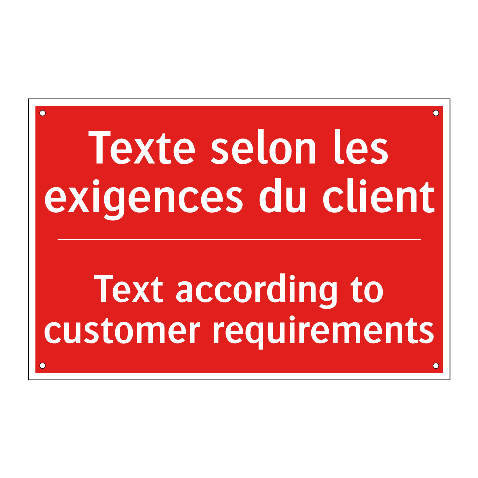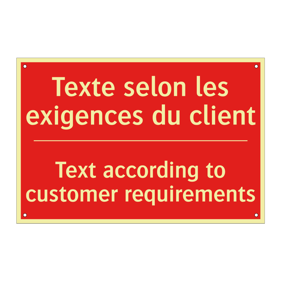 Panneau de signalisation incendie bilingue avec texte en français : "Texte selon les exigences du client", et en anglais : "Text according to customer requirements"