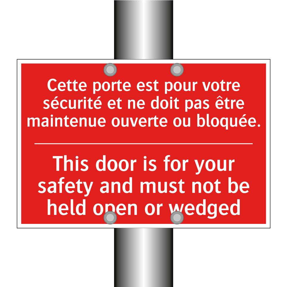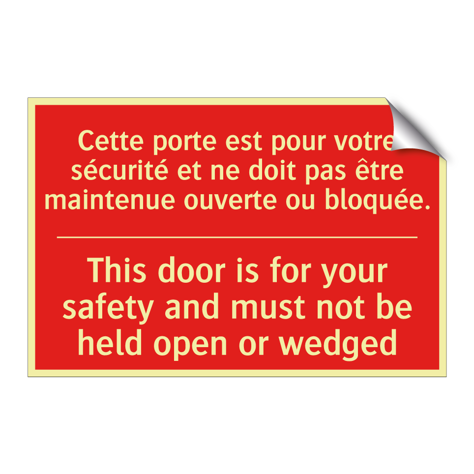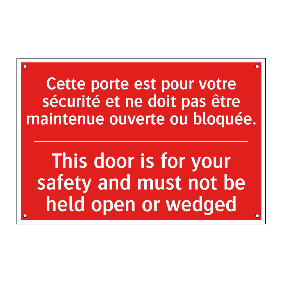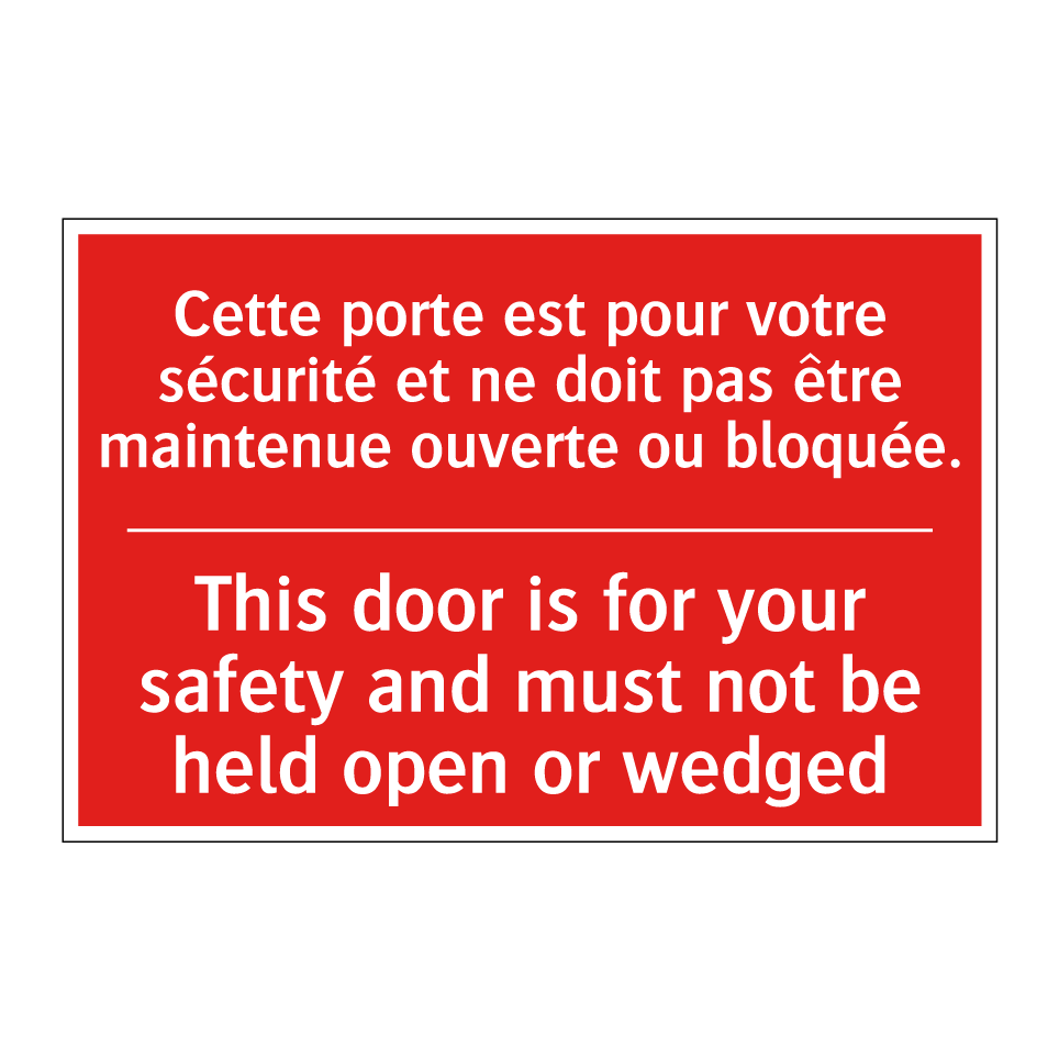 Panneau de signalisation incendie bilingue avec texte en français : "Cette porte est pour votre sécurité et ne doit pas être maintenue ouverte ou bloquée.", et en anglais : "This door is for your safety and must not be held open or wedged"