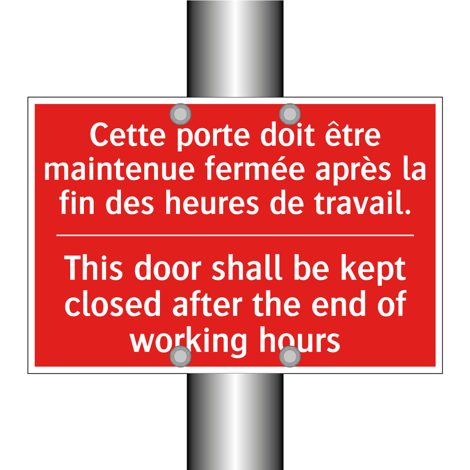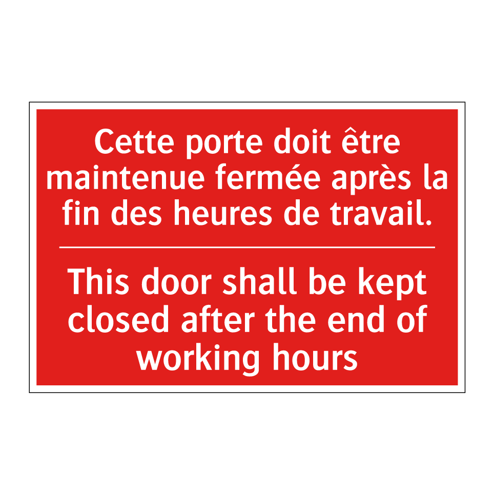 Panneau de signalisation incendie bilingue avec texte en français : "Cette porte doit être maintenue fermée après la fin des heures de travail.", et en anglais : "This door shall be kept closed after the end of working hours"