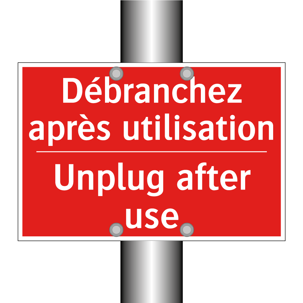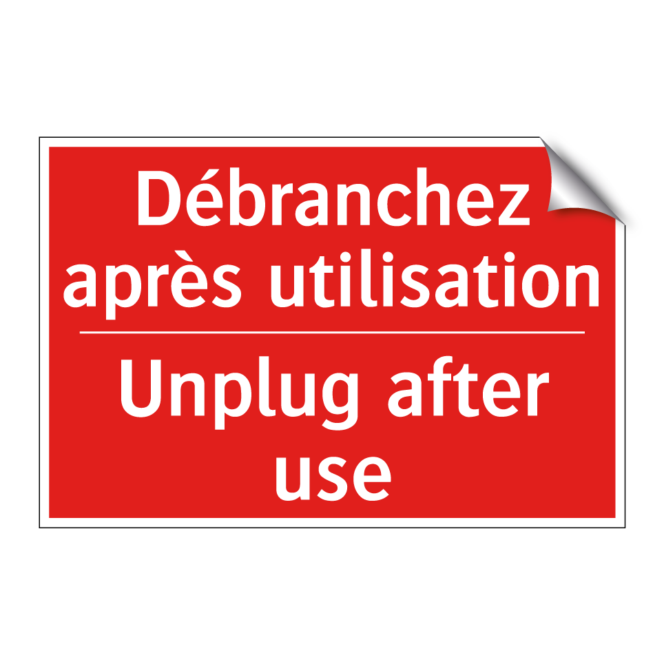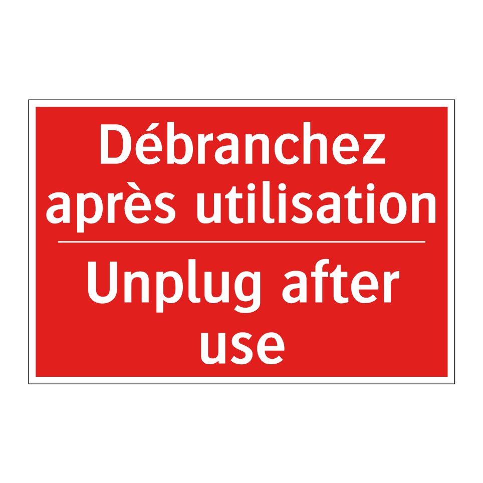 Panneau de signalisation incendie bilingue avec texte en français : "Débranchez après utilisation", et en anglais : "Unplug after use"