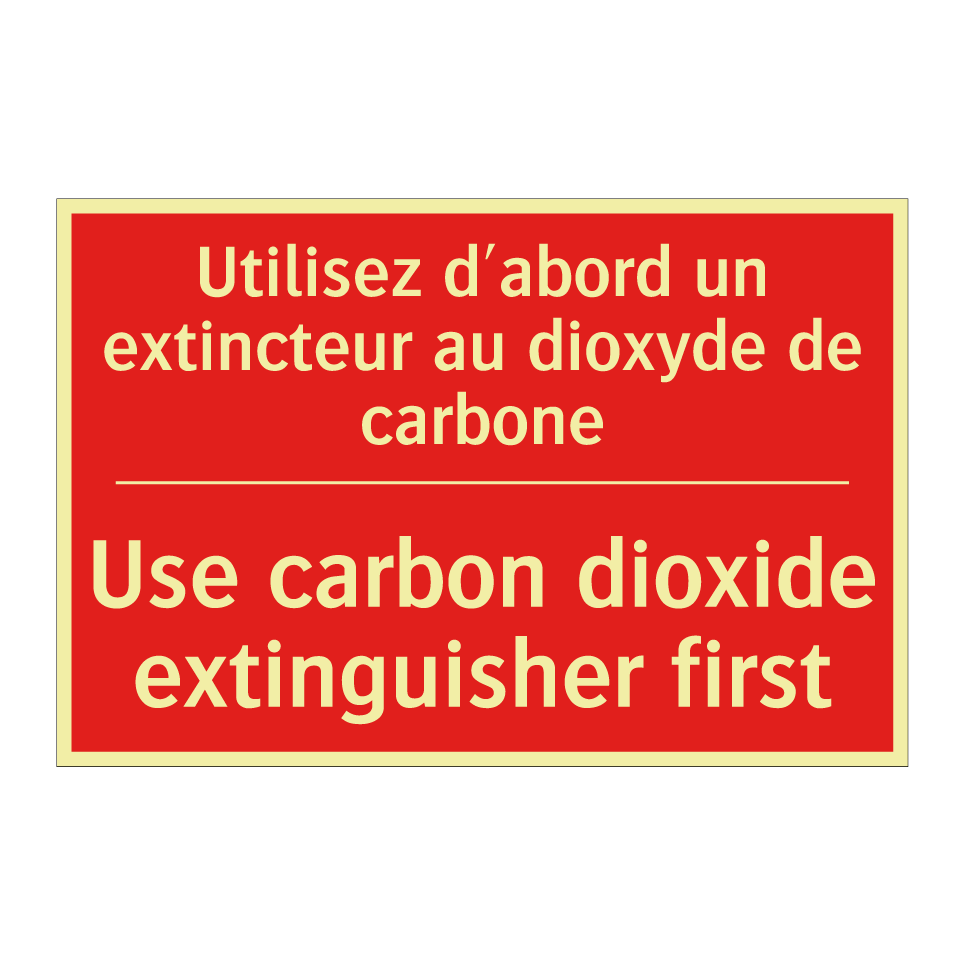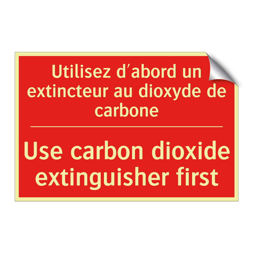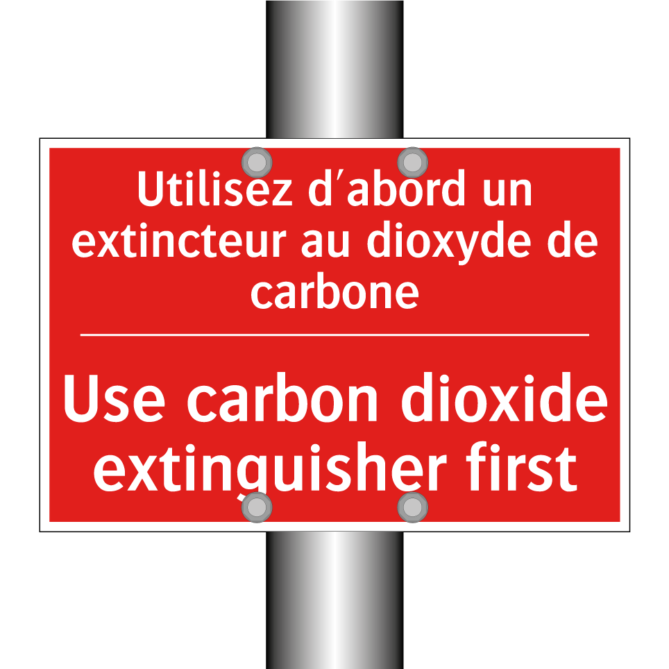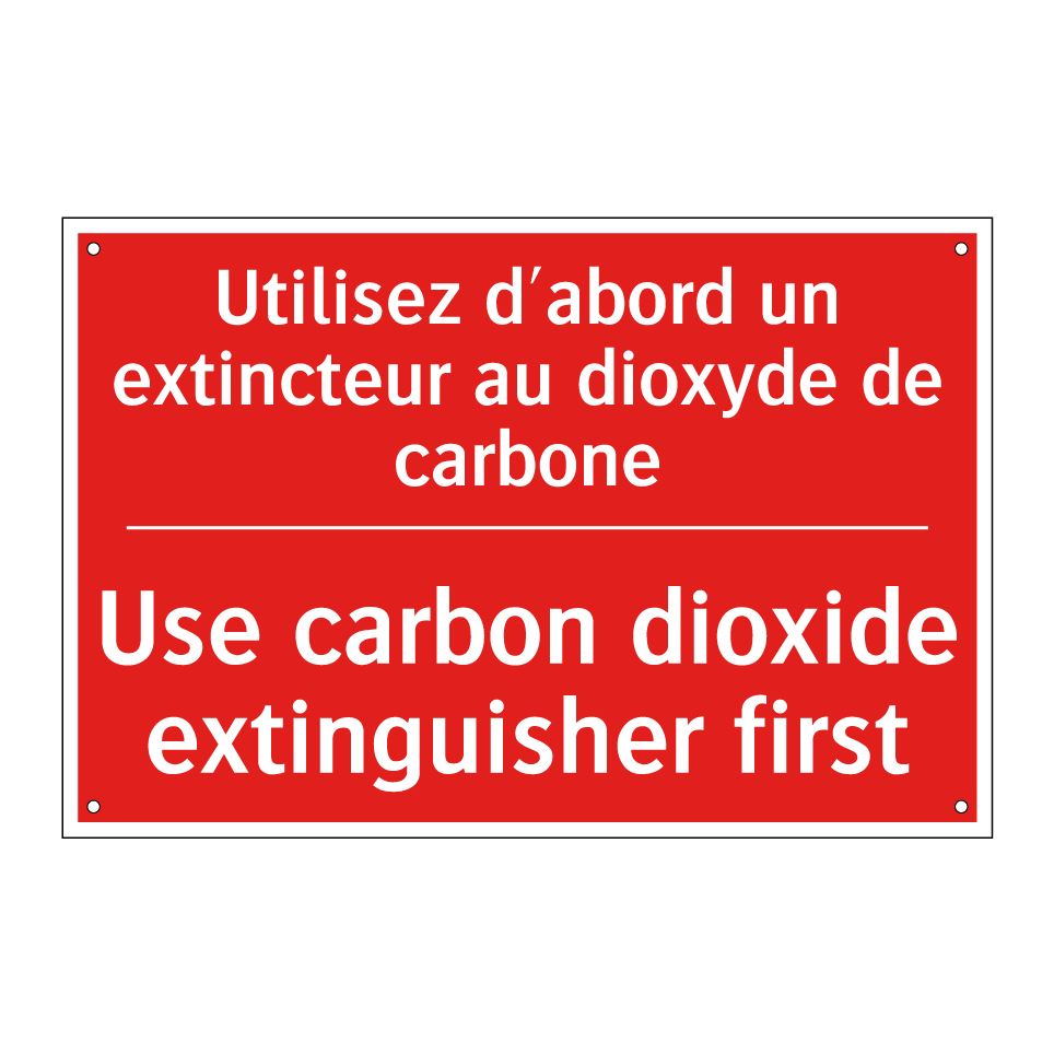 Panneau de signalisation incendie bilingue avec texte en français : "Utilisez d'abord un extincteur au dioxyde de carbone", et en anglais : "Use carbon dioxide extinguisher first"