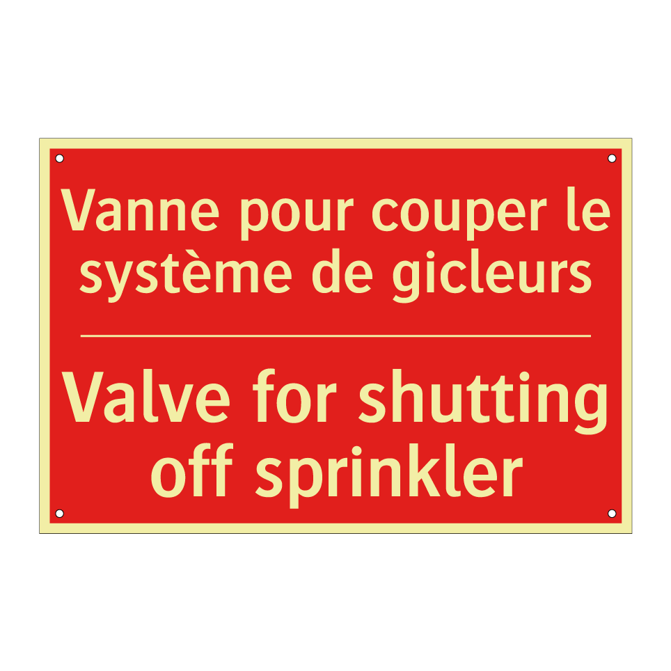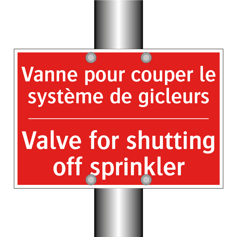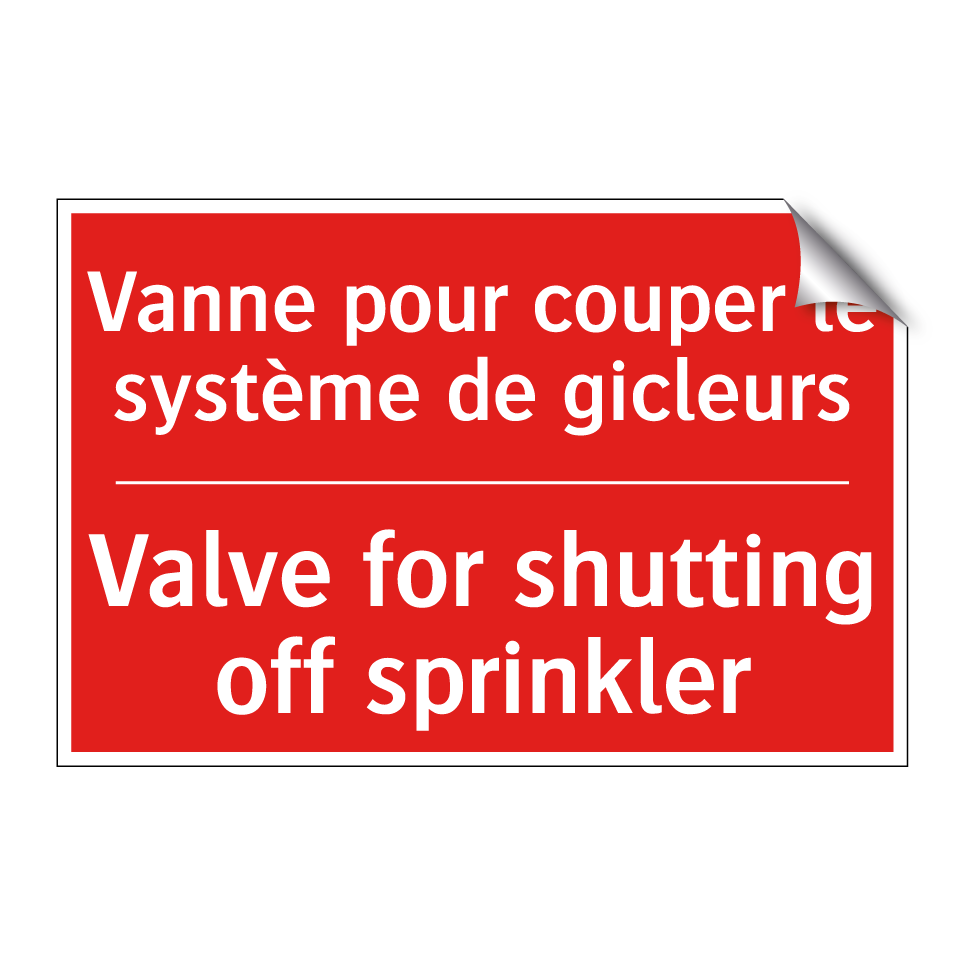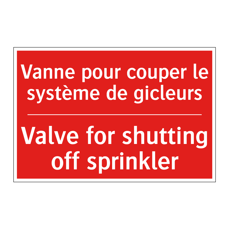 Panneau de signalisation incendie bilingue avec texte en français : "Vanne pour couper le système de gicleurs", et en anglais : "Valve for shutting off sprinkler"