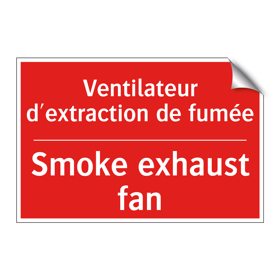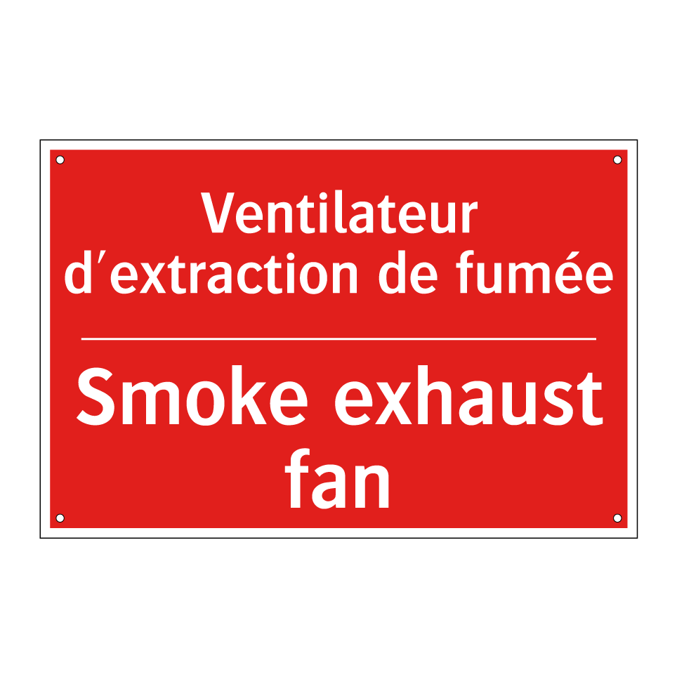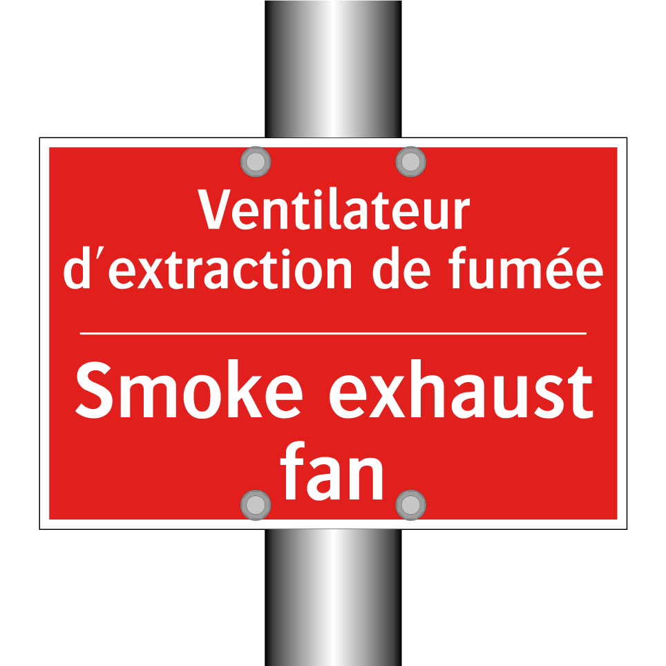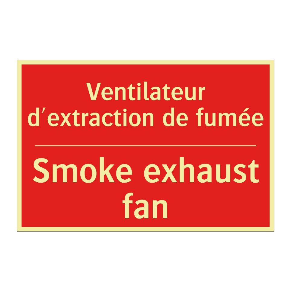 Panneau de signalisation incendie bilingue avec texte en français : "Ventilateur d'extraction de fumée", et en anglais : "Smoke exhaust fan"