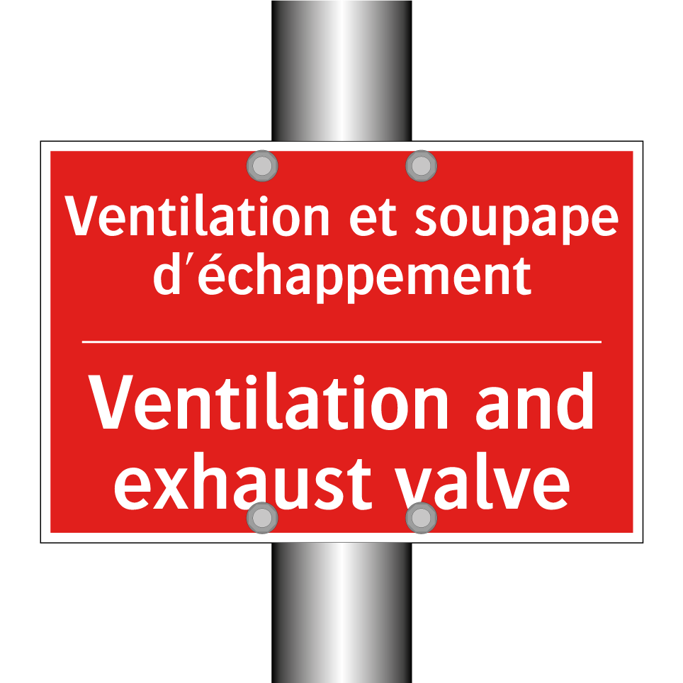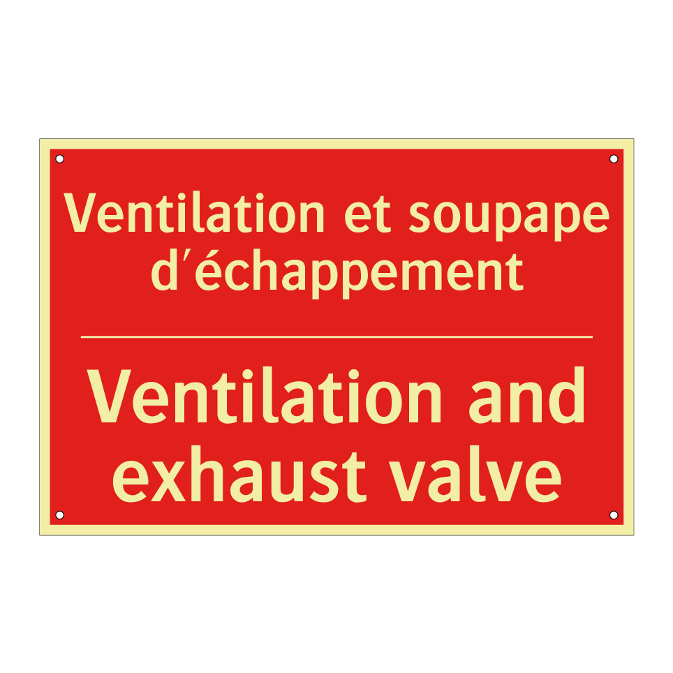 Panneau de signalisation incendie bilingue avec texte en français : "Ventilation et soupape d'échappement", et en anglais : "Ventilation and exhaust valve"