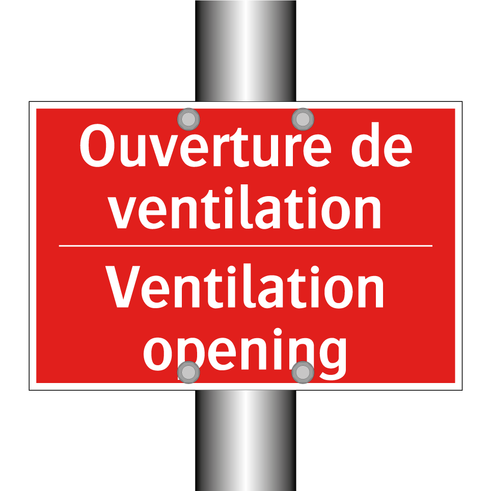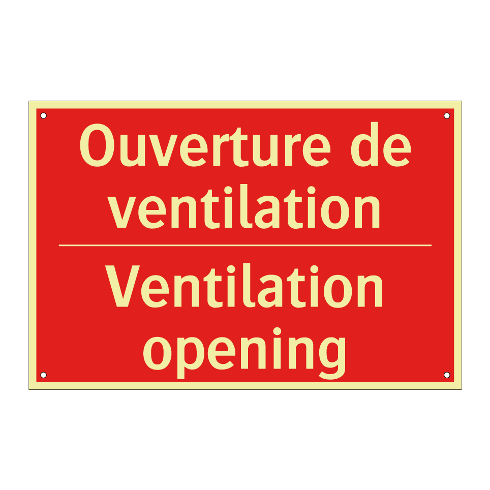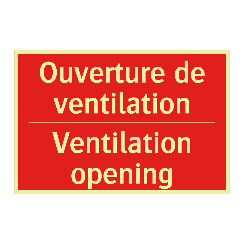 Panneau de signalisation incendie bilingue avec texte en français : "Ouverture de ventilation", et en anglais : "Ventilation opening"