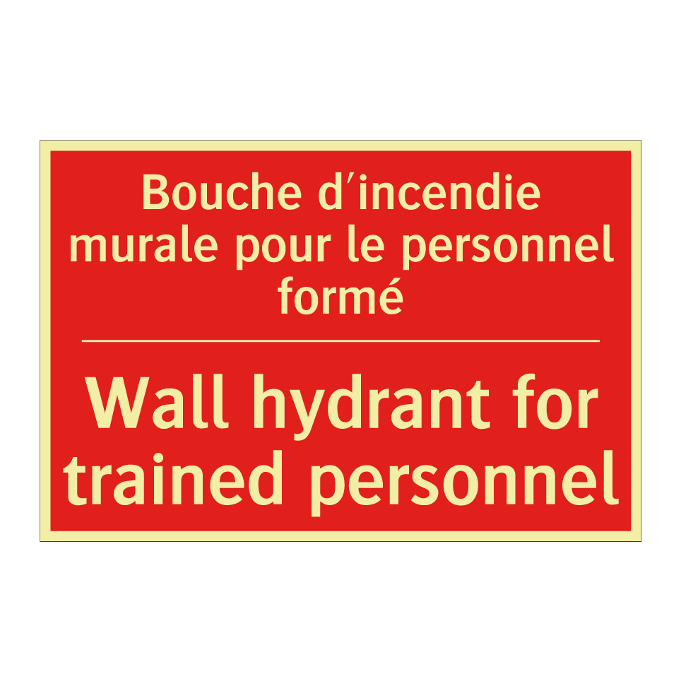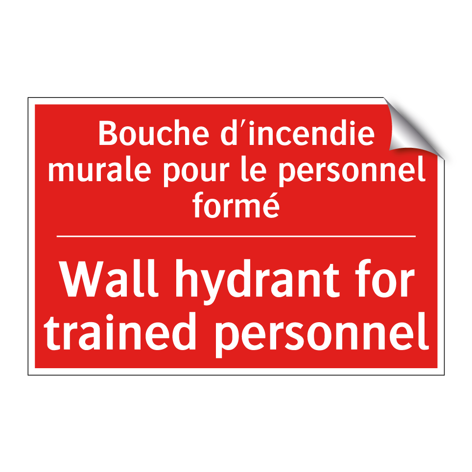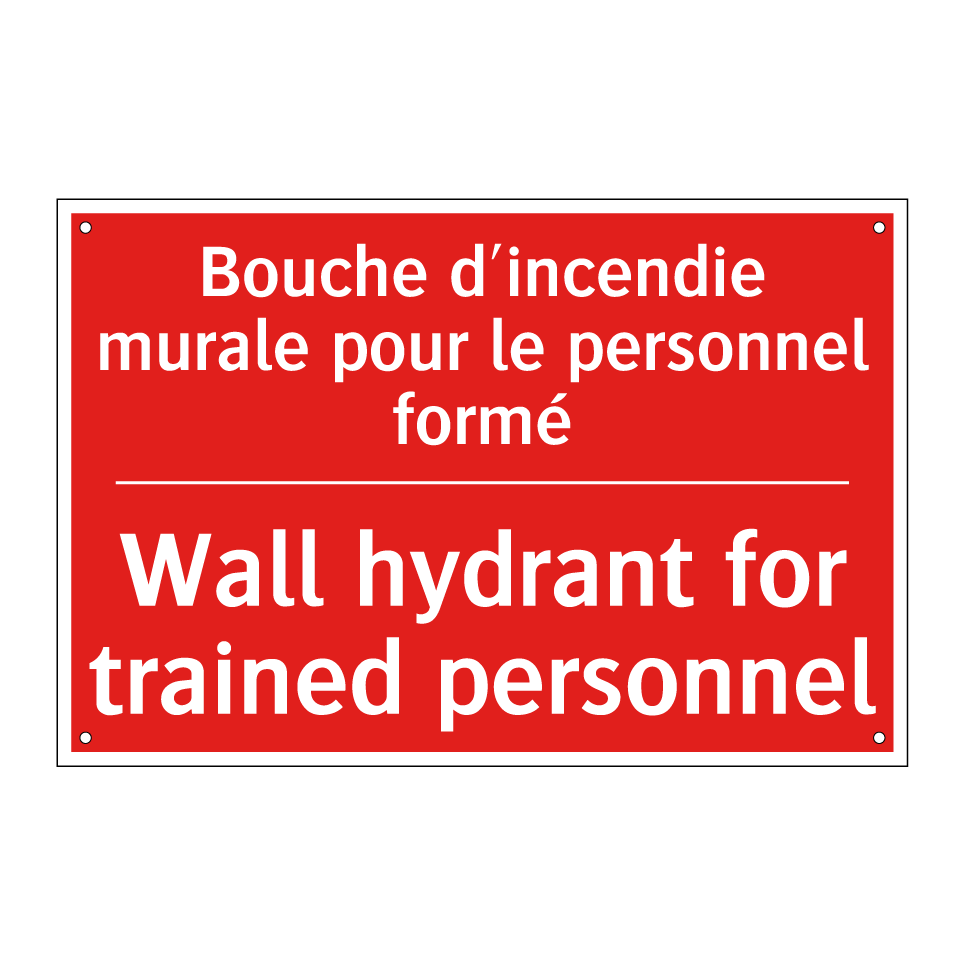 Panneau de signalisation incendie bilingue avec texte en français : "Bouche d'incendie murale pour le personnel formé", et en anglais : "Wall hydrant for trained personnel"