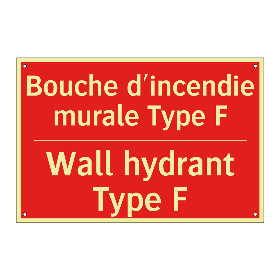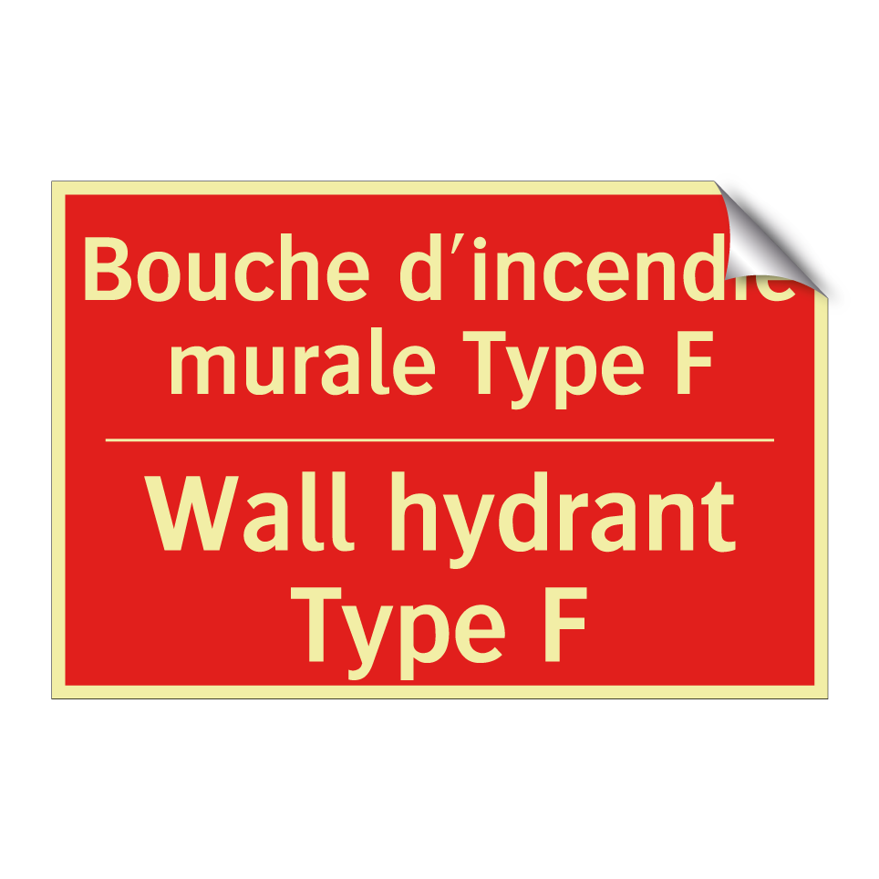 Panneau de signalisation incendie bilingue avec texte en français : "Bouche d'incendie murale Type F", et en anglais : "Wall hydrant Type F"