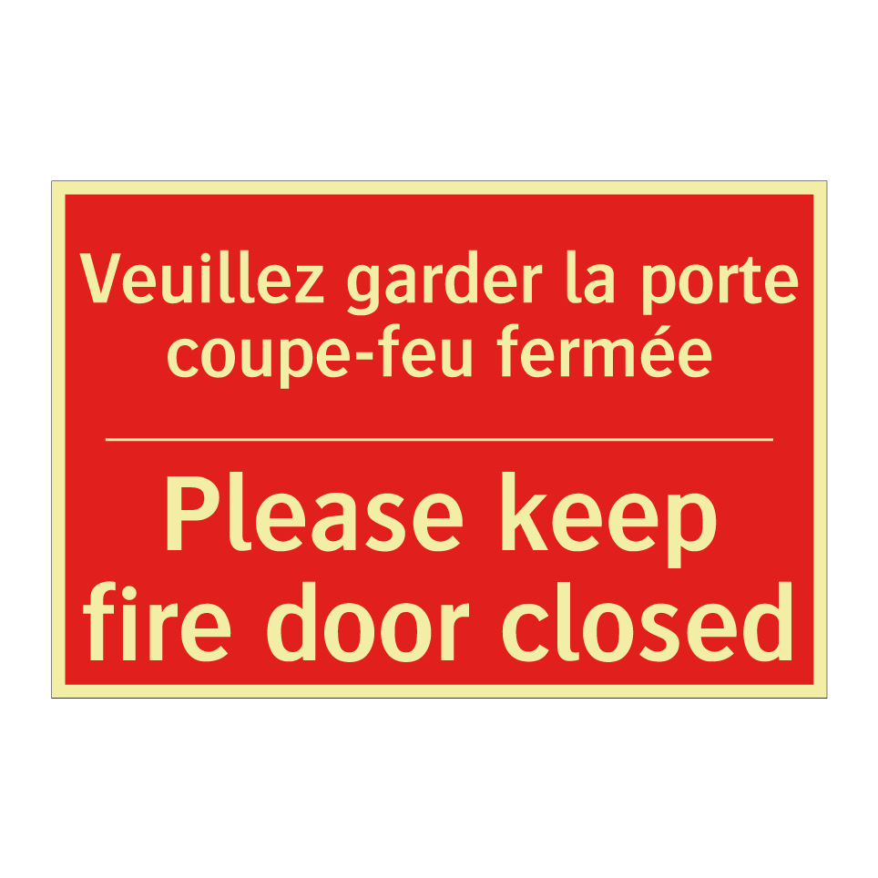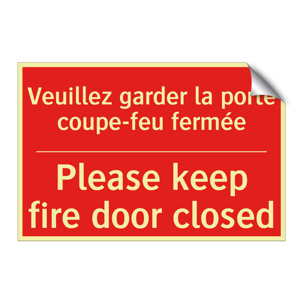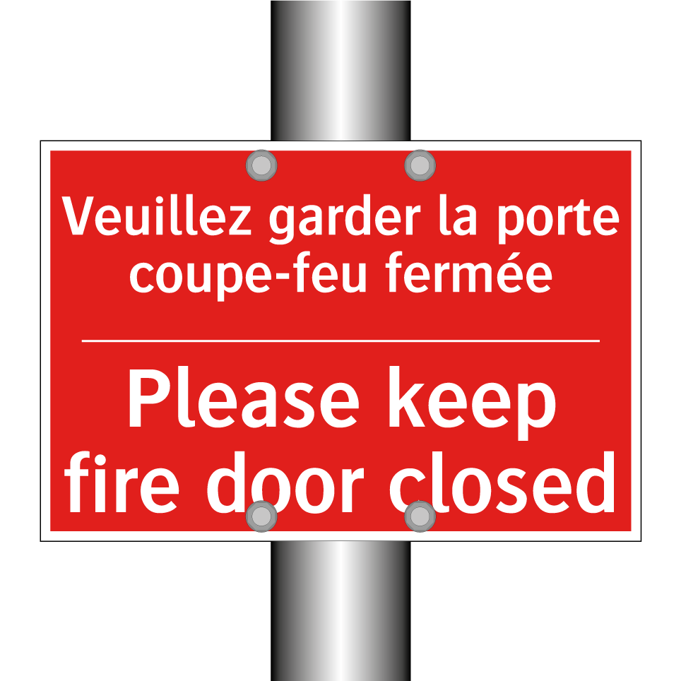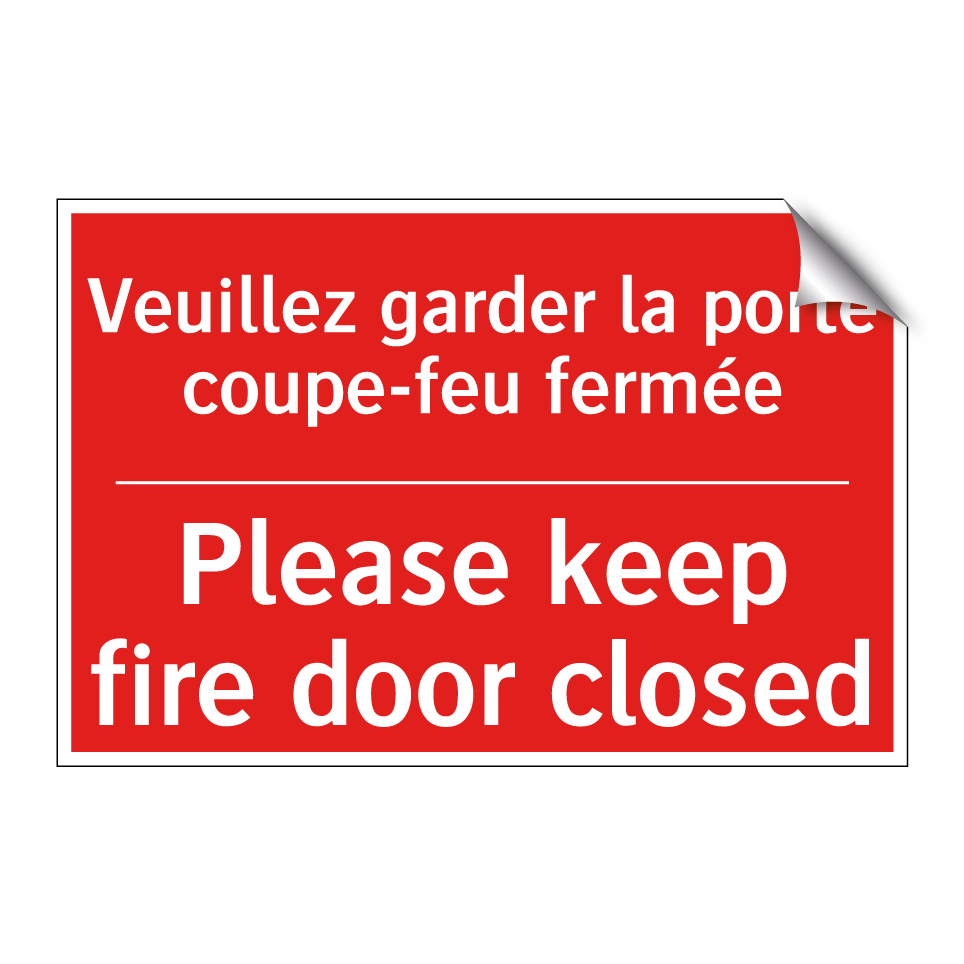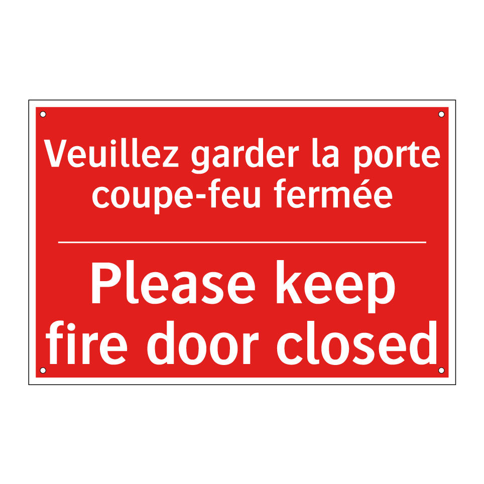 Panneau de signalisation incendie bilingue avec texte en français : "Veuillez garder la porte coupe-feu fermée", et en anglais : "Please keep fire door closed"
