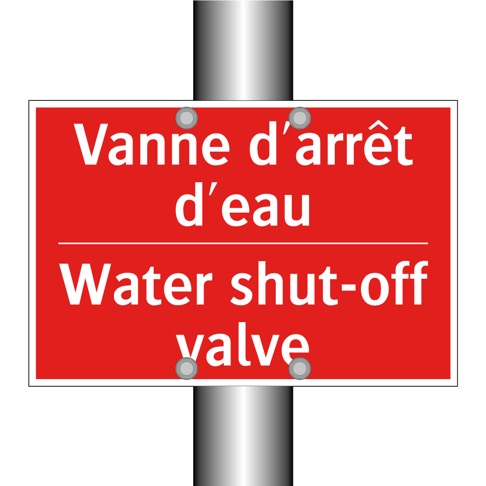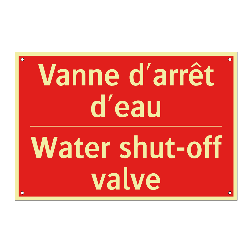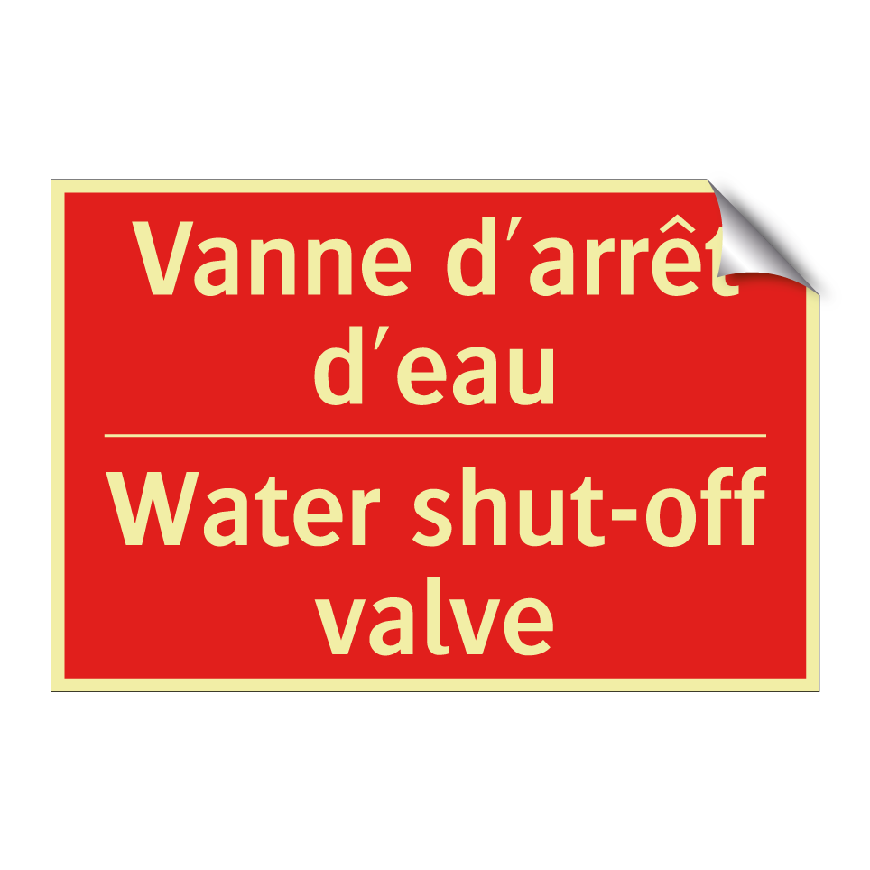 Panneau de signalisation incendie bilingue avec texte en français : "Vanne d'arrêt d'eau", et en anglais : "Water shut-off valve"