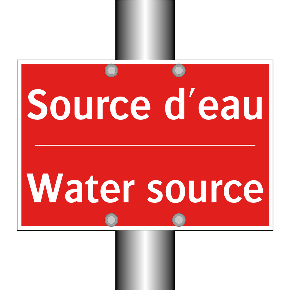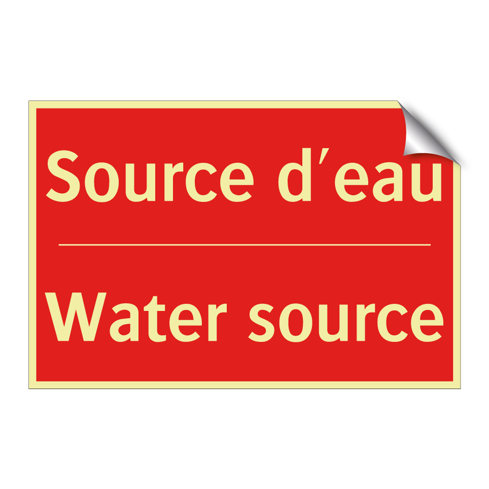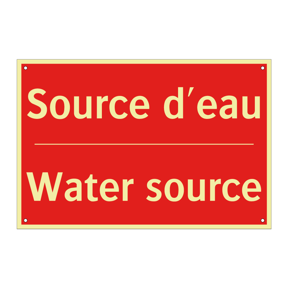 Panneau de signalisation incendie bilingue avec texte en français : "Source d'eau", et en anglais : "Water source"