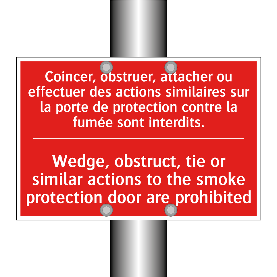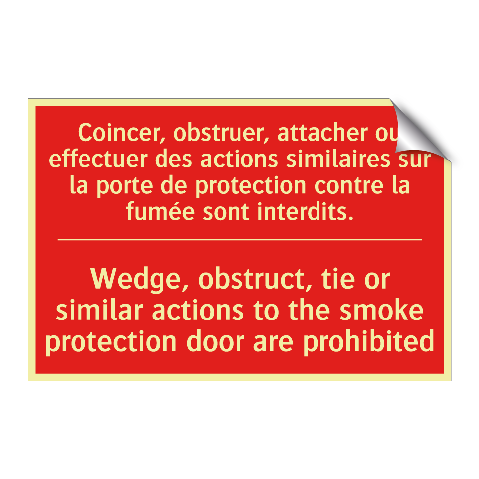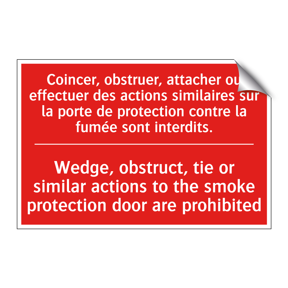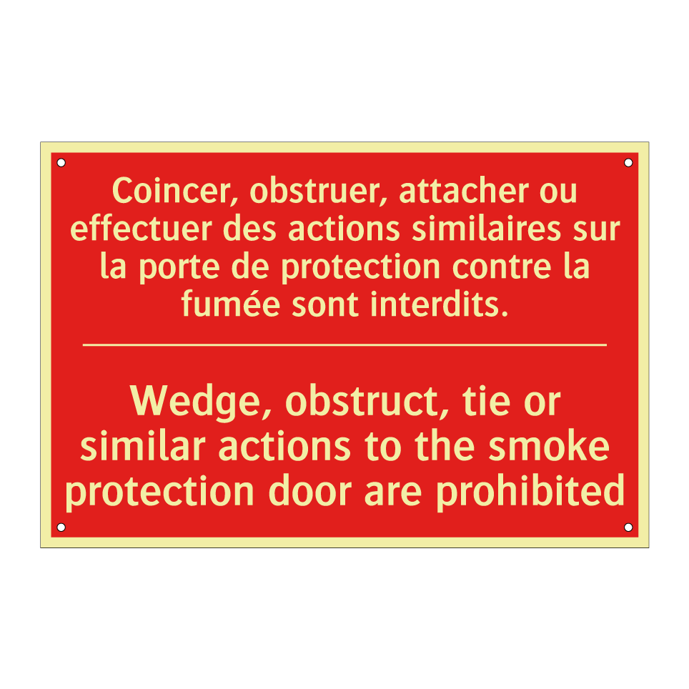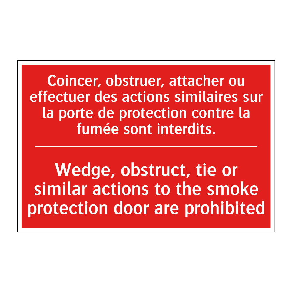 Panneau de signalisation incendie bilingue avec texte en français : "Coincer, obstruer, attacher ou effectuer des actions similaires sur la porte de protection contre la fumée sont interdits.", et en anglais : "Wedge, obstruct, tie or similar actions to the smoke protection door are prohibited"