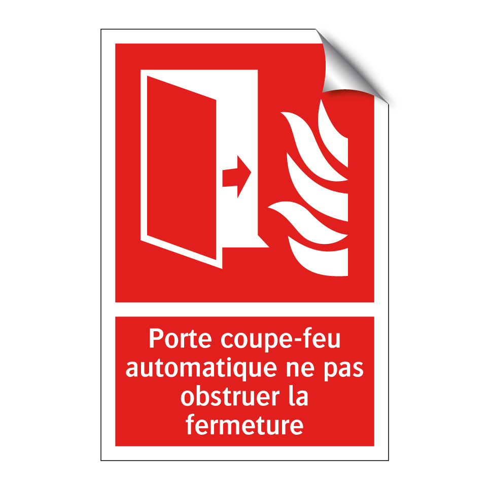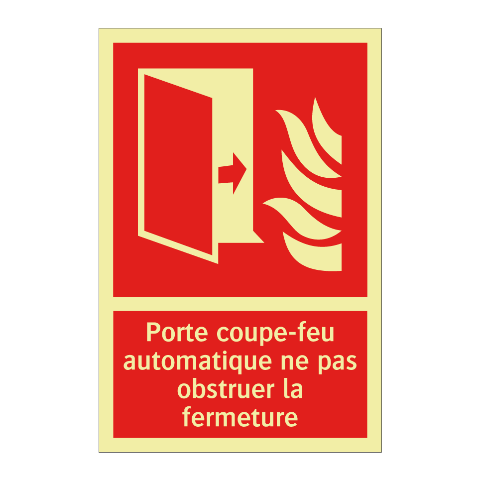 Panneau incendie avec le texte Porte coupe-feu automatique ne pas obstruer la fermeture et une symbolique claire