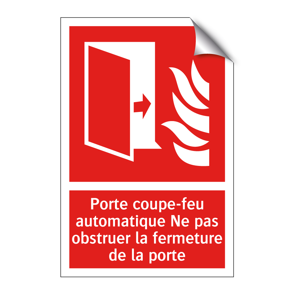 Panneau incendie avec le texte Porte coupe-feu automatique Ne pas obstruer la fermeture de la porte et une symbolique claire