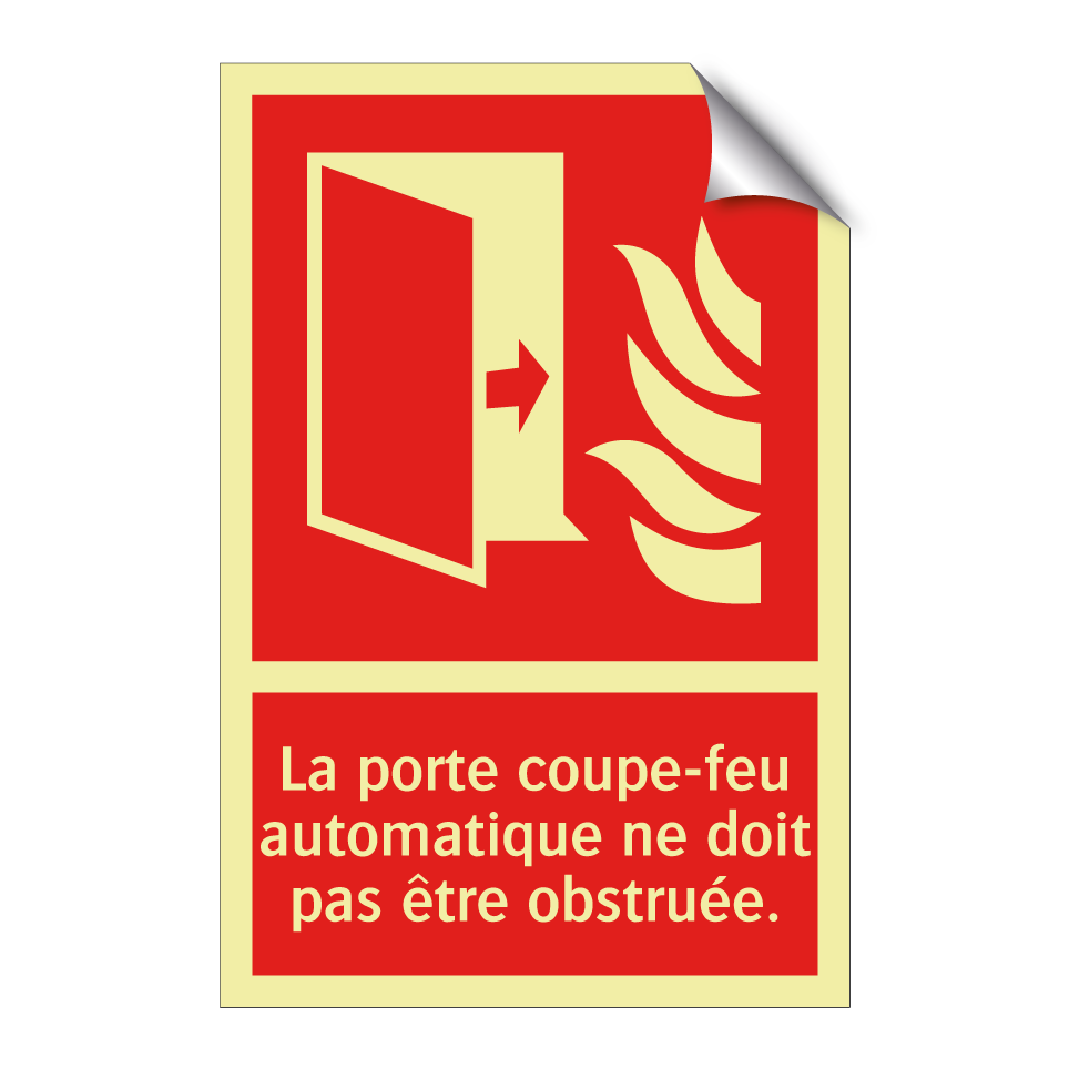 Panneau incendie avec le texte La porte coupe-feu automatique ne doit pas être obstruée. et une symbolique claire