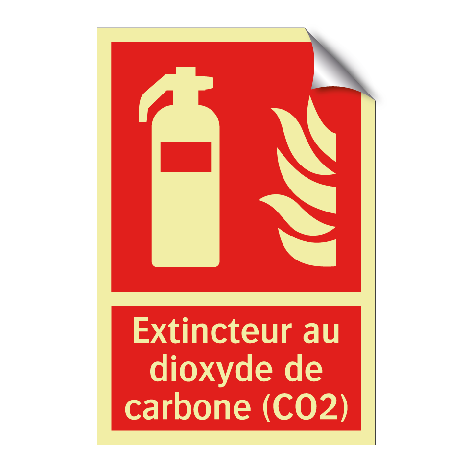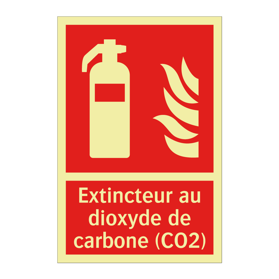 Panneau incendie avec le texte Extincteur au dioxyde de carbone (CO2) et une symbolique claire
