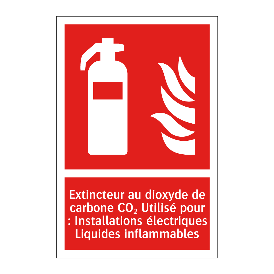 Panneau incendie avec le texte Extincteur au dioxyde de carbone CO₂ Utilisé pour : Installations électriques Liquides inflammables et une symbolique claire