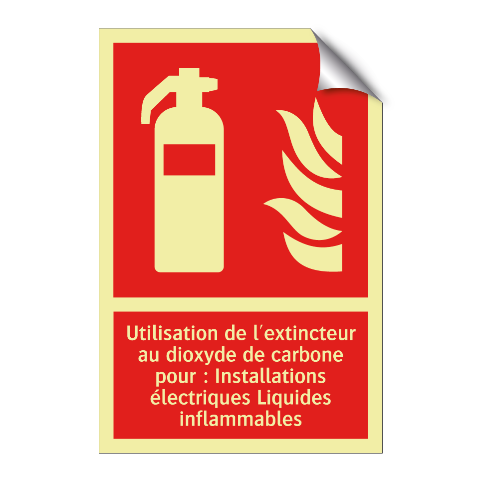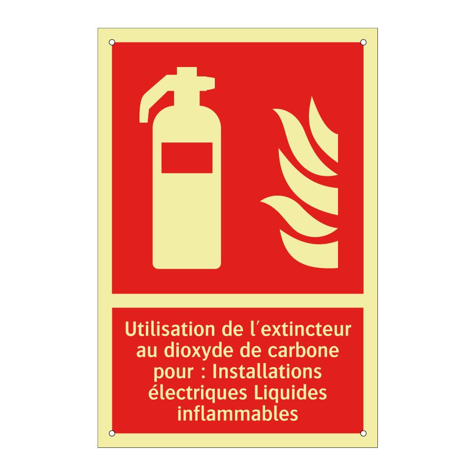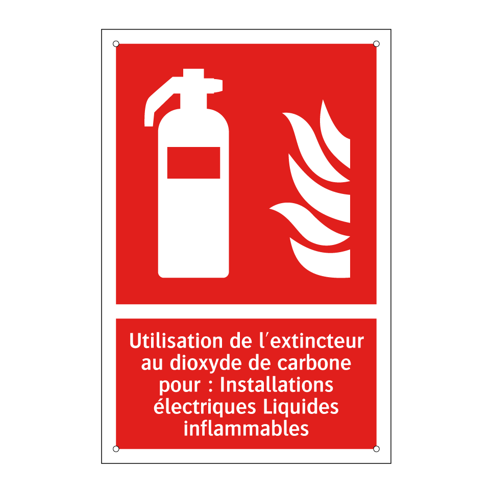 Panneau incendie avec le texte Utilisation de l'extincteur au dioxyde de carbone pour : Installations électriques Liquides inflammables et une symbolique claire
