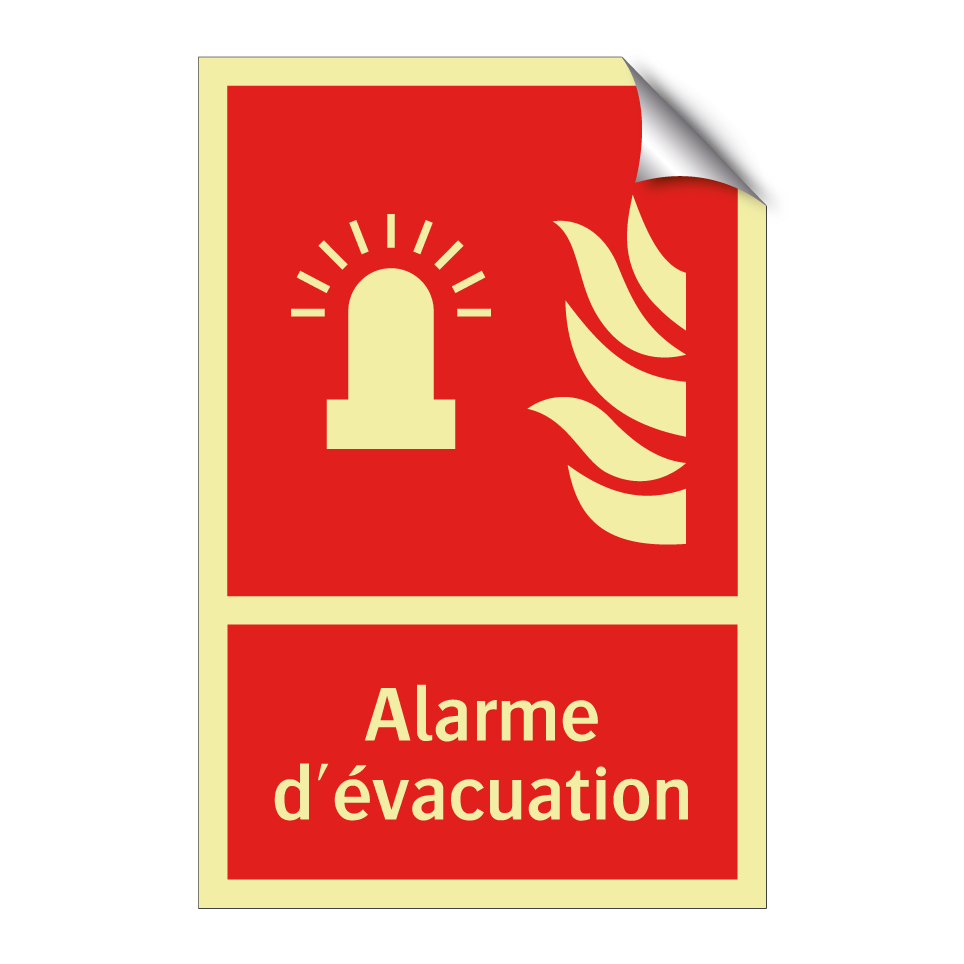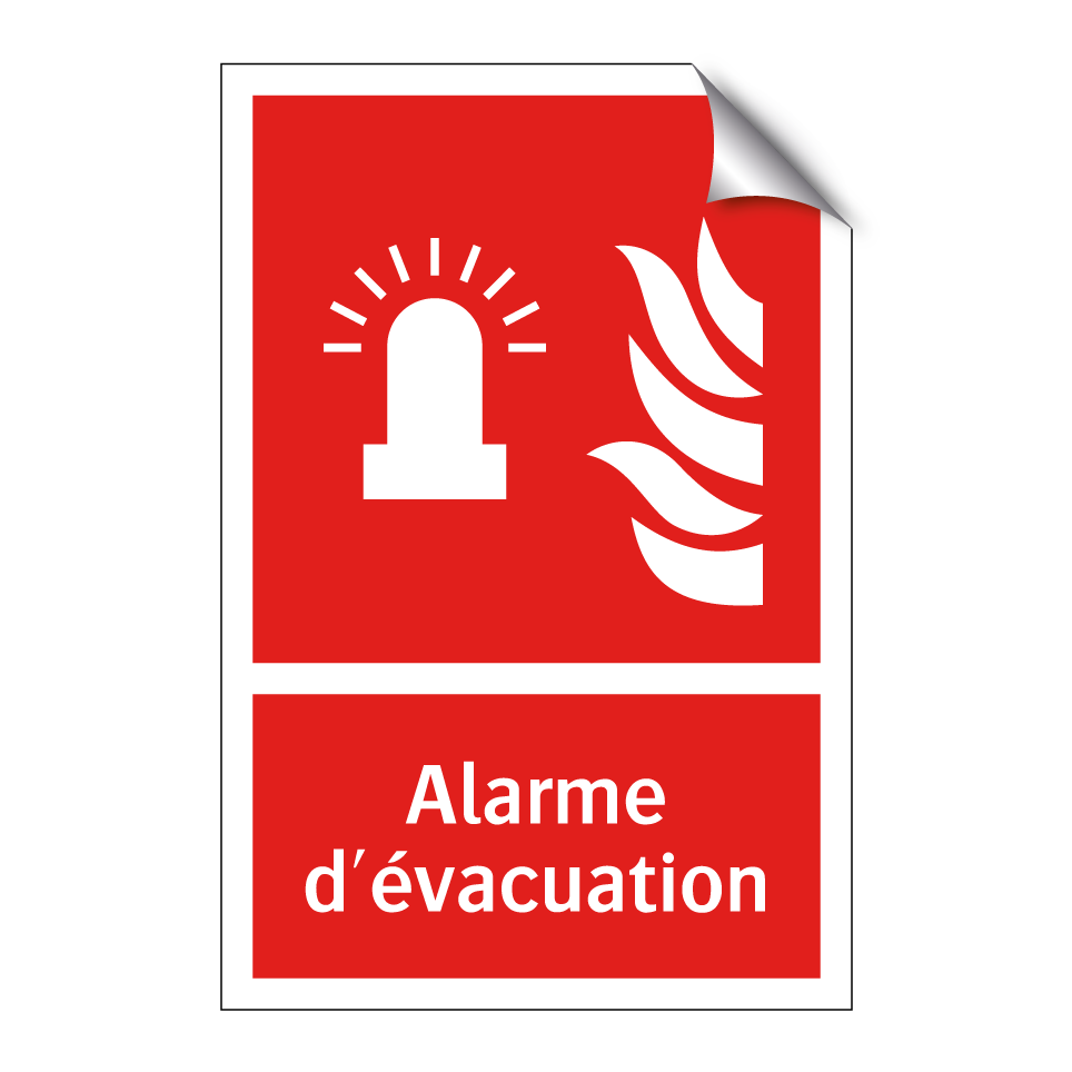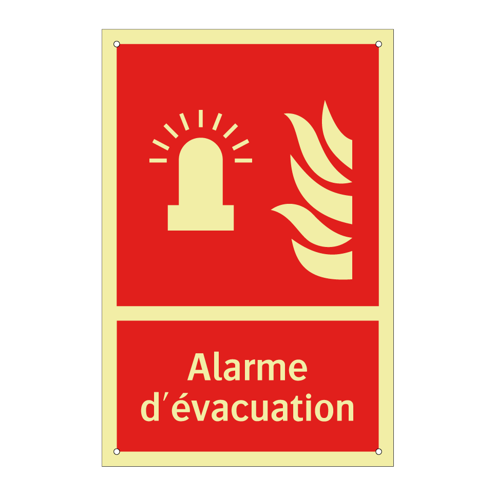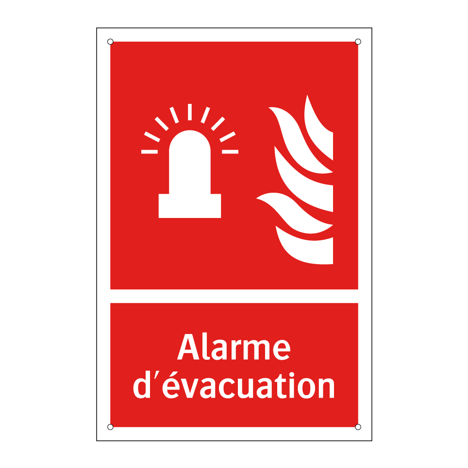 Panneau incendie avec le texte Alarme d'évacuation et une symbolique claire