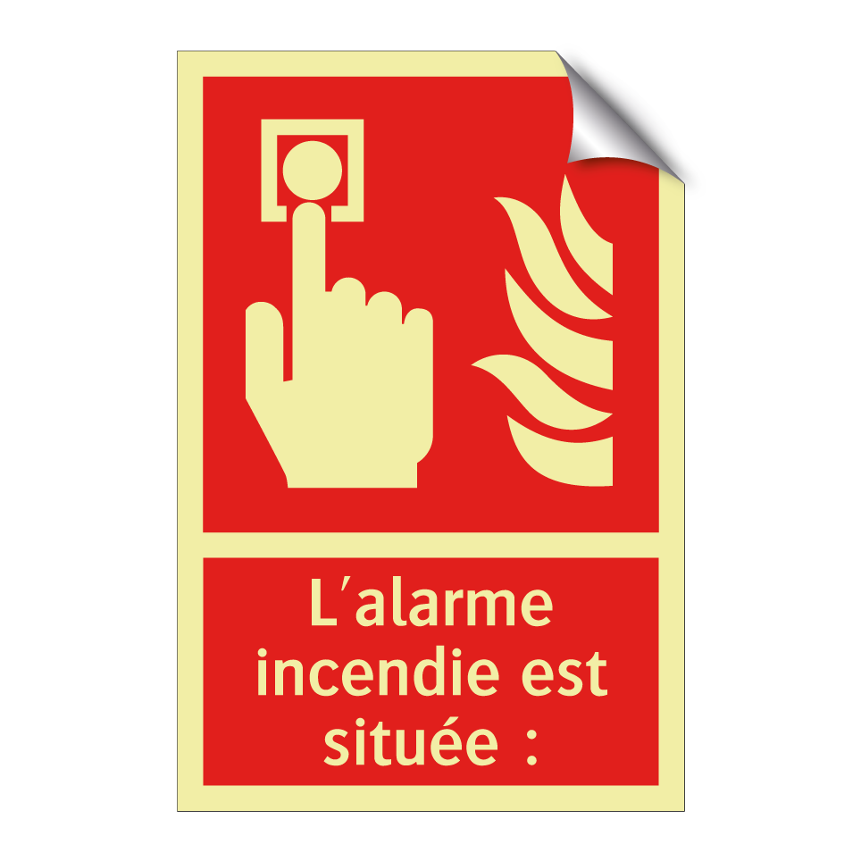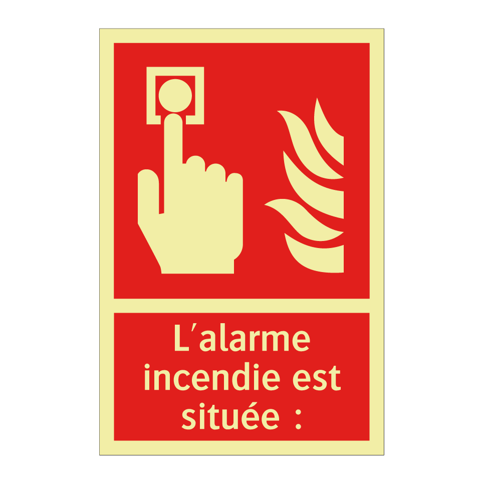 Panneau incendie avec le texte L'alarme incendie est située : et une symbolique claire