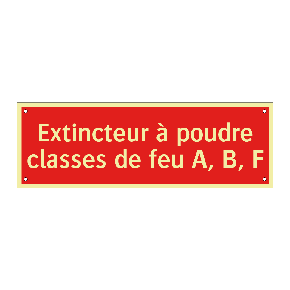 Panneau de signalisation incendie avec le texte Extincteur à poudre classes de feu A, B, F