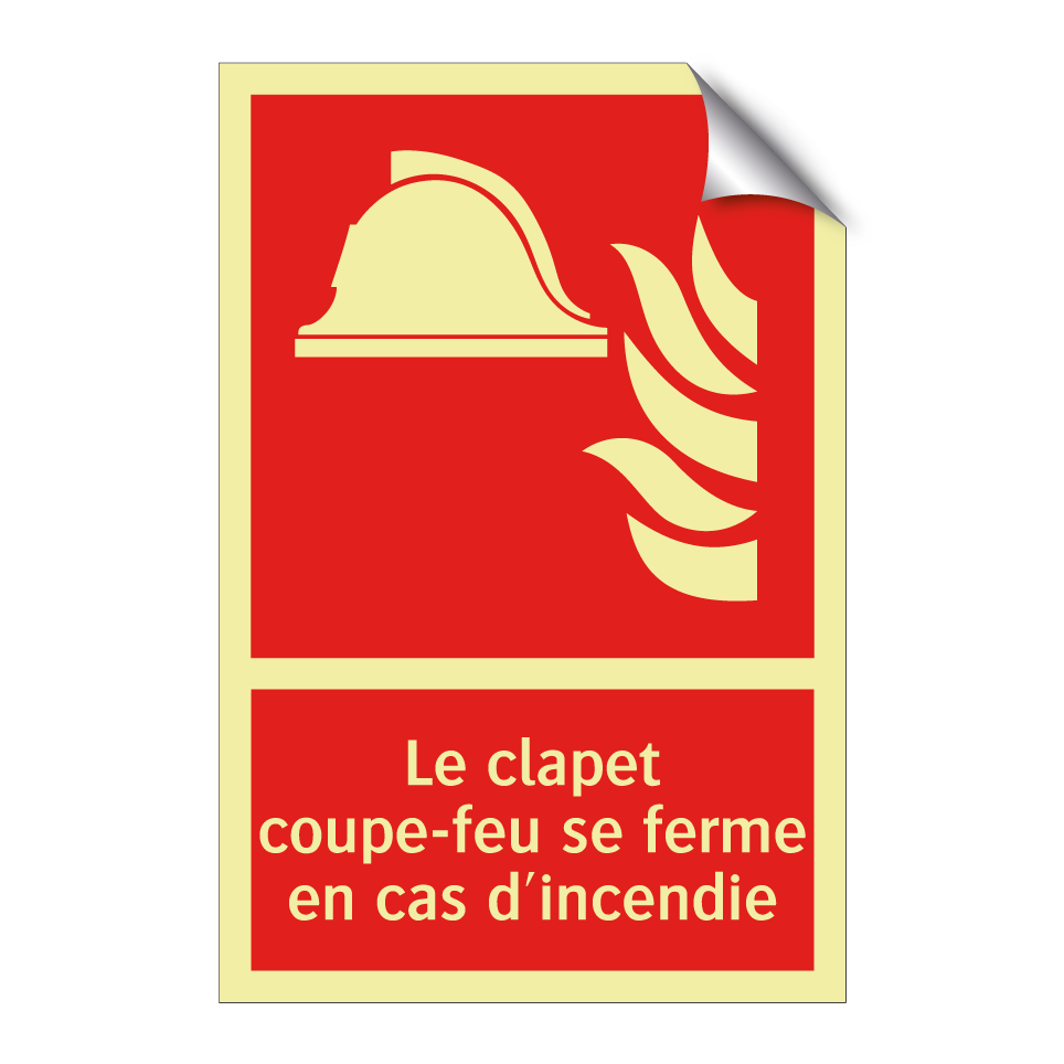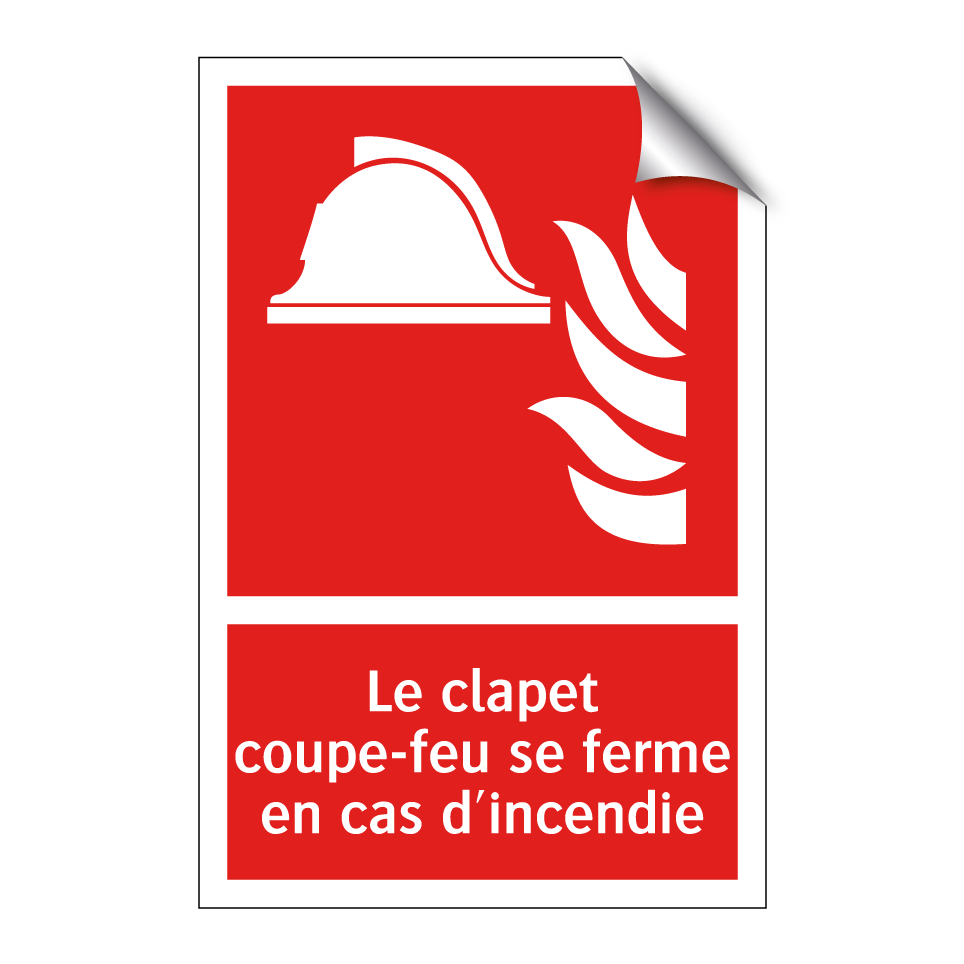 Panneau incendie avec le texte Le clapet coupe-feu se ferme en cas d'incendie et une symbolique claire