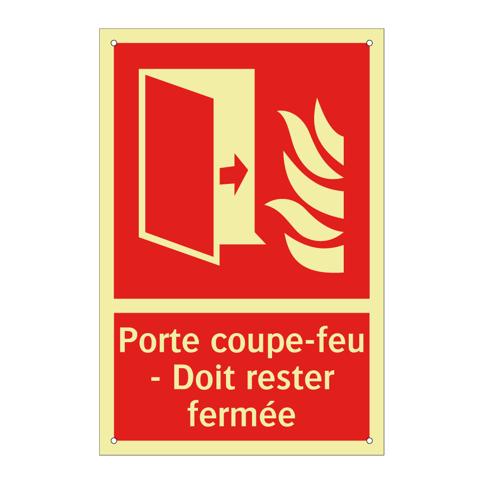 Panneau incendie avec le texte Porte coupe-feu - Doit rester fermée et une symbolique claire