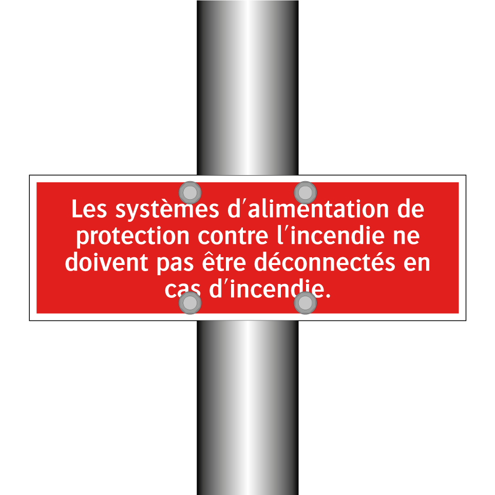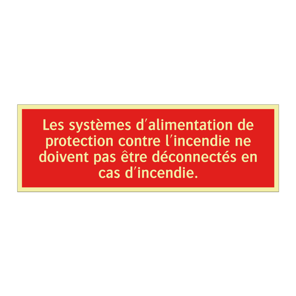 Panneau de signalisation incendie avec le texte Les systèmes d'alimentation de protection contre l'incendie ne doivent pas être déconnectés en cas d'incendie.