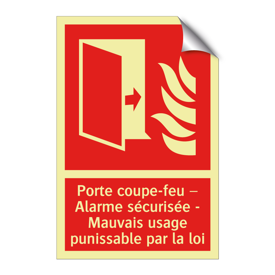 Panneau incendie avec le texte Porte coupe-feu – Alarme sécurisée - Mauvais usage punissable par la loi et une symbolique claire